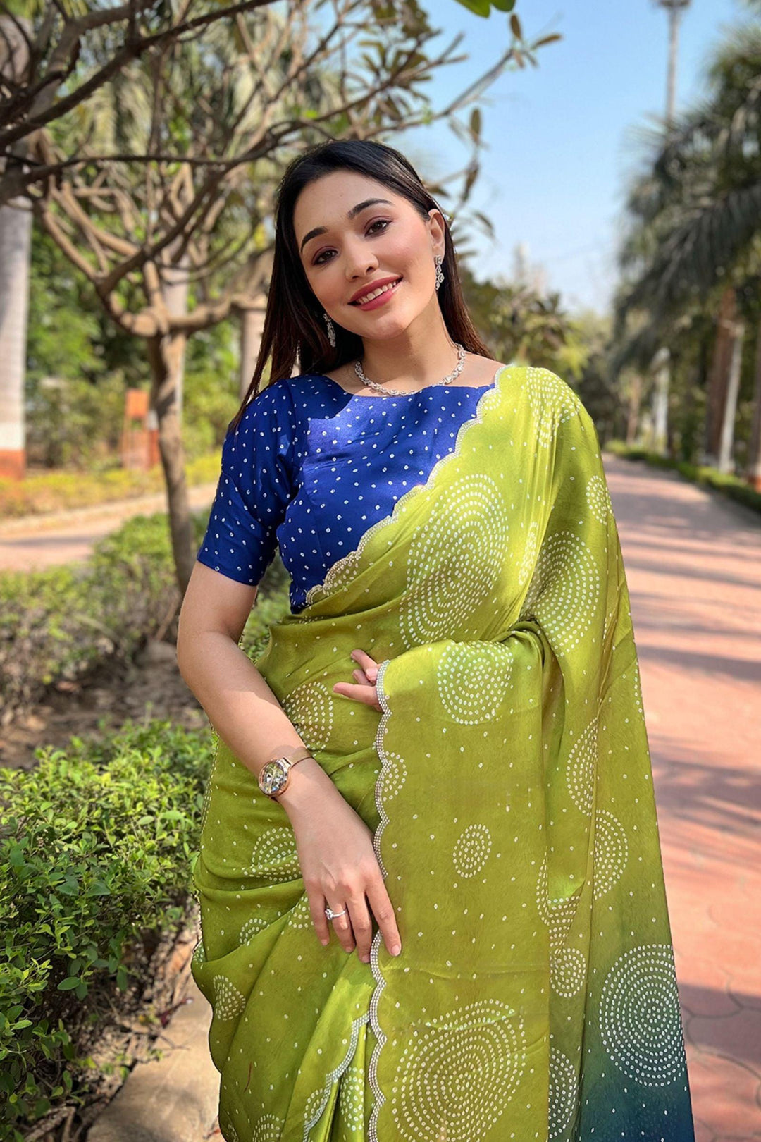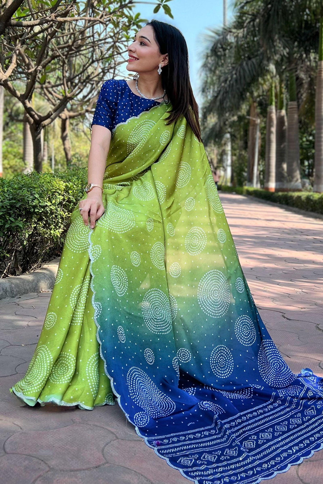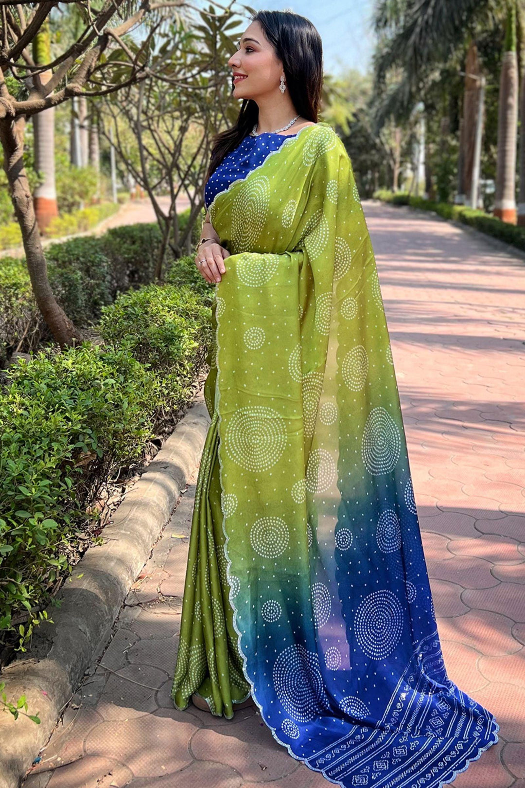 Introducing Glamwiz Ready To Wear Oasis Green Bandhej Saree in Satin Georgette. Experience the perfect blend of tradition and convenience with the Glamwiz Ready-to-Wear Saree. This stunning saree is designed to offer you the elegance of a traditional saree with the ease of modern fashion.