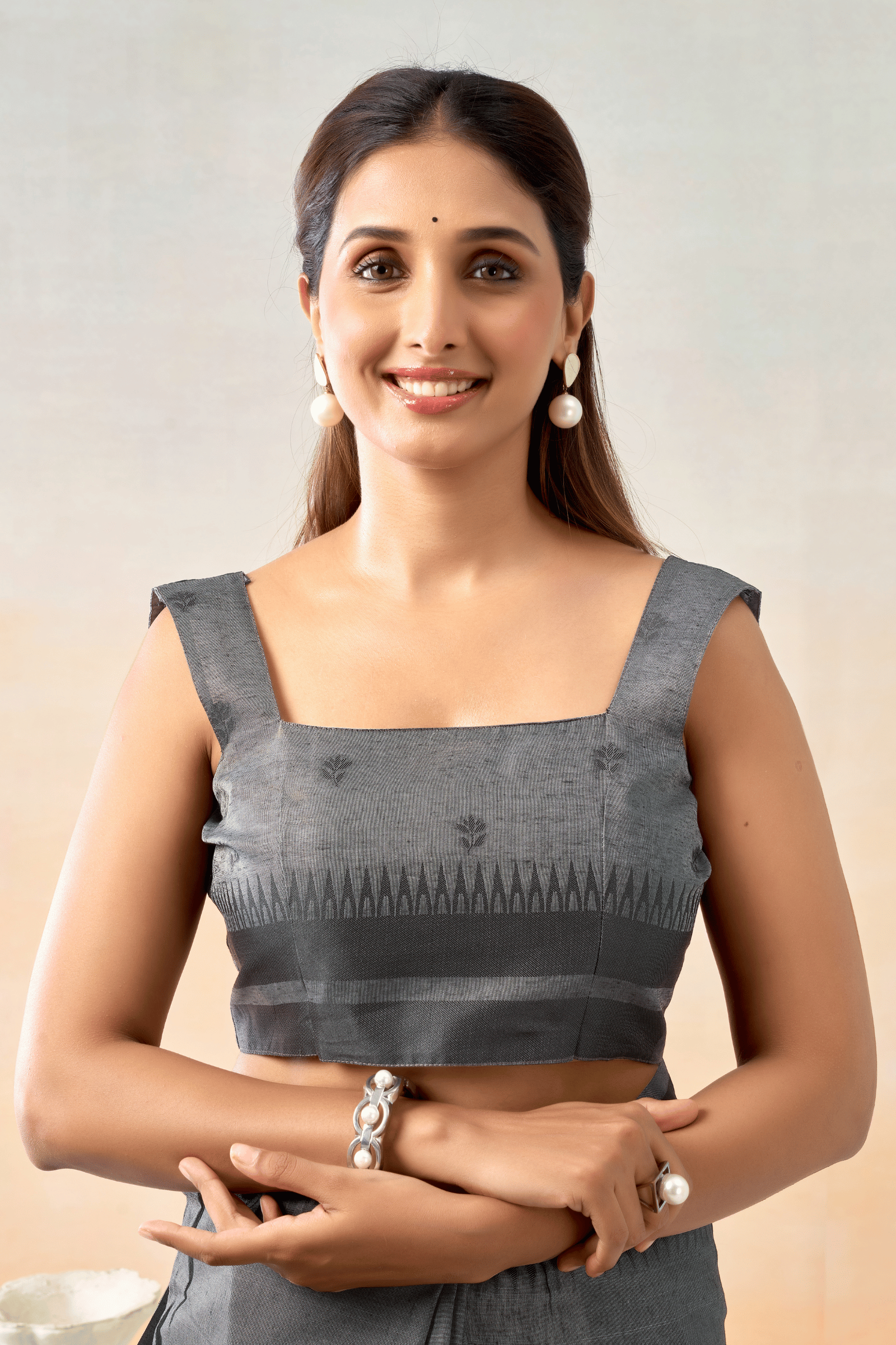 The lightweight fabric ensures all-day comfort, while the running blouse with allover woven butties and matching border completes a look of understated grace.