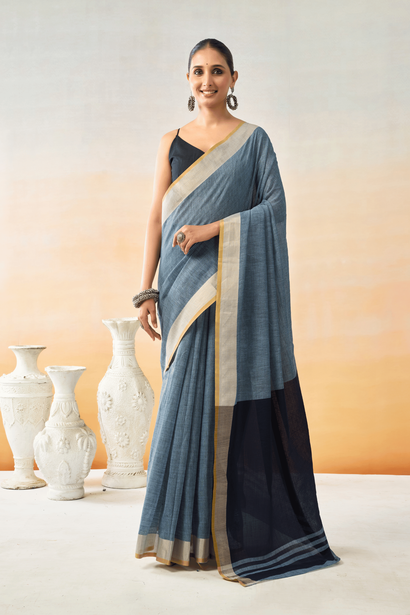 - Soft Pure Cotton Handloom-Style Saree with Zari-Woven Border and Contrast Pallu.