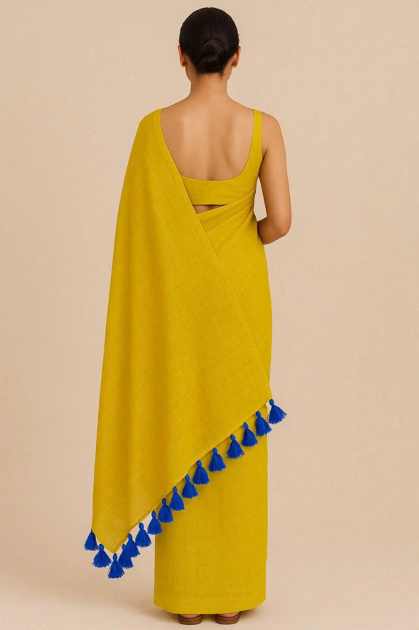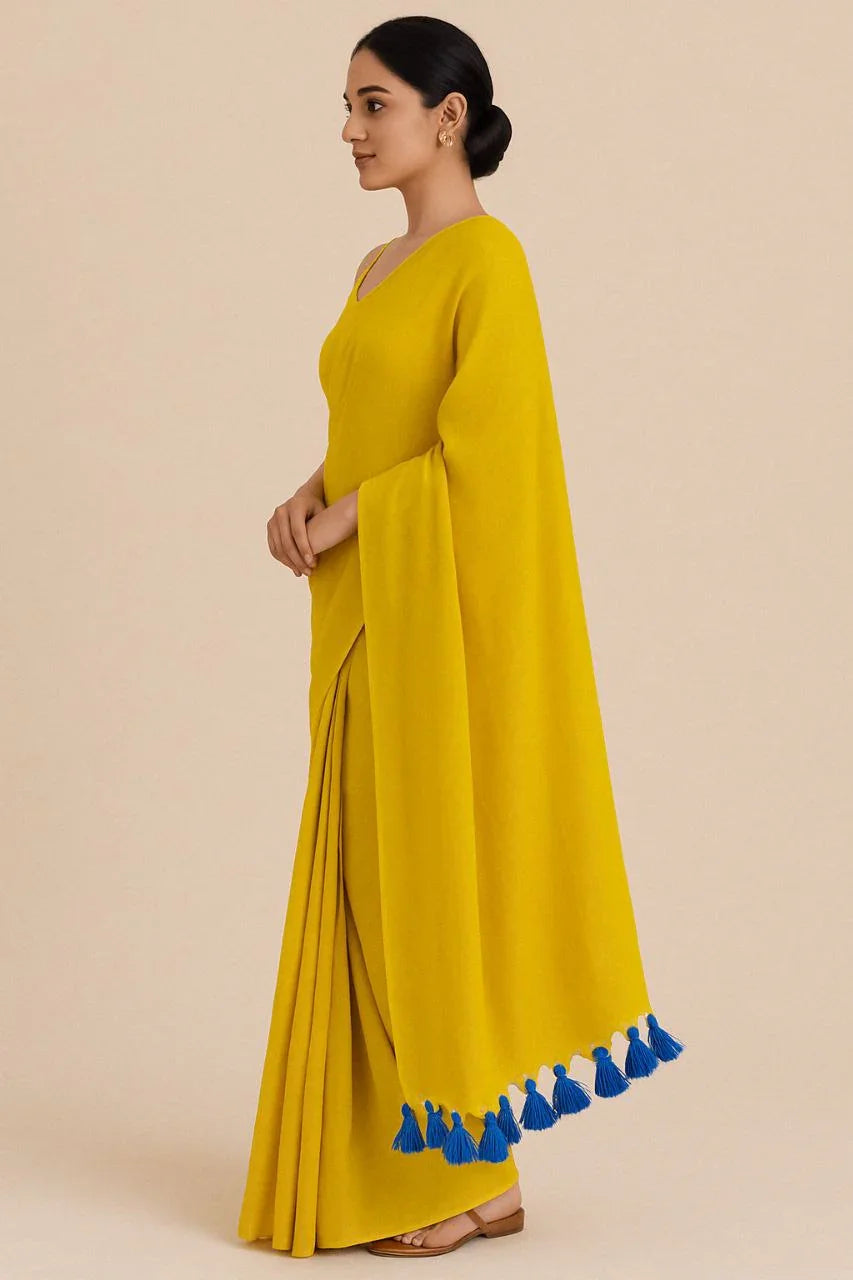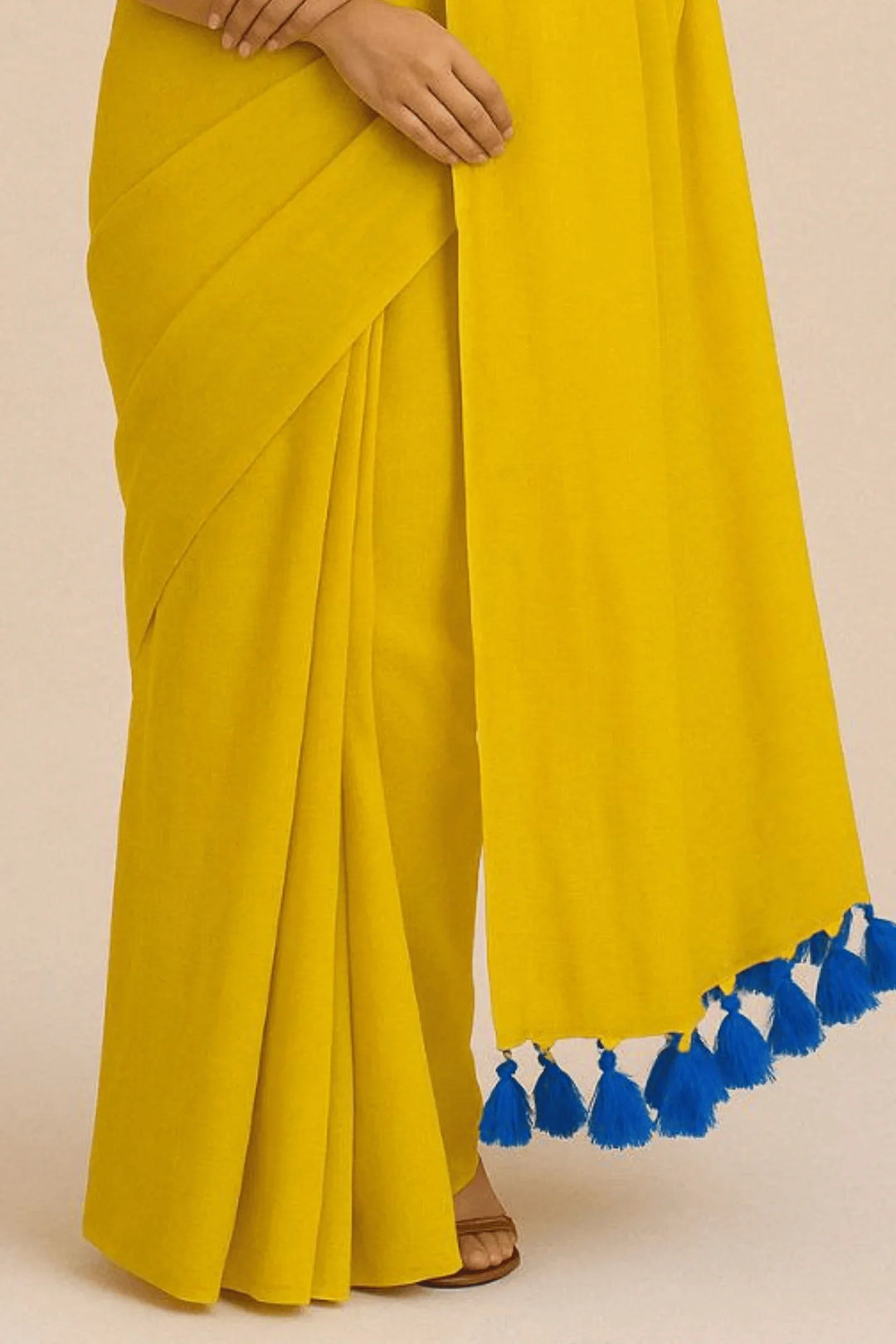 Radiate sunshine and confidence in this vibrant yellow mul cotton saree, enhanced with playful blue tassels for that extra pop of personality. Crafted in soft, breathable mul cotton, this saree is designed to keep you cool and stylish all day long.