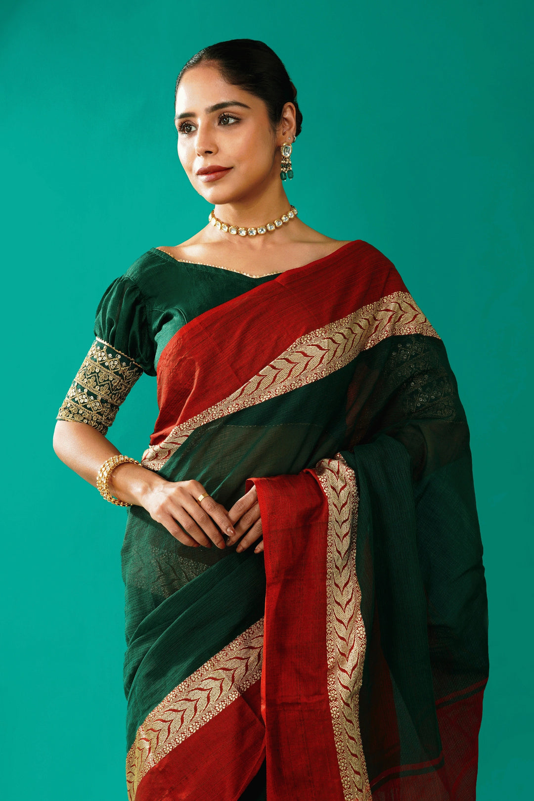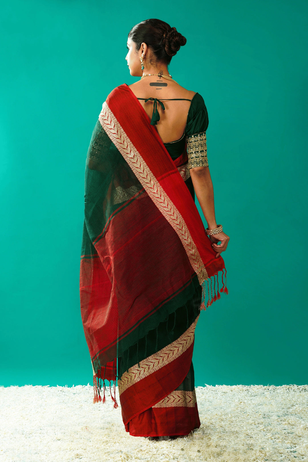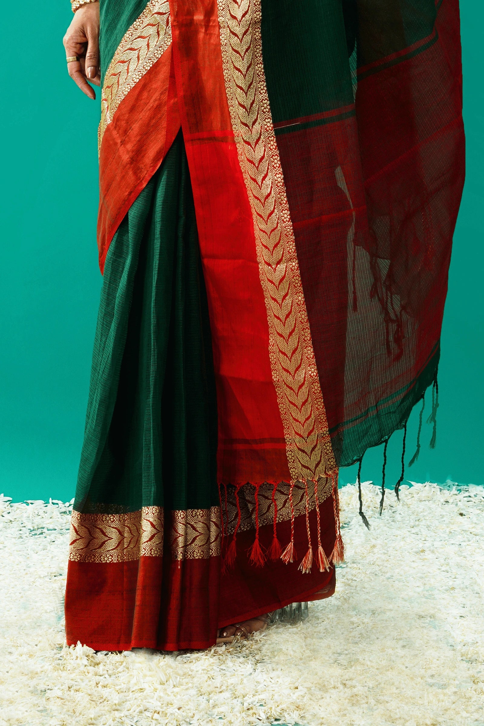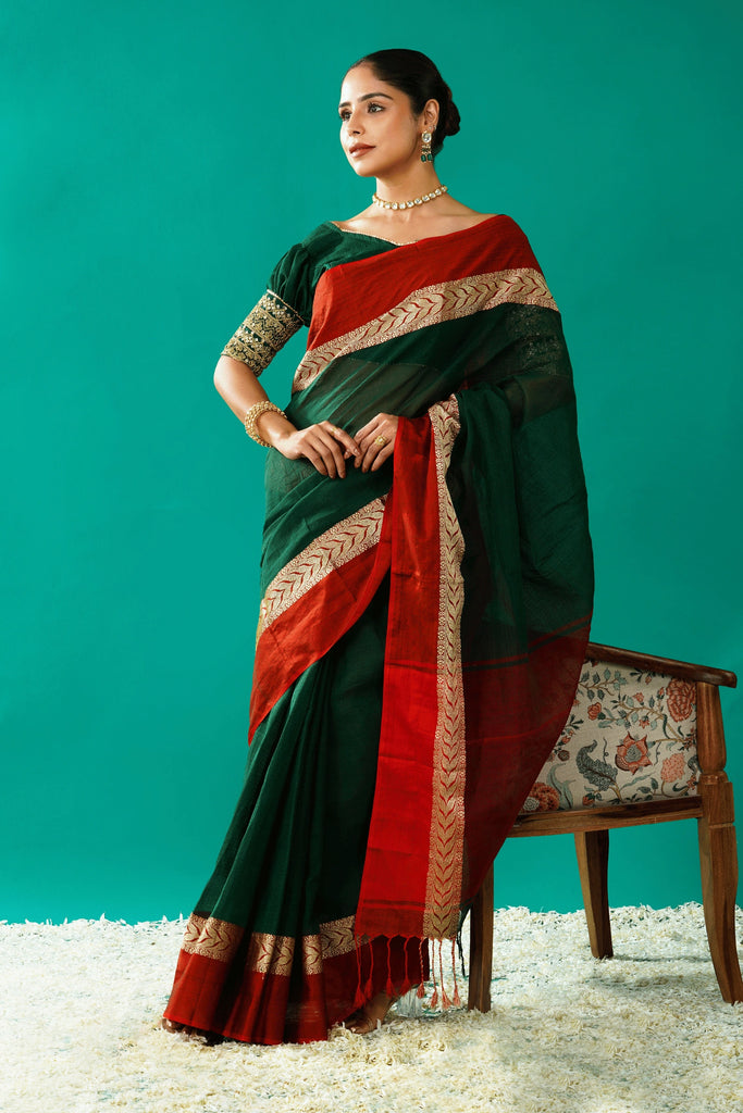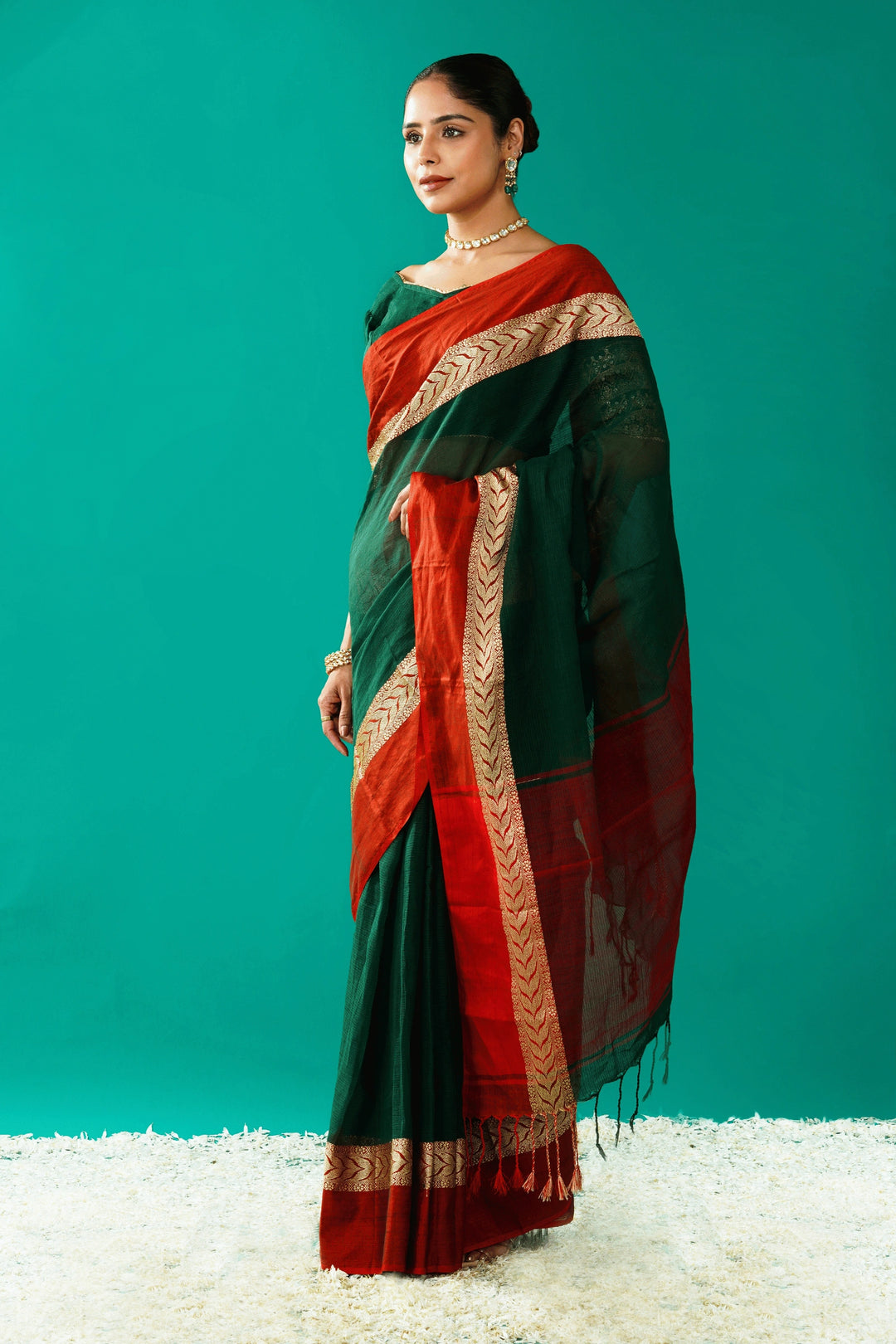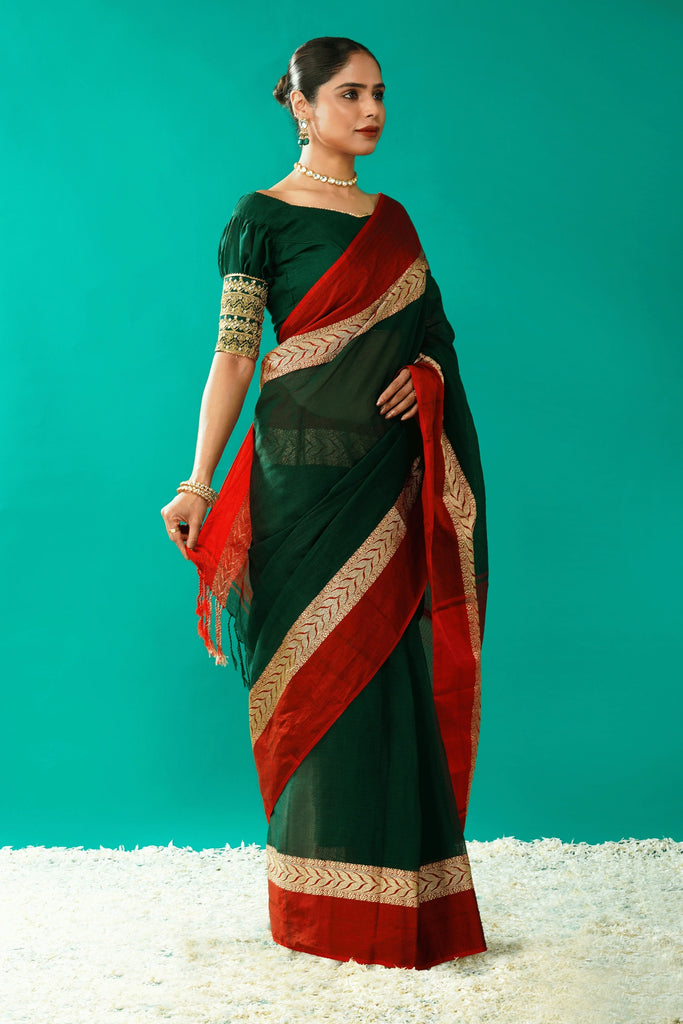 Radiance and confidence in this Green Zari Cotton Saree, enhanced with playful red tassels for that extra pop of personality. Crafted in soft, breathable mul cotton, this saree is designed to keep you cool and stylish all day long.