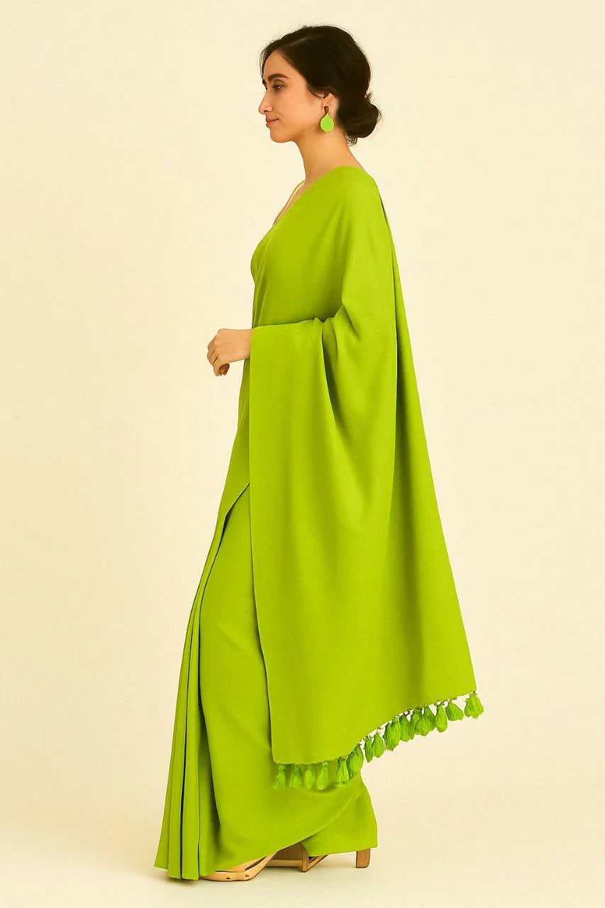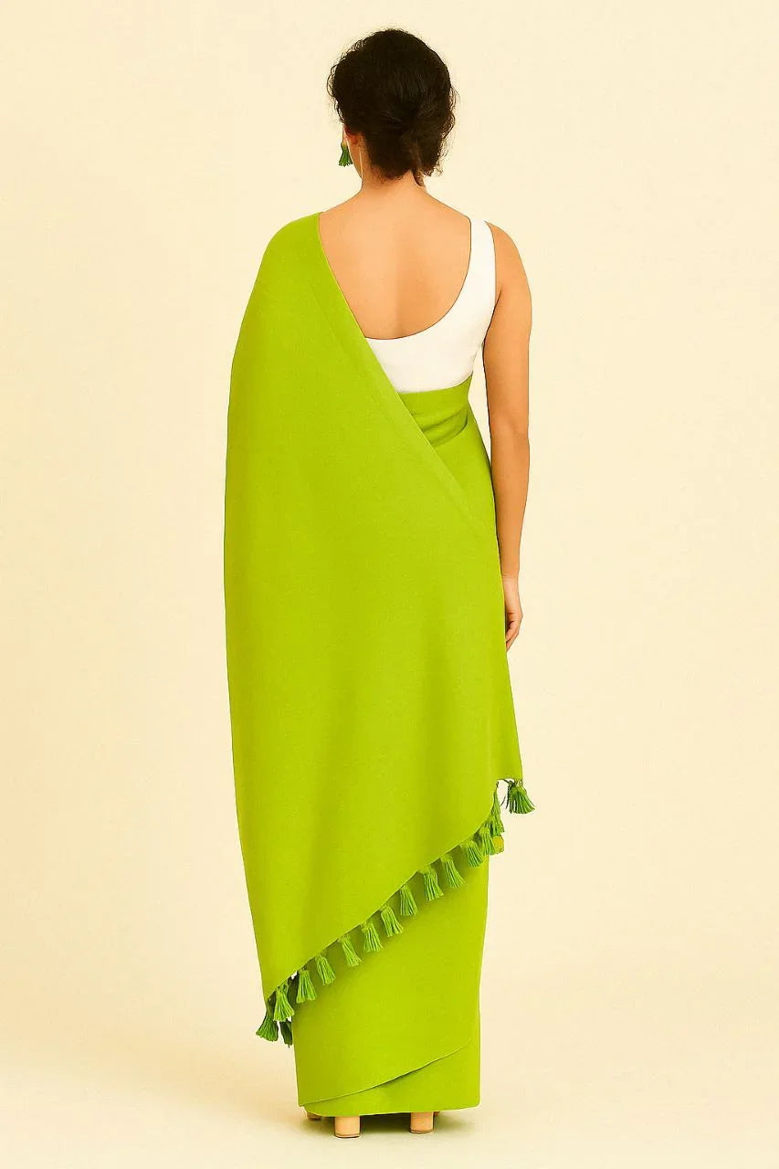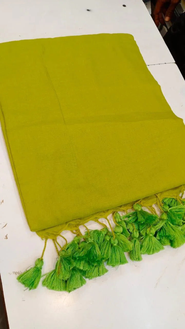 Radiate sunshine and confidence in this vibrant green mul cotton saree, enhanced with playful tassels for that extra pop of personality. Crafted in soft, breathable mul cotton, this saree is designed to keep you cool and stylish all day long.