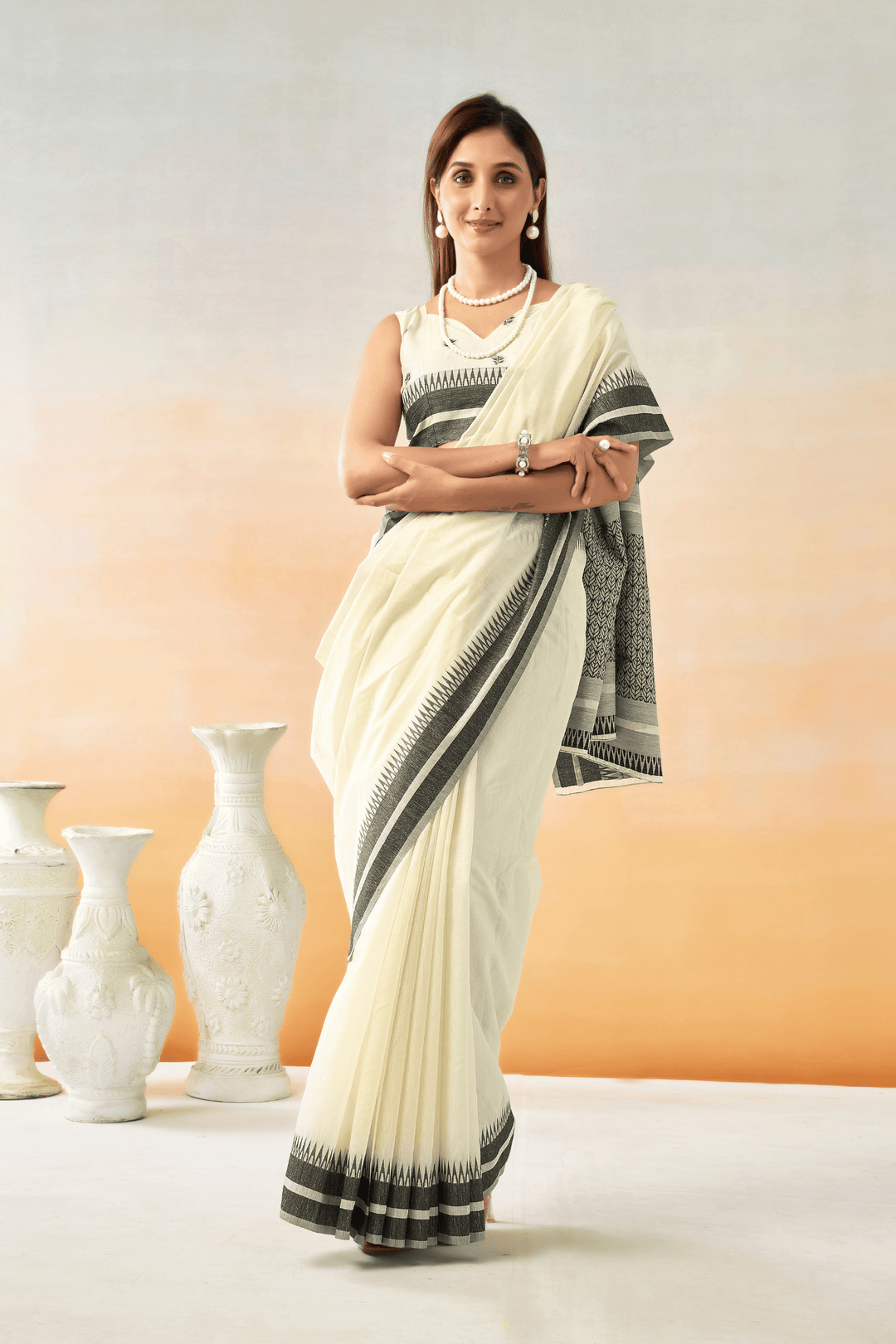 • Soft Pure Spun Cotton Saree with Handloom-Style Temple Weave Border & Pallu.