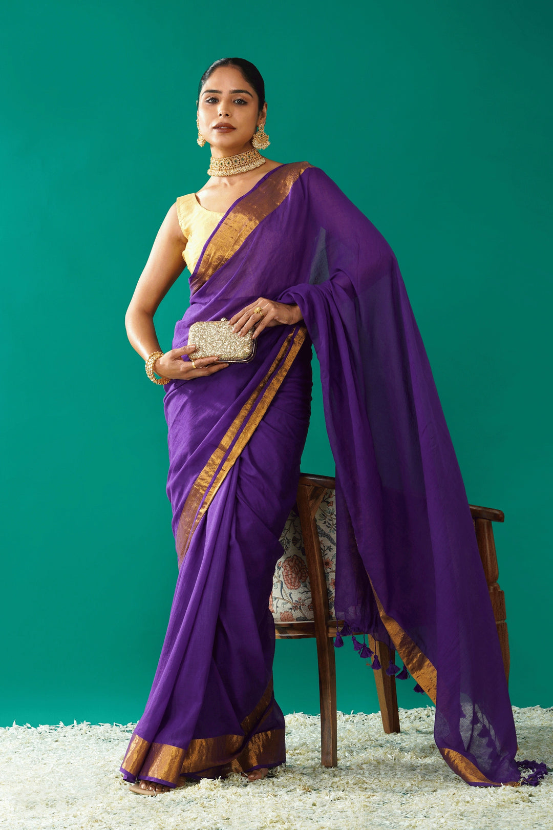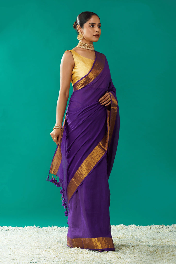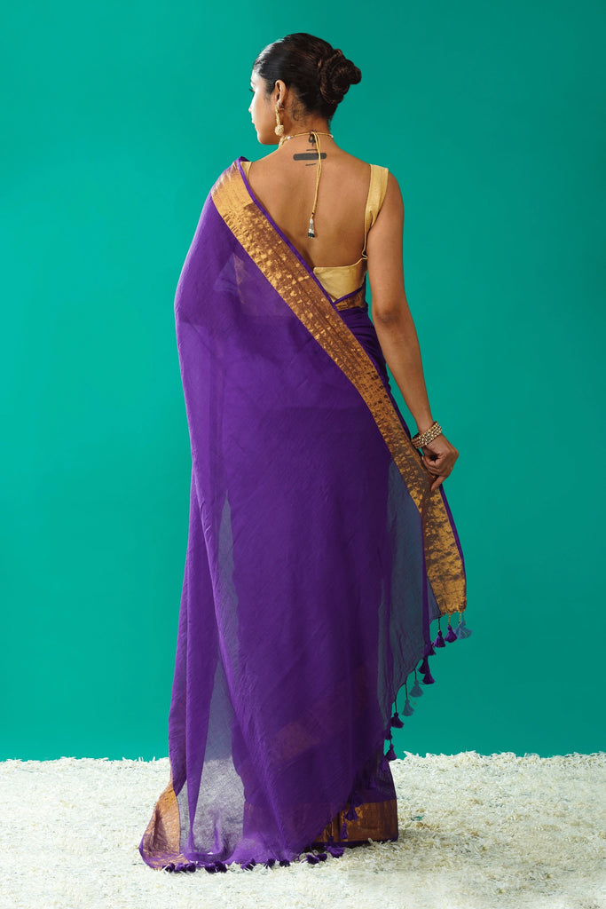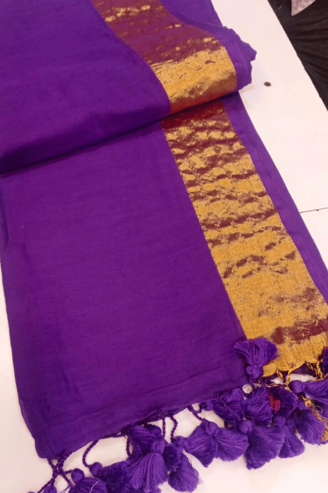 Radiance and confidence in this Purple Mul Cotton Saree, enhanced with playful purple tassels for that extra pop of personality. Crafted in soft, breathable mul cotton, this saree is designed to keep you cool and stylish all day long.