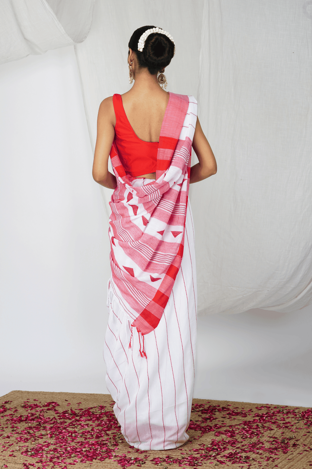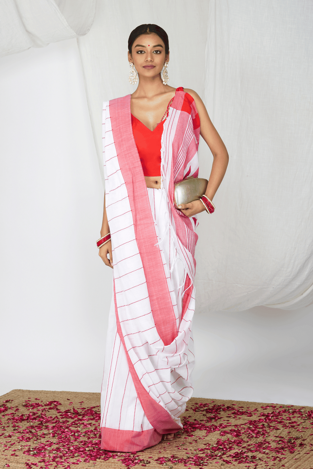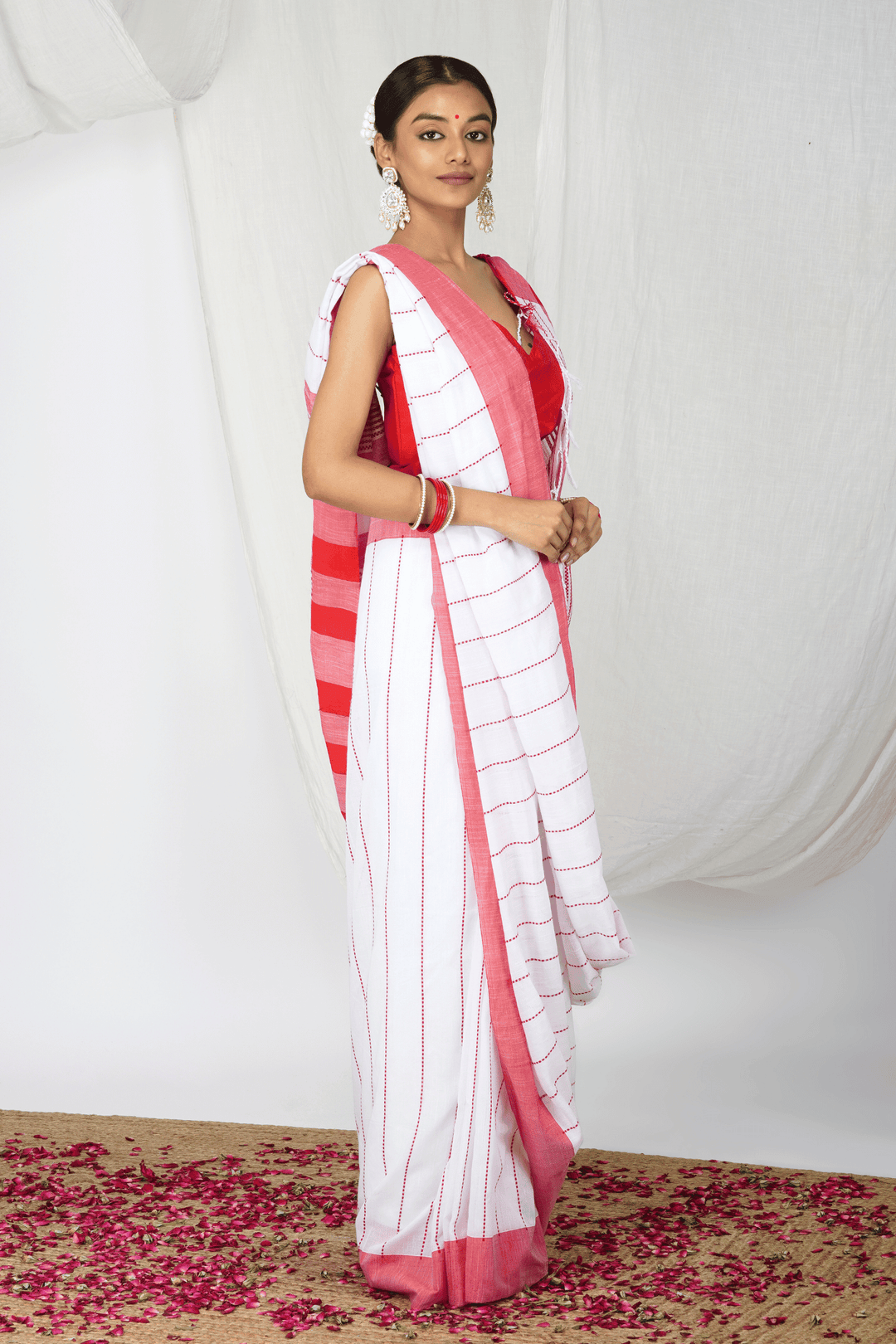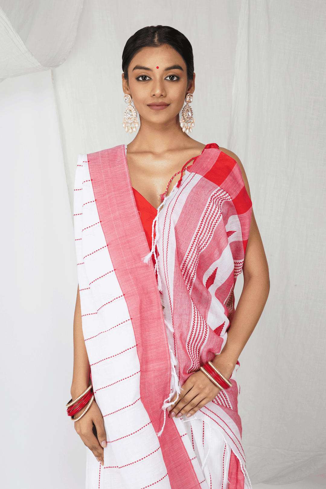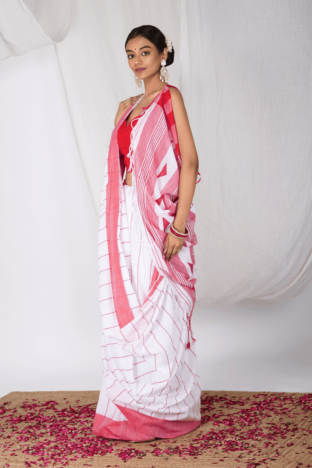 - One "Bengali Kantha Saree" Ready to wear White N Red Cotton Saree.