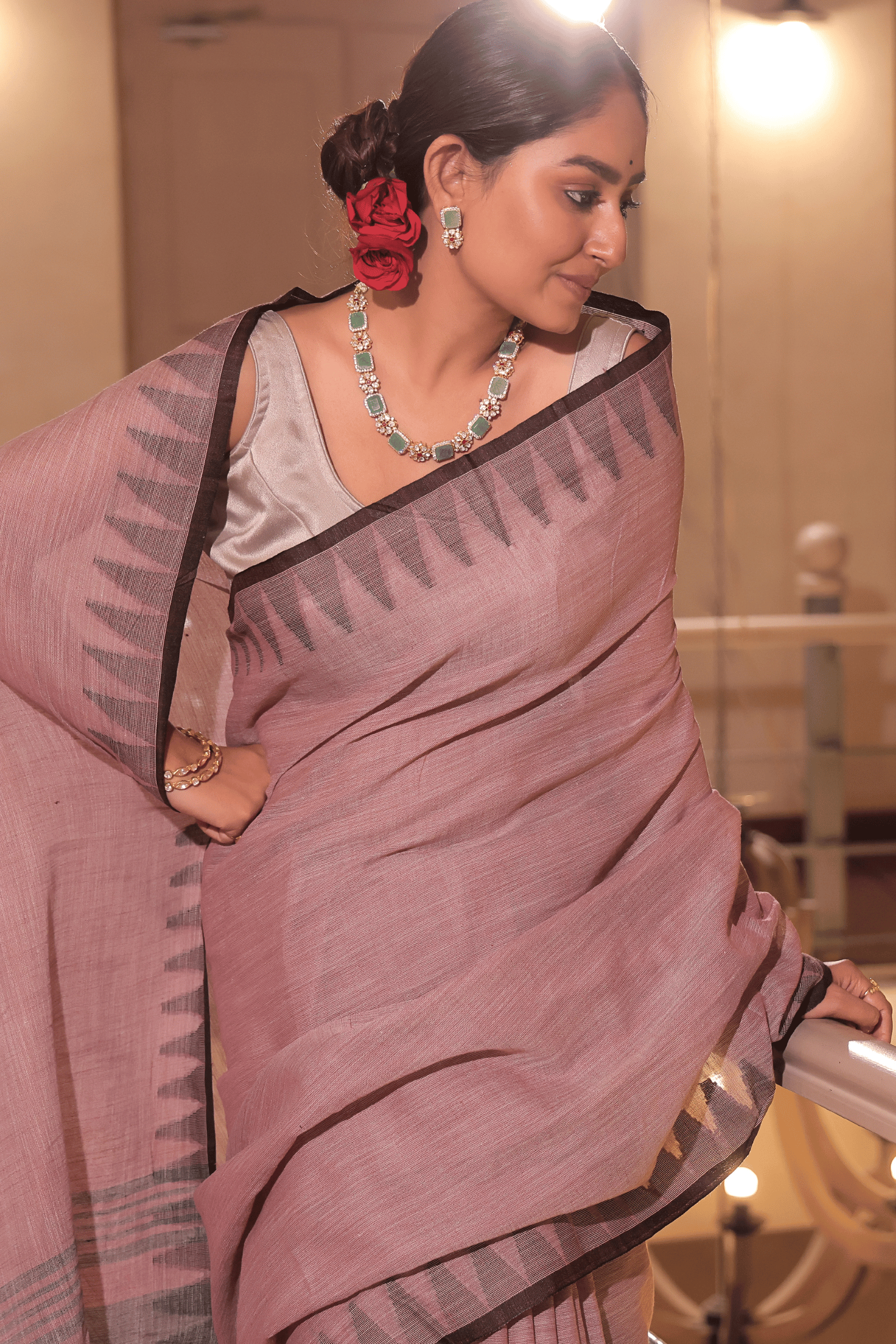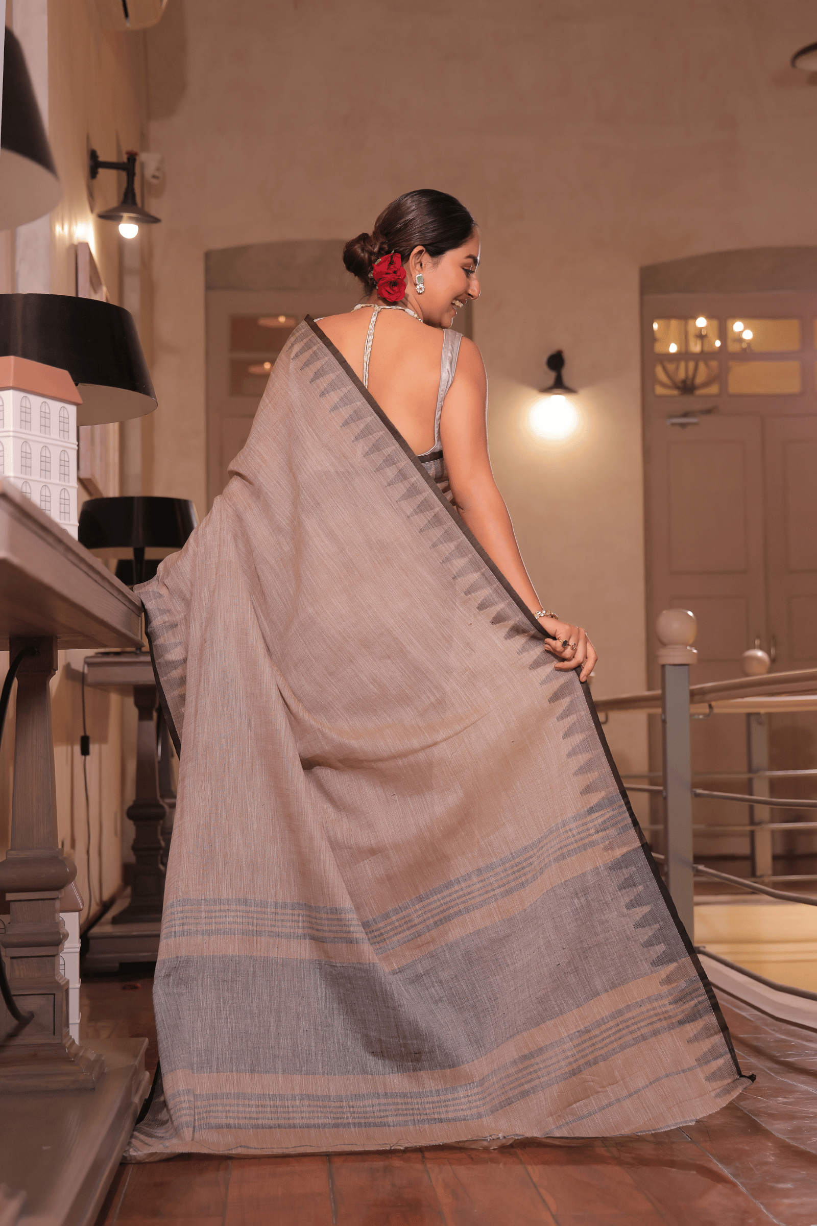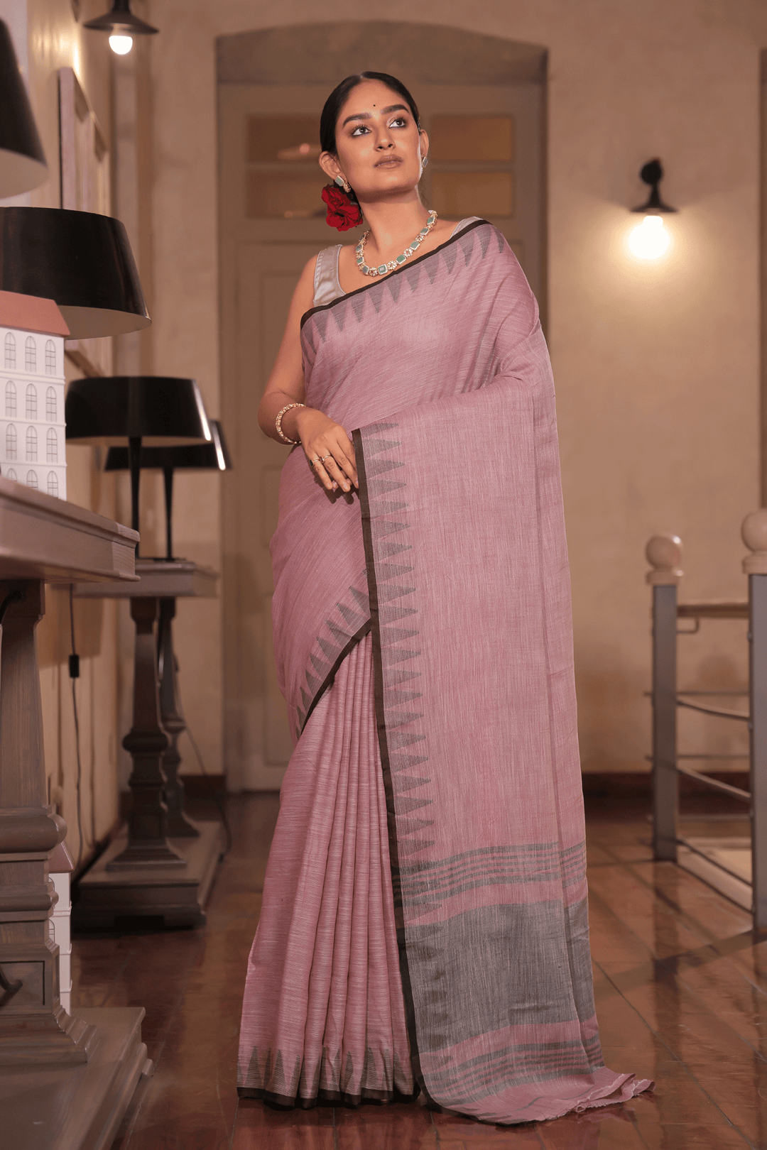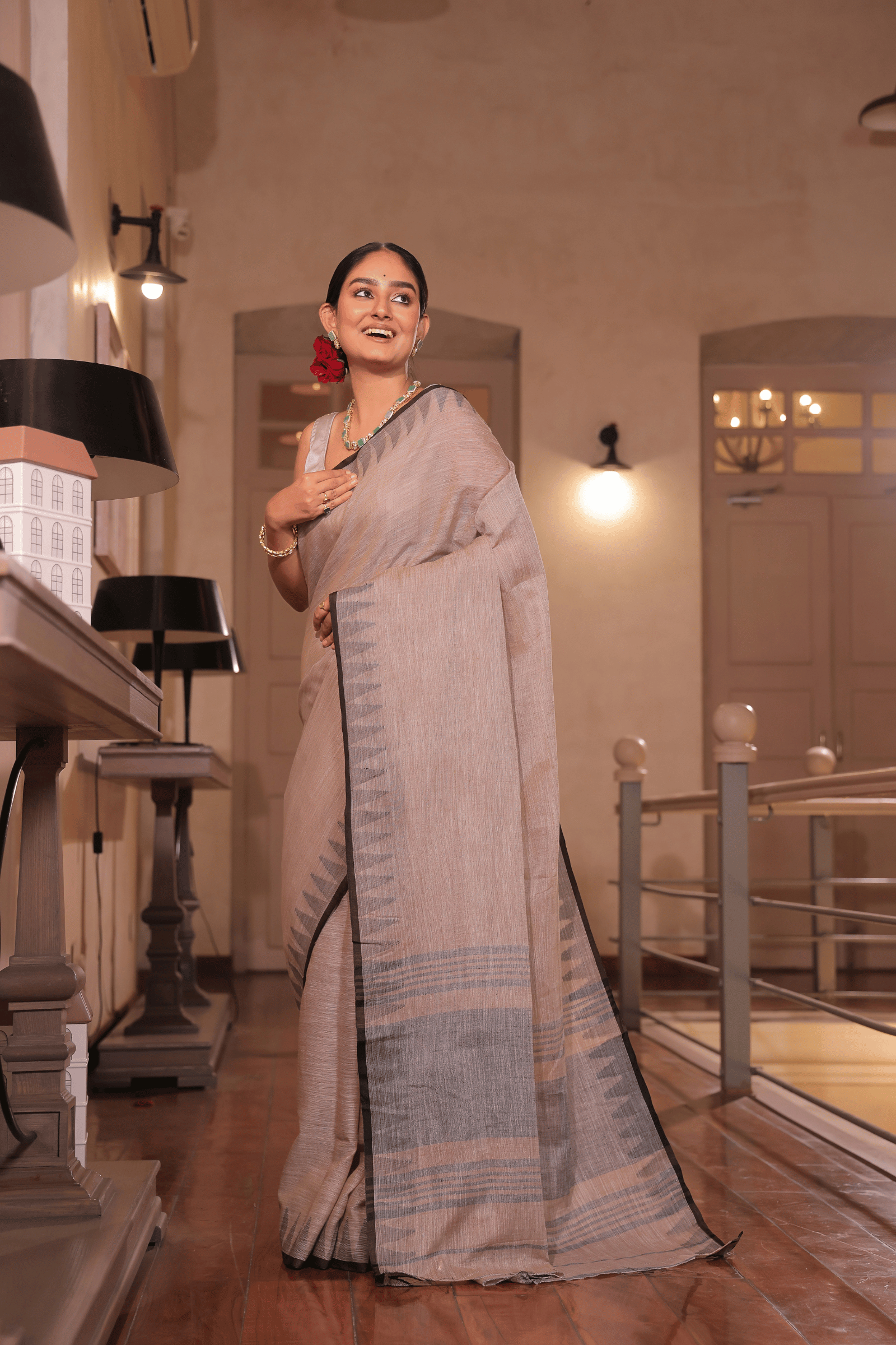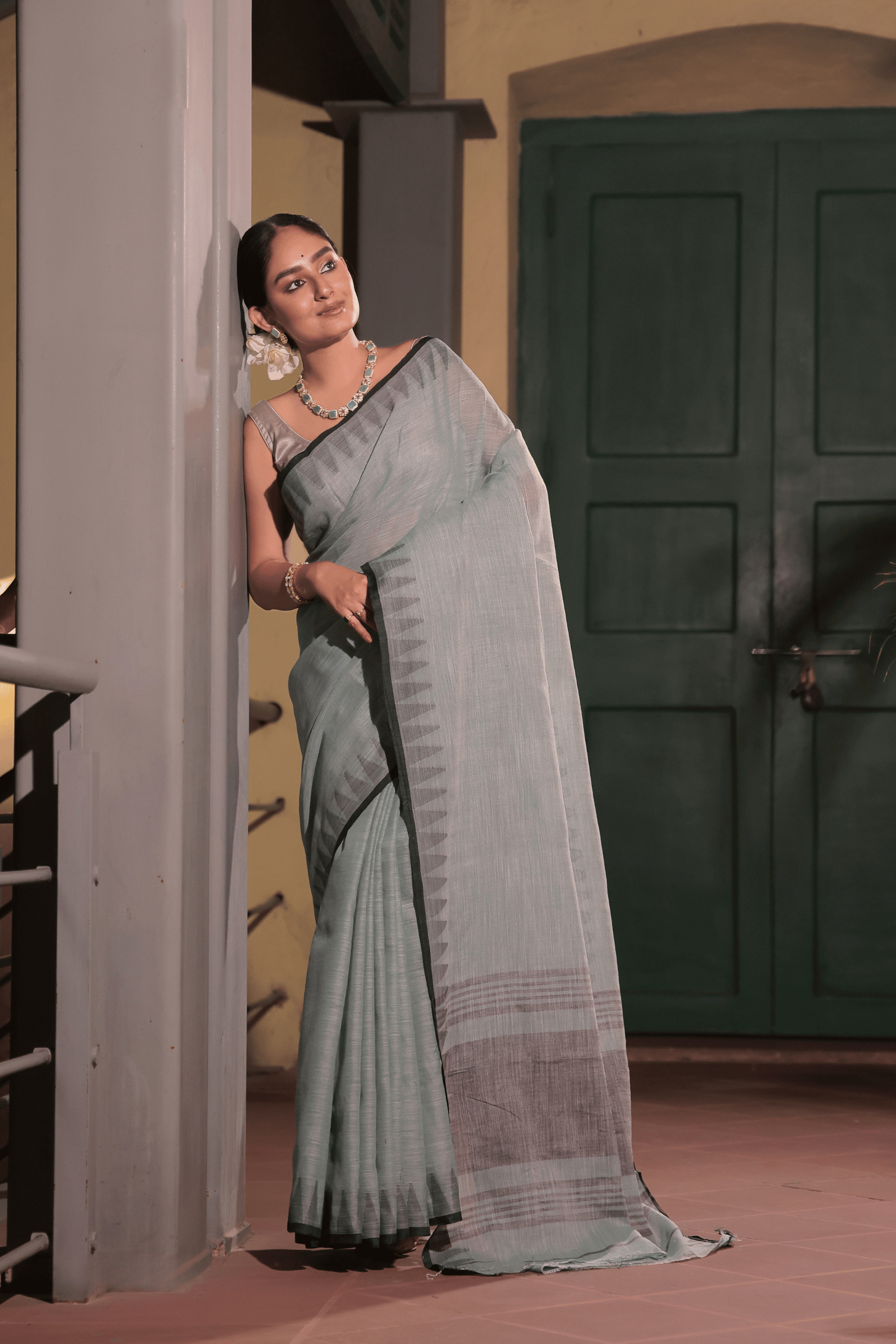 - Soft Handloom Pure Linen Cotton Saree with contrast woven border and pallu.
