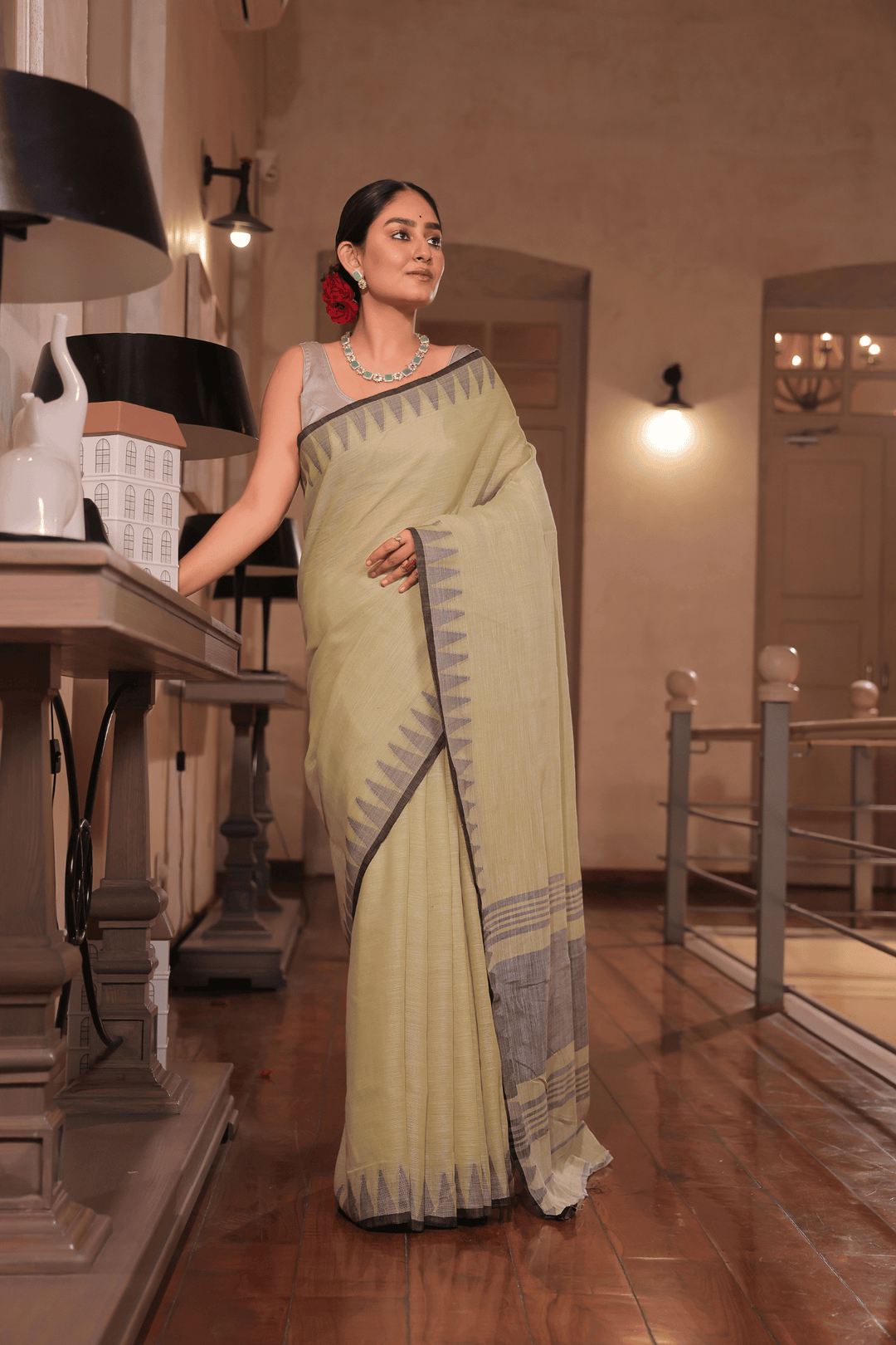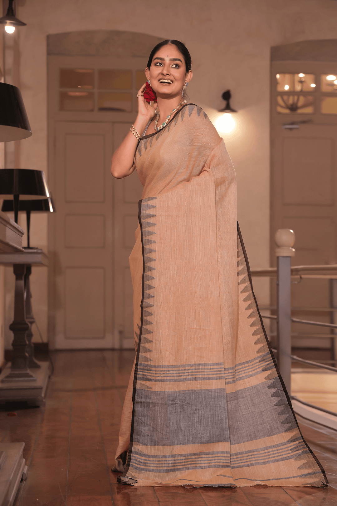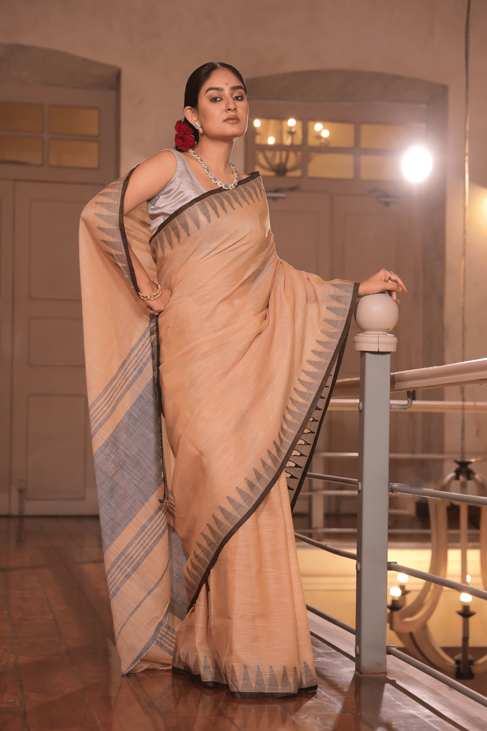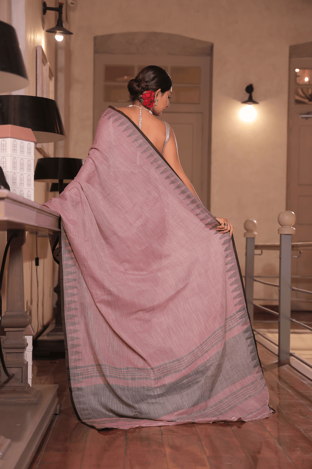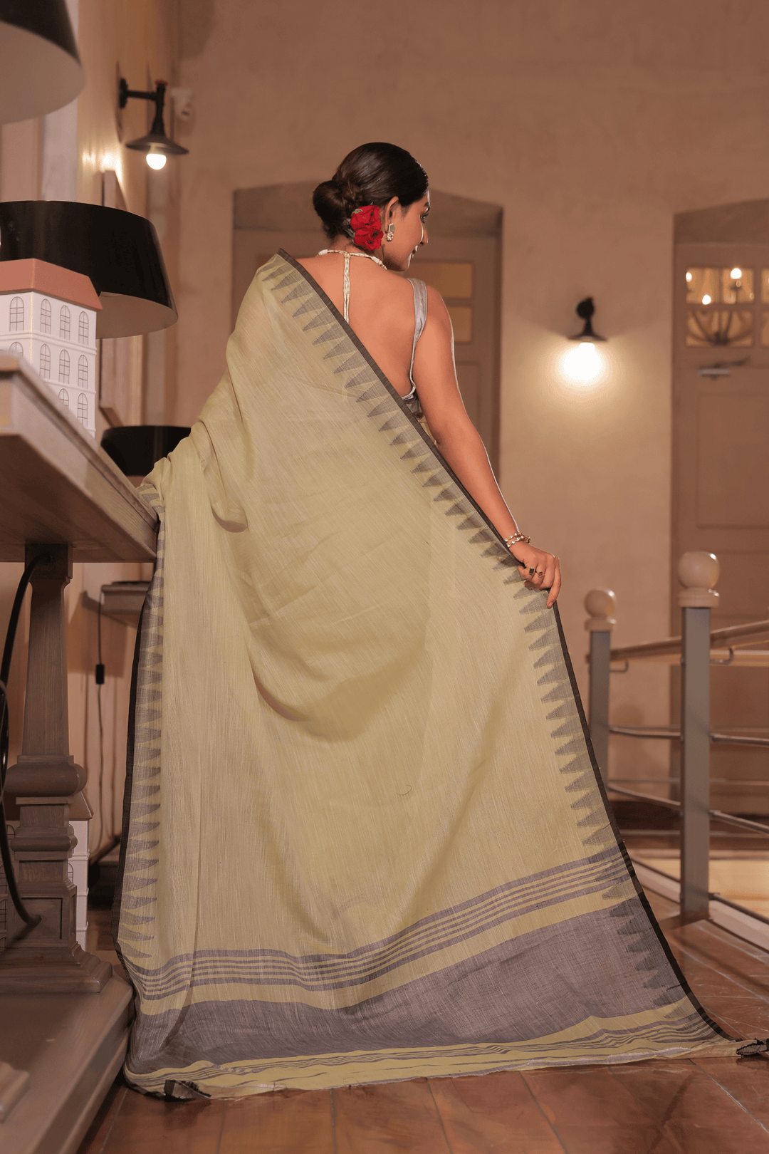 - Soft Handloom Pure Linen Cotton Saree with contrast woven border and pallu.