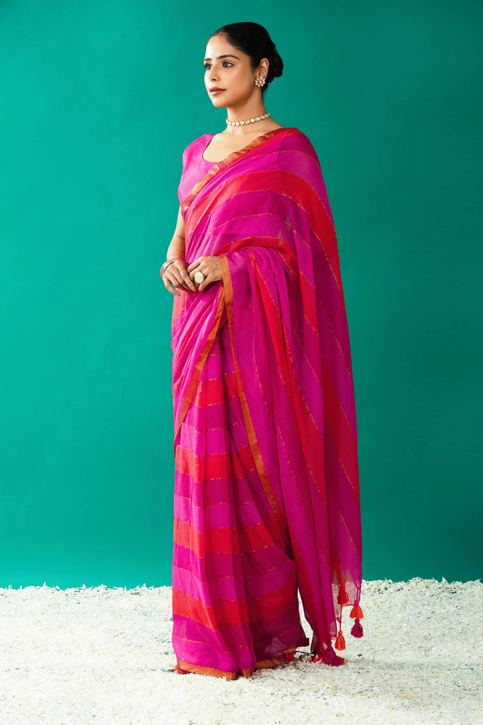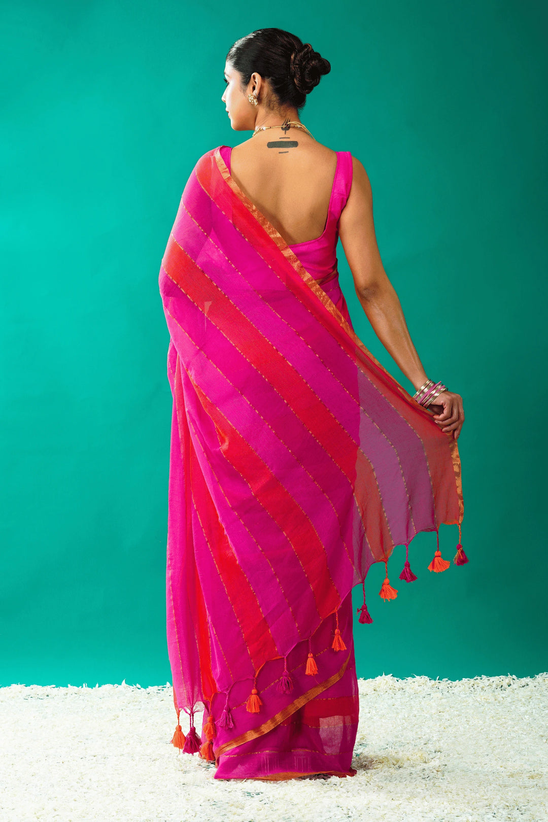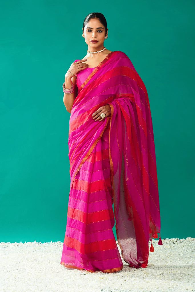 Radiance and confidence in this Pink Mul Cotton Saree, enhanced with playful orange tassels for that extra pop of personality. Crafted in soft, breathable mul cotton, this saree is designed to keep you cool and stylish all day long.