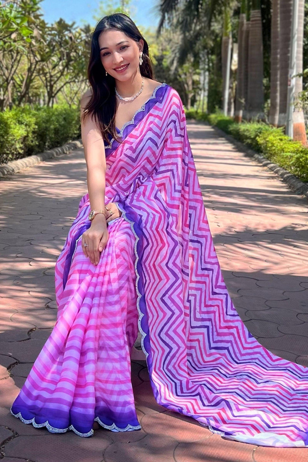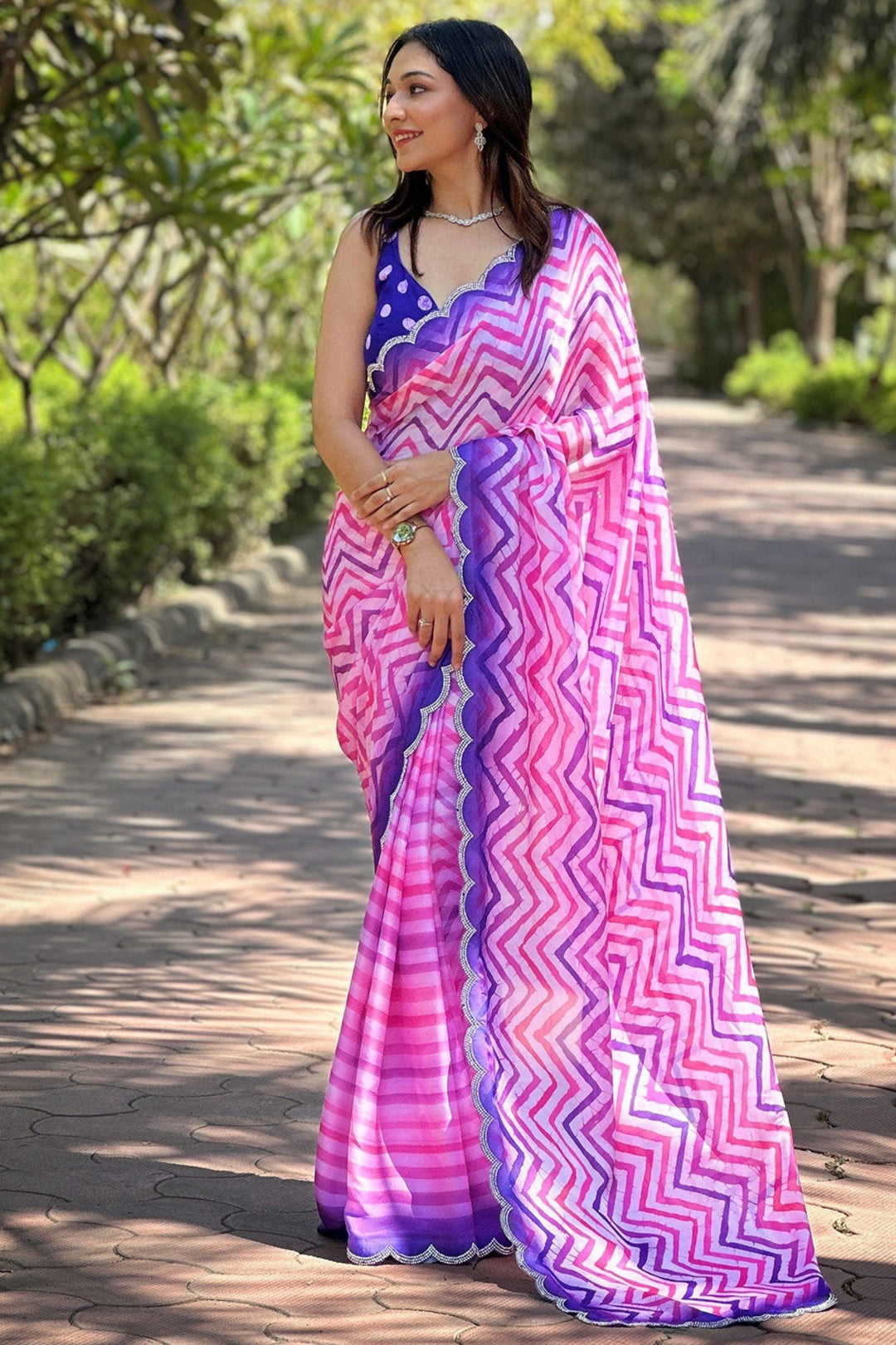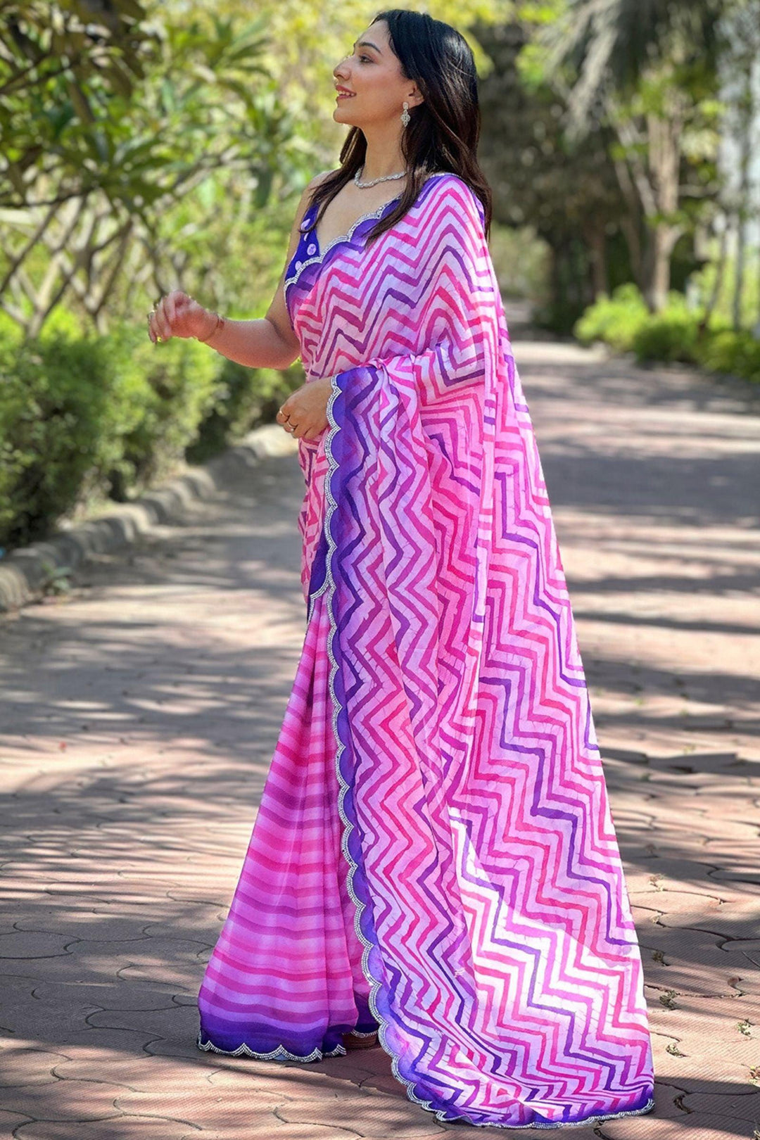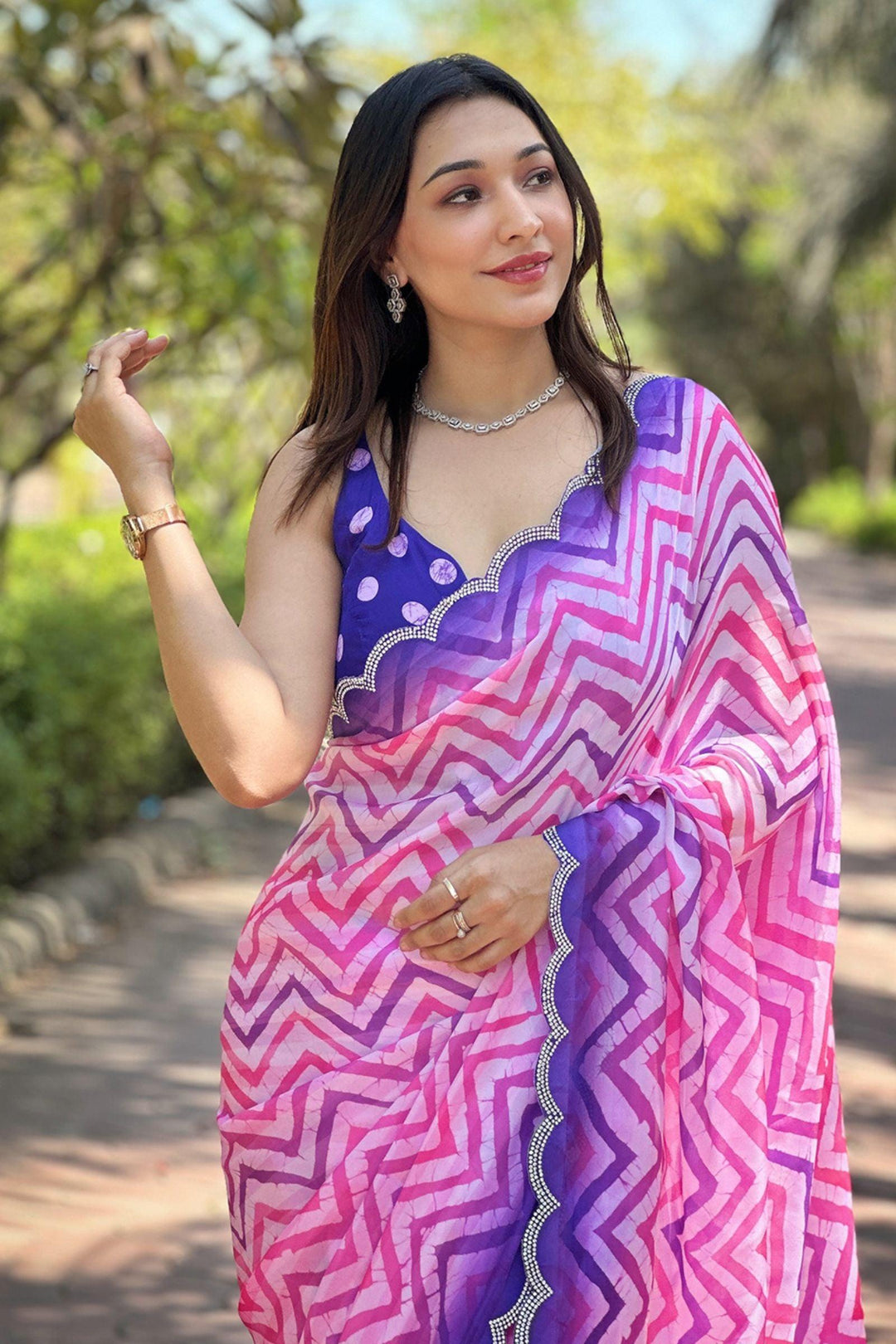 Indulge in timeless charm with our Ready To Wear Rose Pink Leheriya Georgette Saree. Crafted from satin georgette, its mesmerizing leheriya striped print and exquisite cut work detail exude sophistication, making it a signature piece from Glamwiz that effortlessly merges tradition with contemporary allure.