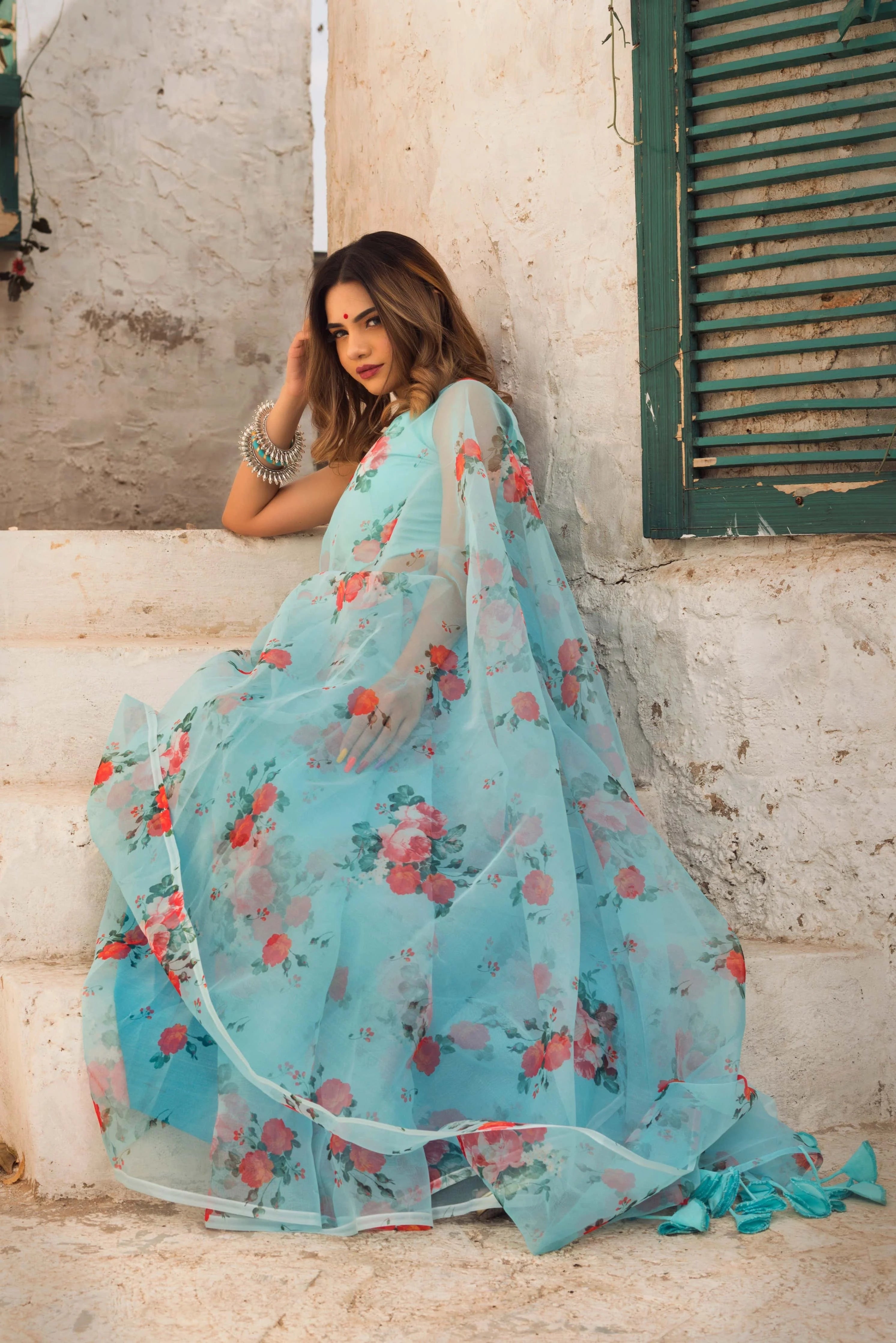 This ready-to-wear pastel blue floral printed organza Glamwiz saree is a celebration of lightness, grace, and effortless charm. Delicately adorned with floral patterns, its sheer, breezy fabric makes it perfect for daytime festivities, haldi ceremonies, or garden weddings.