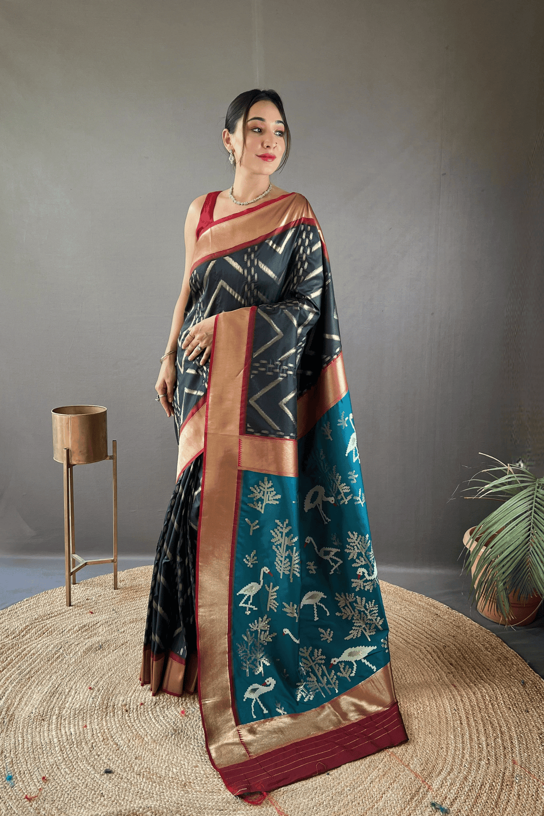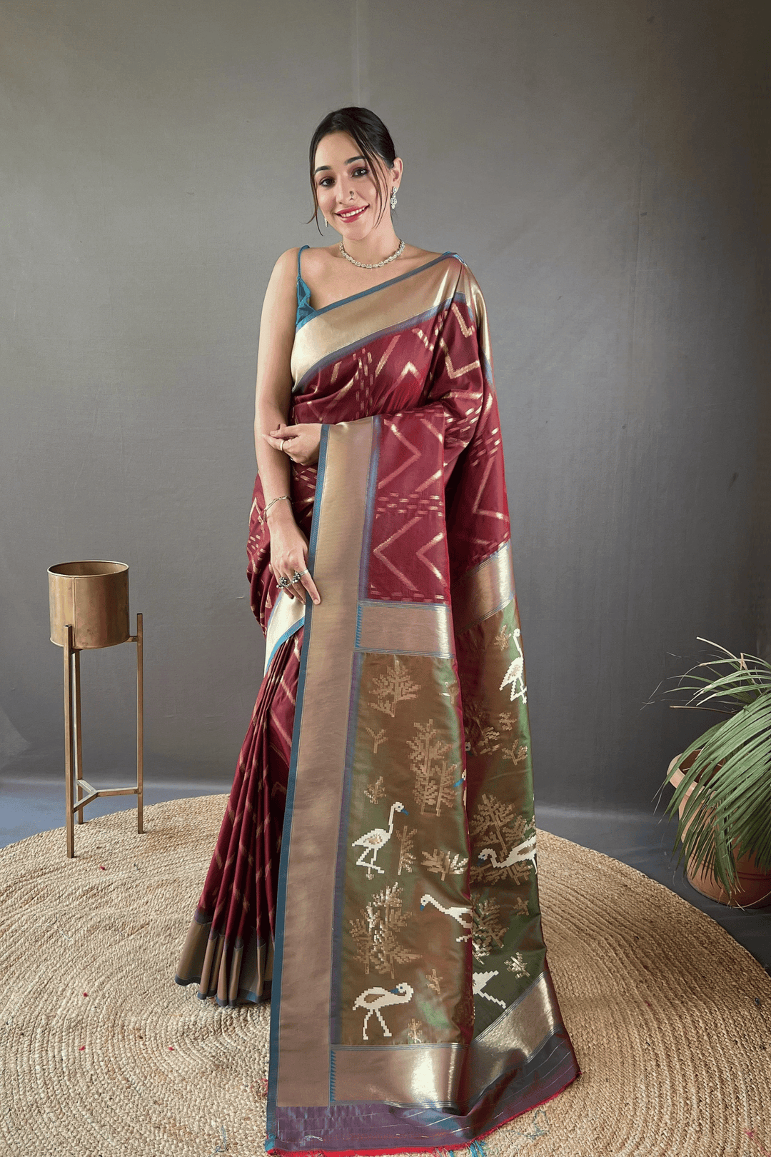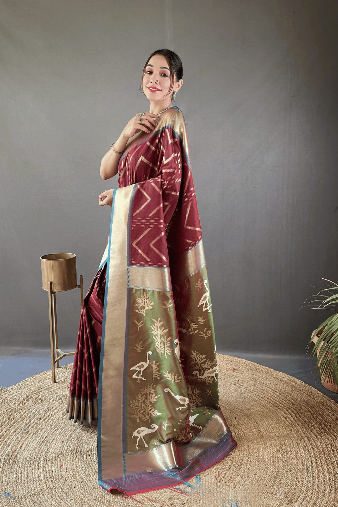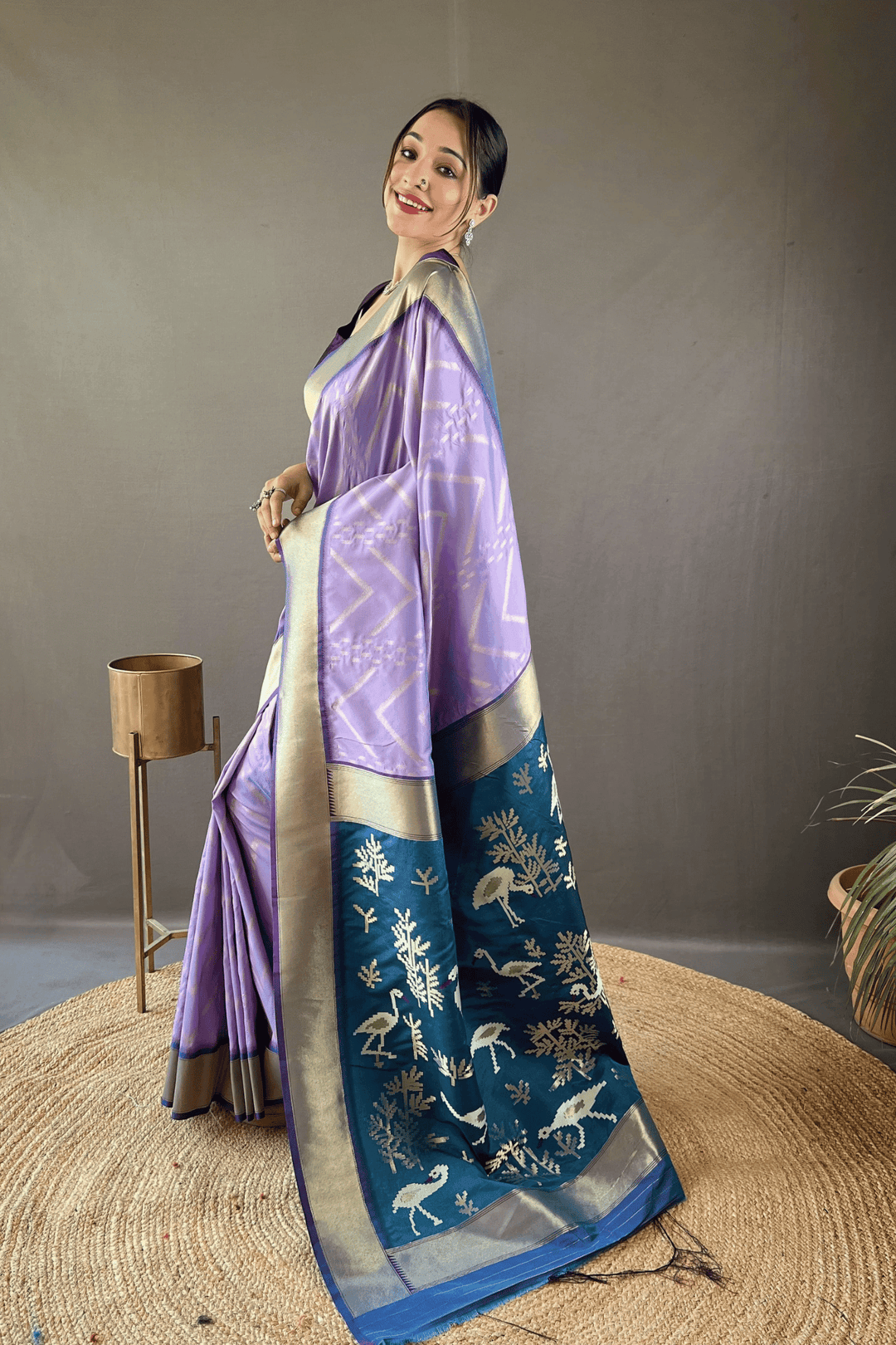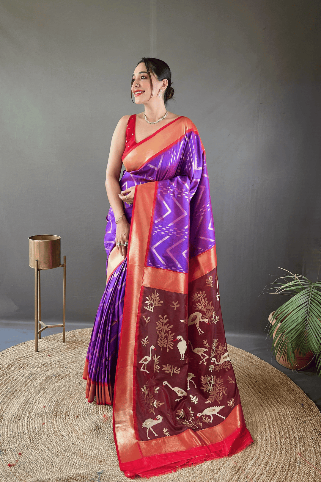 A Ready to Wear Printed Paithani Saree with stitched pleats woven with Grand paithani border. The soft silk saree comes along with tone-to-tone matching blouse.