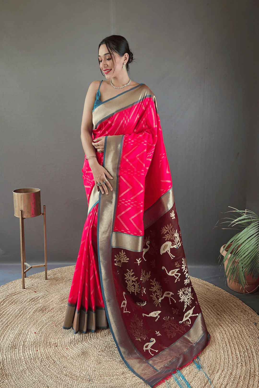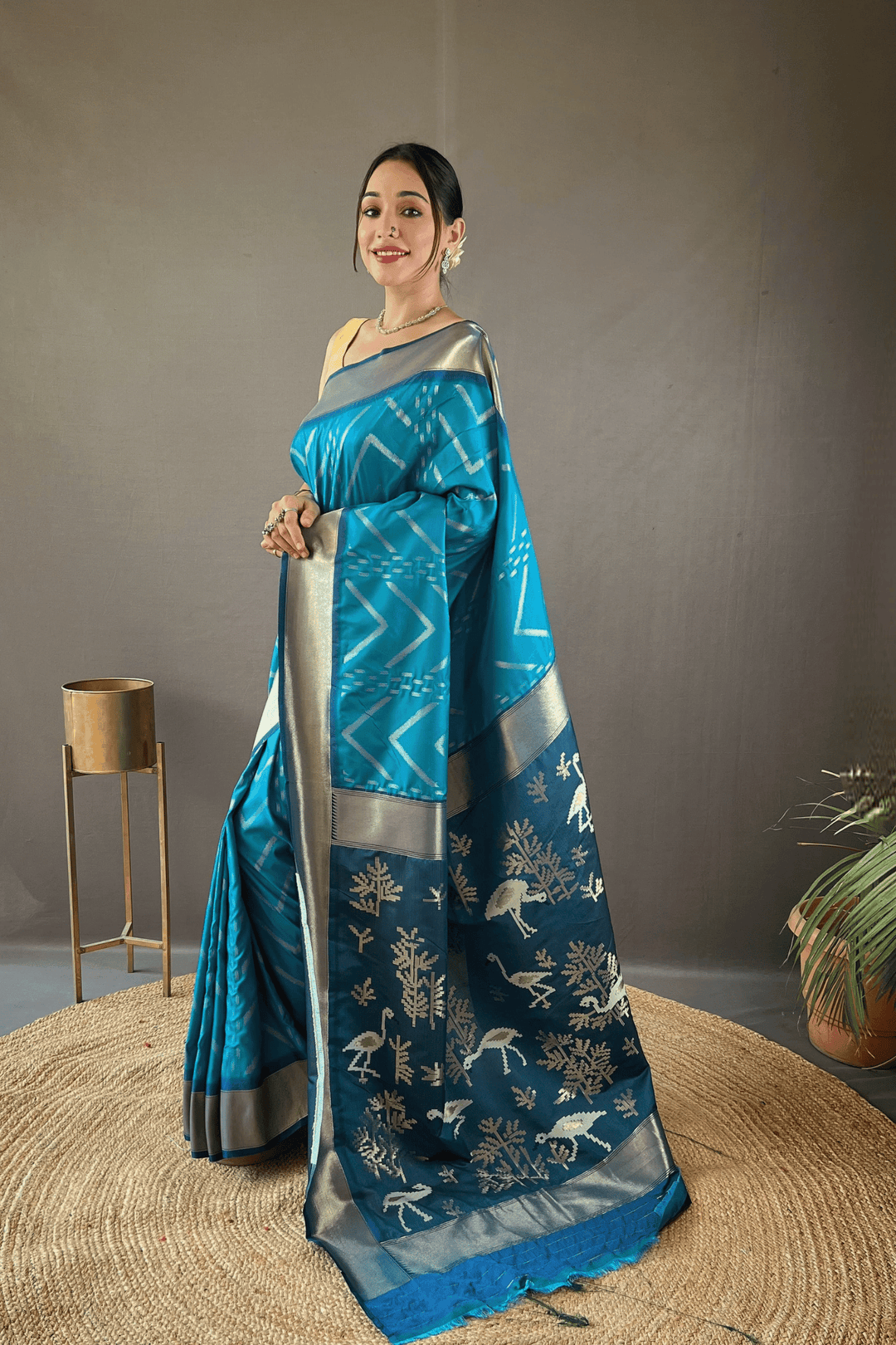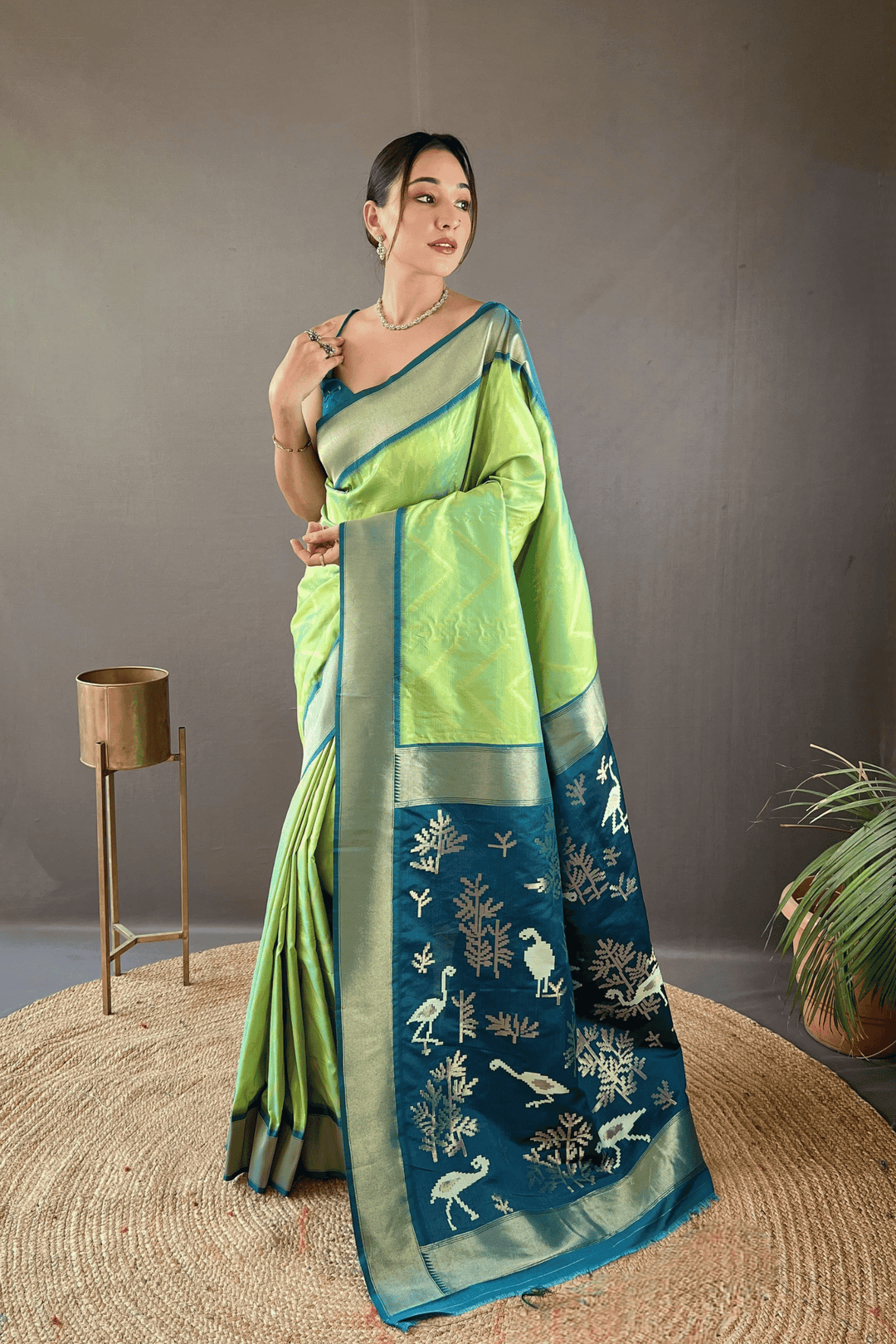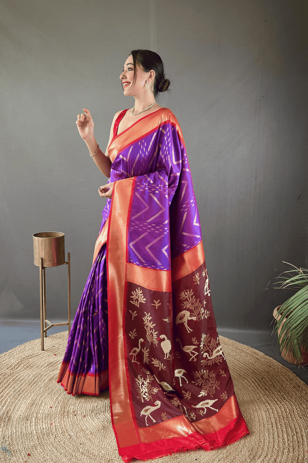 A Ready to Wear Printed Paithani Saree with stitched pleats woven with Grand paithani border. The soft silk saree comes along with tone-to-tone matching blouse.