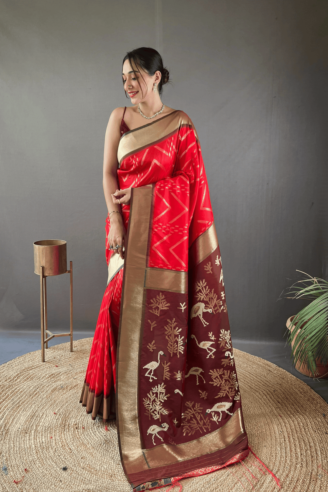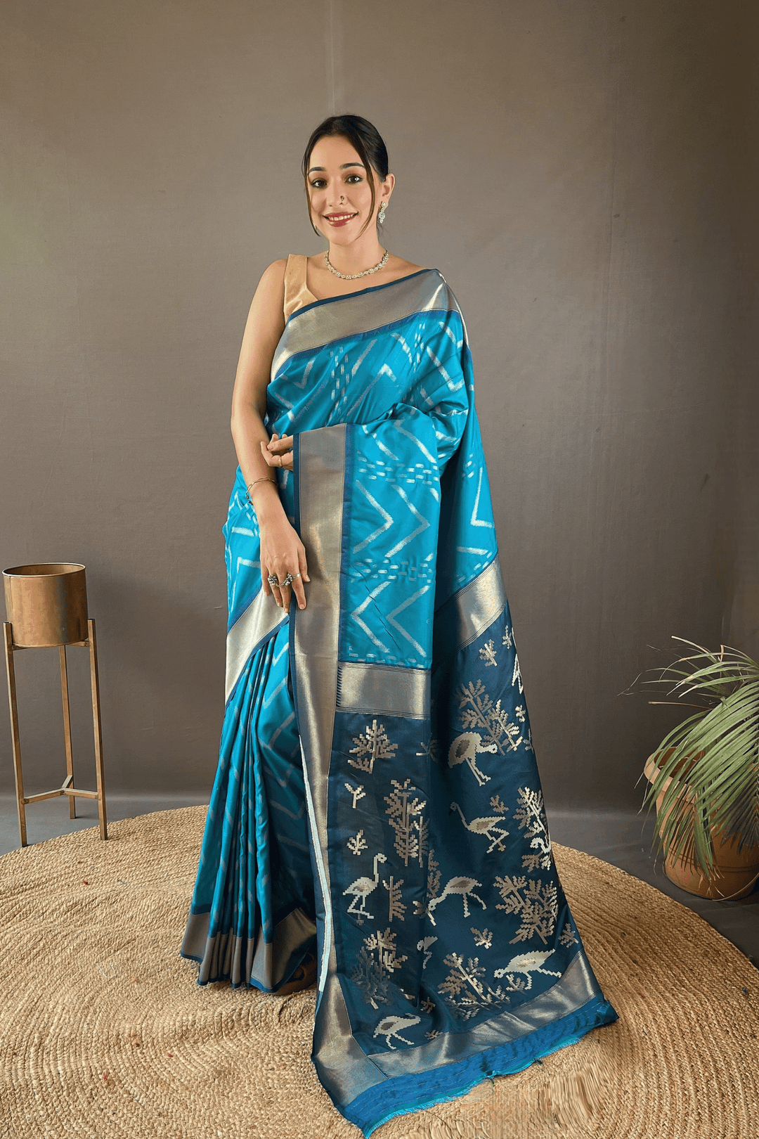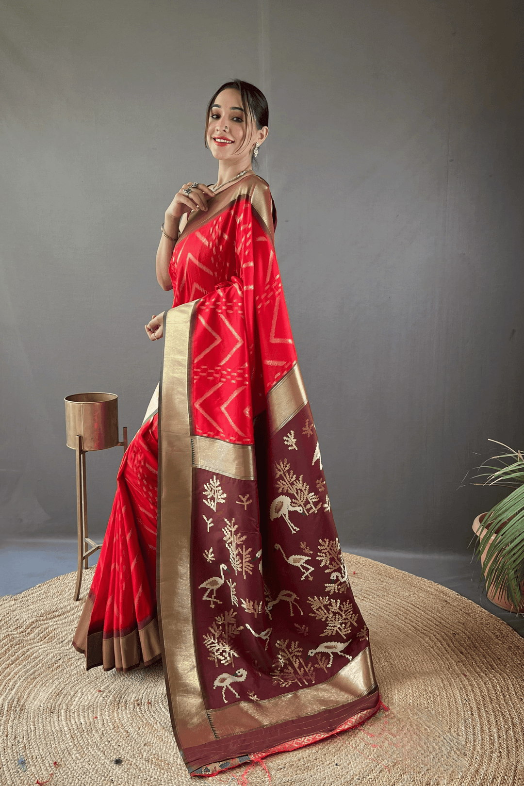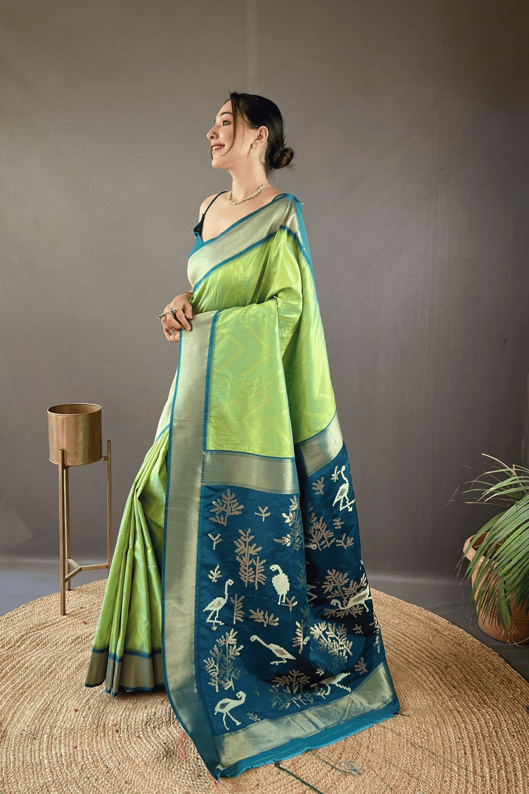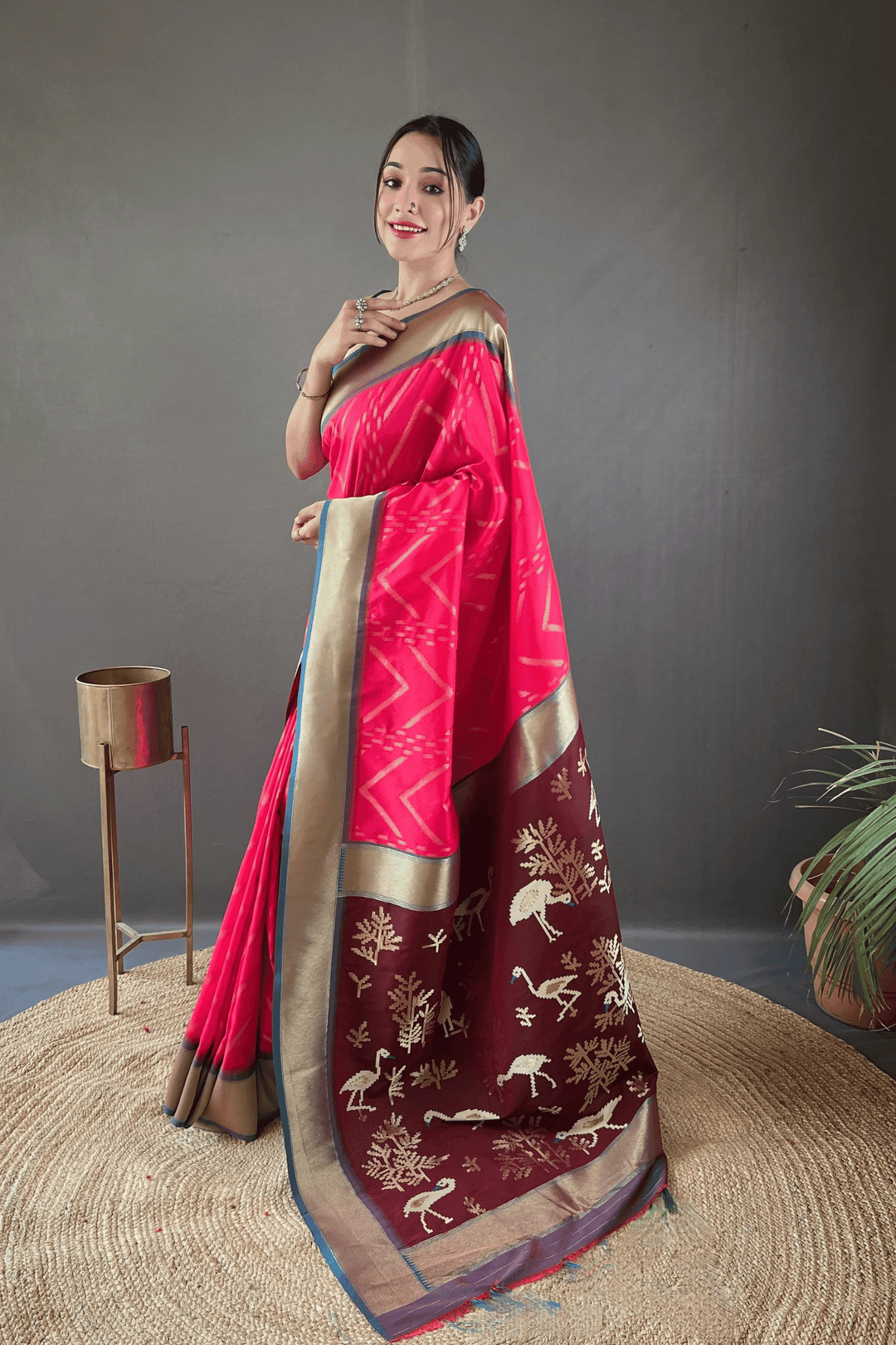 A Ready to Wear Printed Paithani Saree with stitched pleats woven with Grand paithani border. The soft silk saree comes along with tone-to-tone matching blouse.