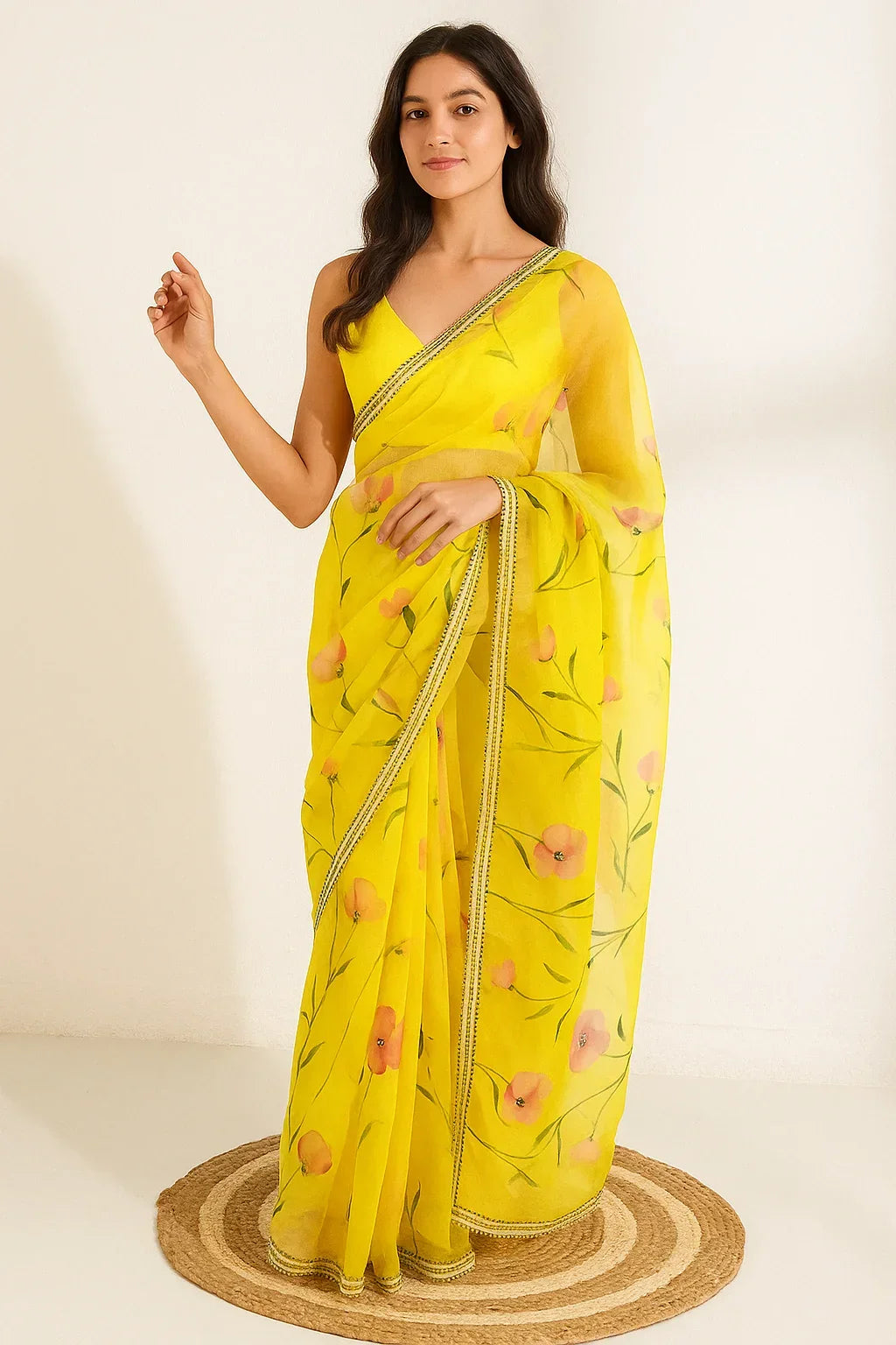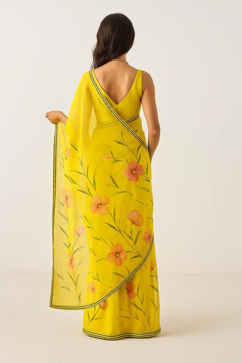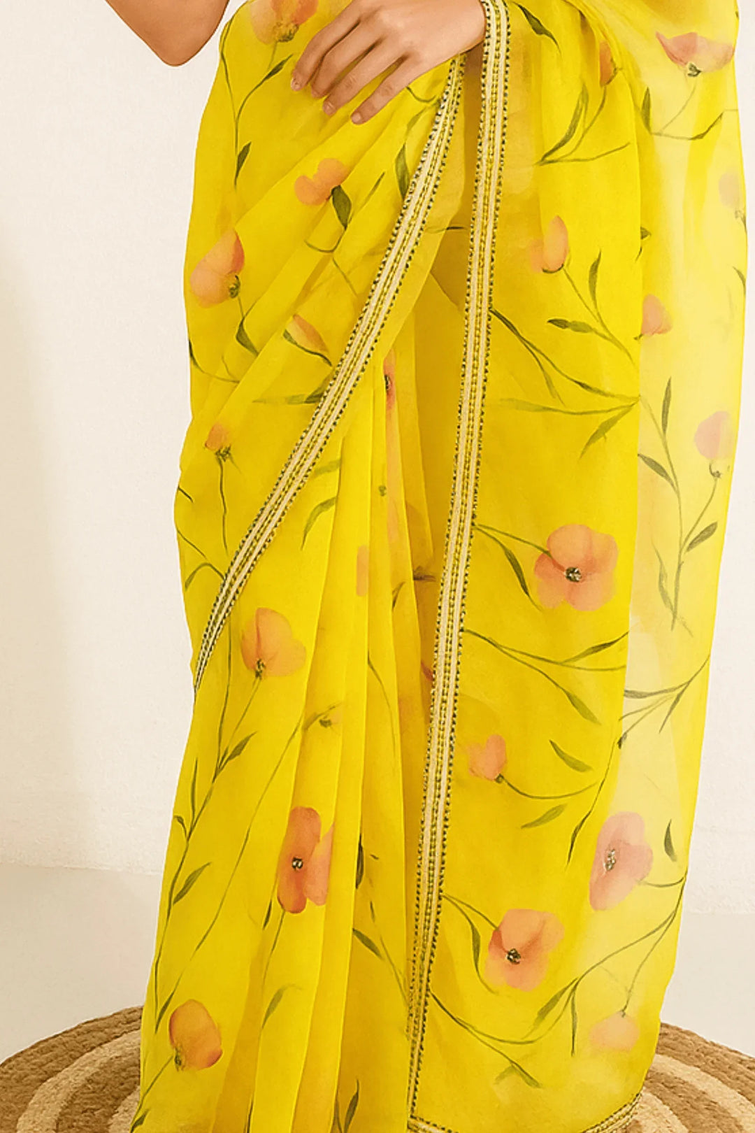 Poppy Sorbet | Ready-to-Wear Yellow Floral Organza Saree