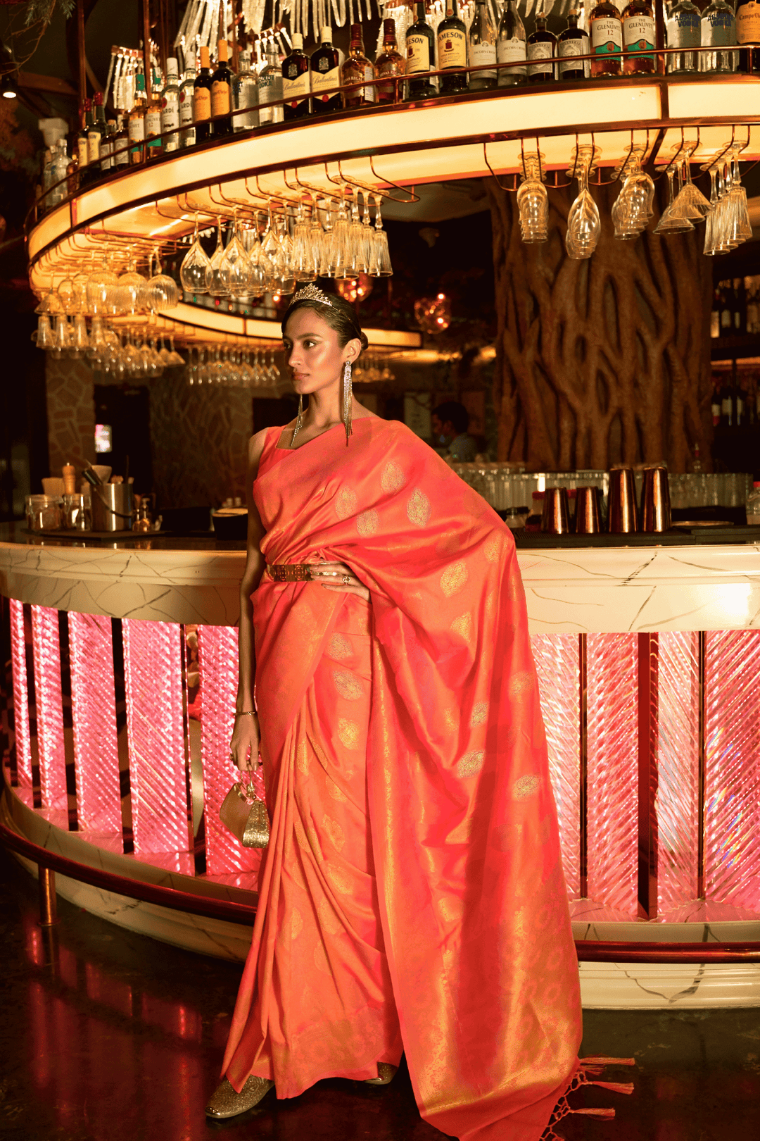 About: Introducing our vibrant ready-to-wear Banarasi Silk Saree, a true masterpiece that is perfect for weddings and other special occasions. The saree comes with a contrasting blouse piece and stitched waist pleats customizable till 5xl size.