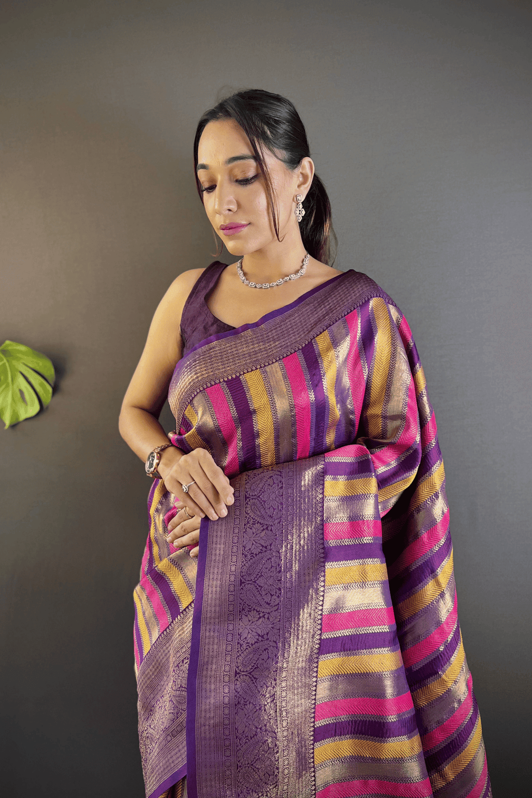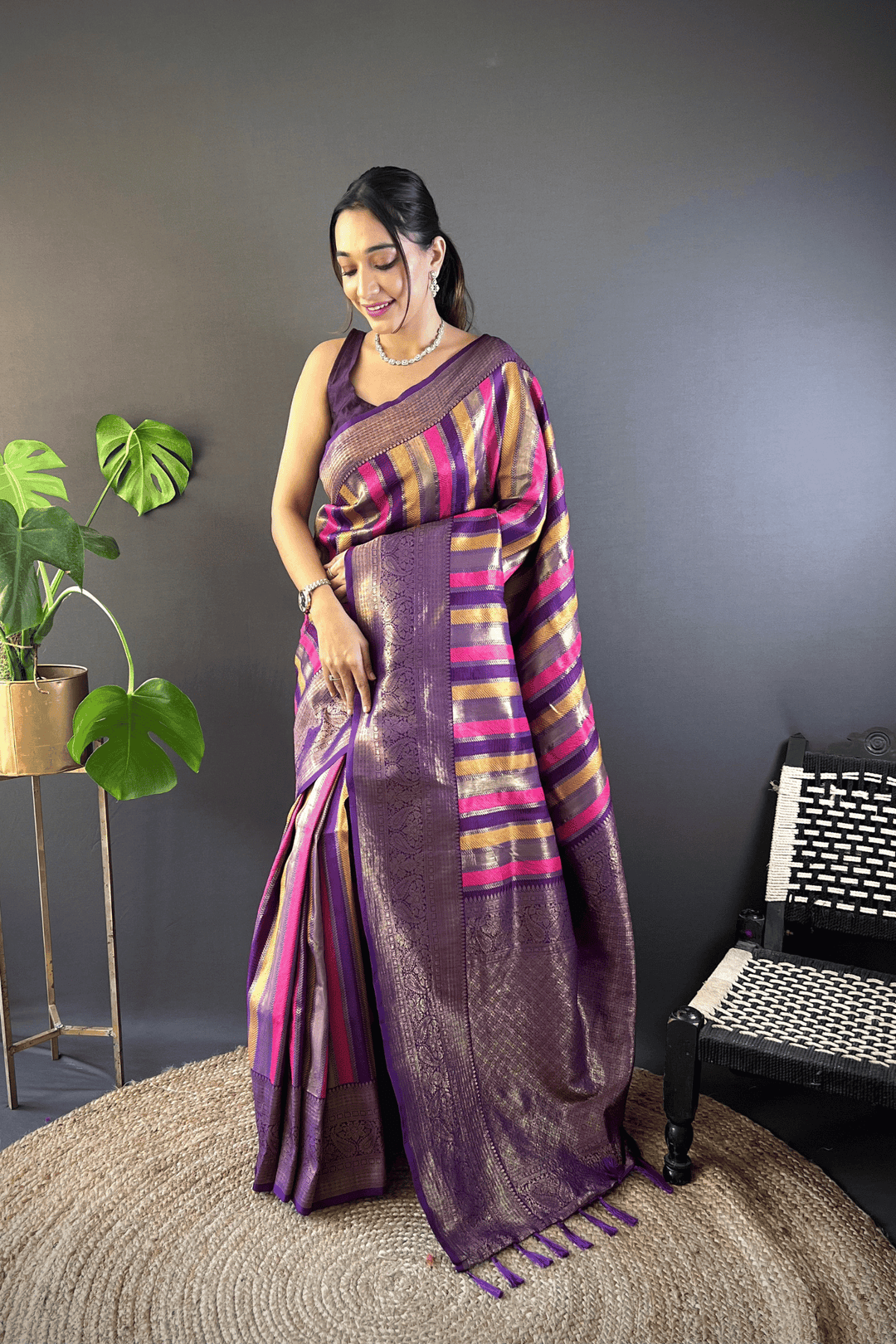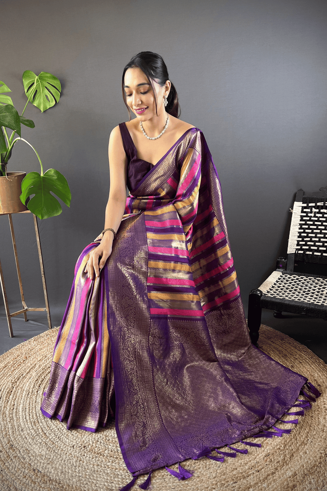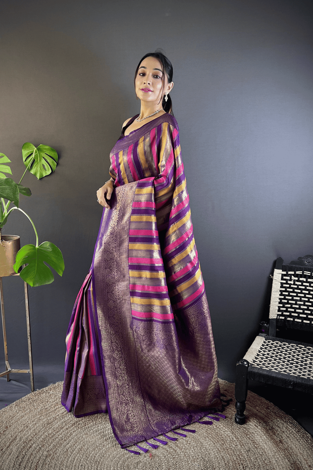 Pre Stitched Violet Multicolor Banarasi Silk Saree