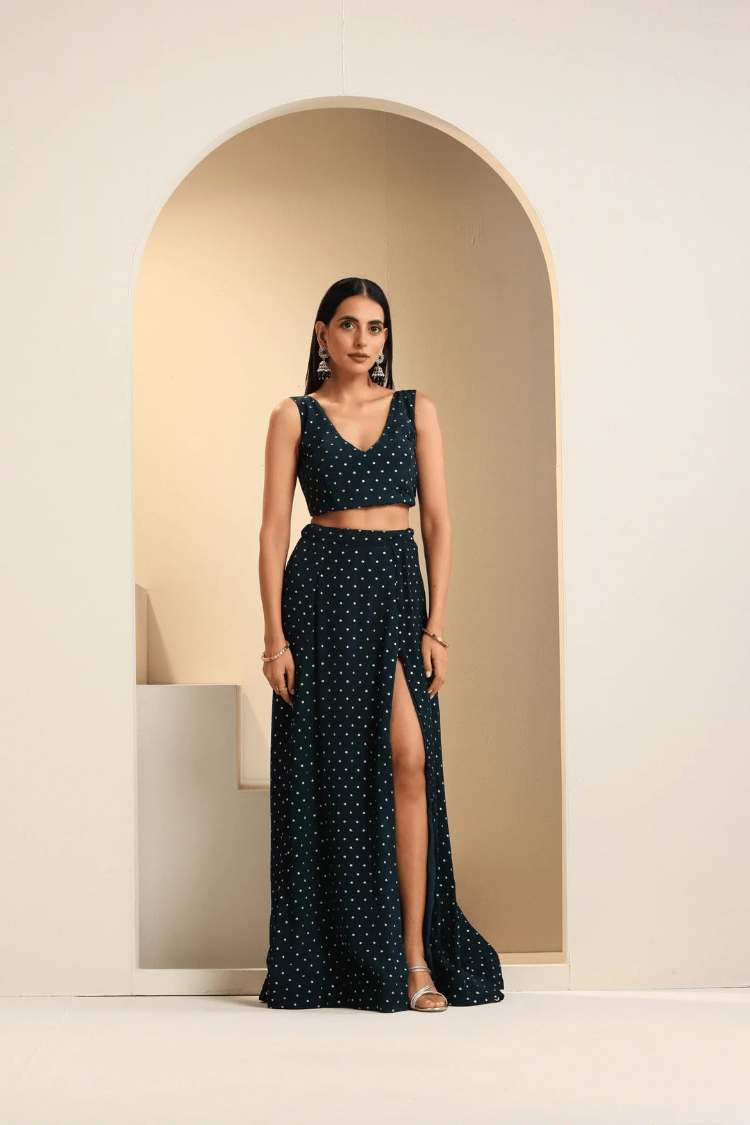 Pretty in Power is not just an outfit; it’s a whole mood. Crafted in rich teal Chanderi, this ready-to-wear blouse and slit skirt set blends ethnic grace with runway sass. The deep V-neck blouse is mirror-dotted for that subtle bling, while the high-slit lehenga-style skirt gives you legs-for-days energy.