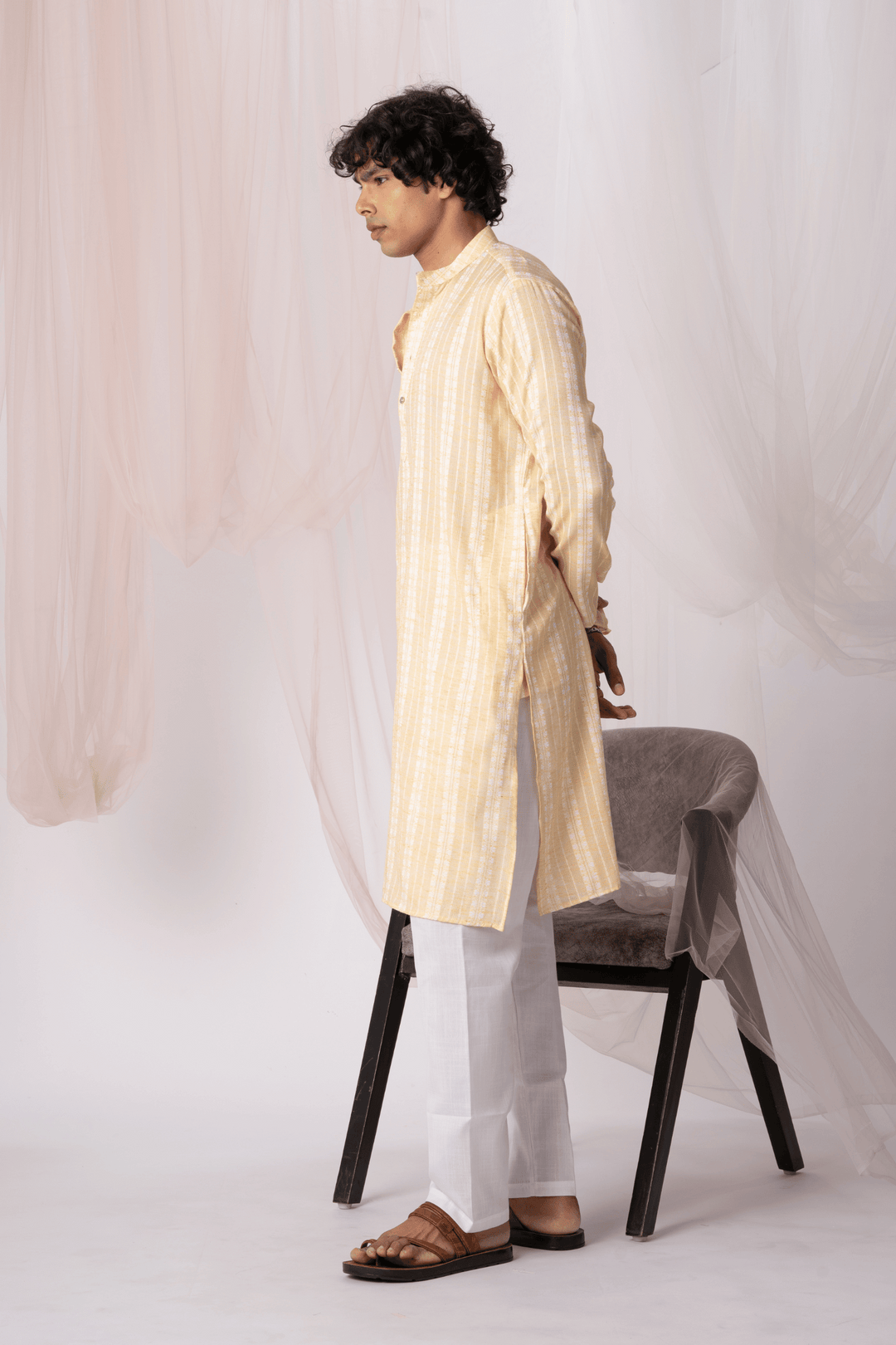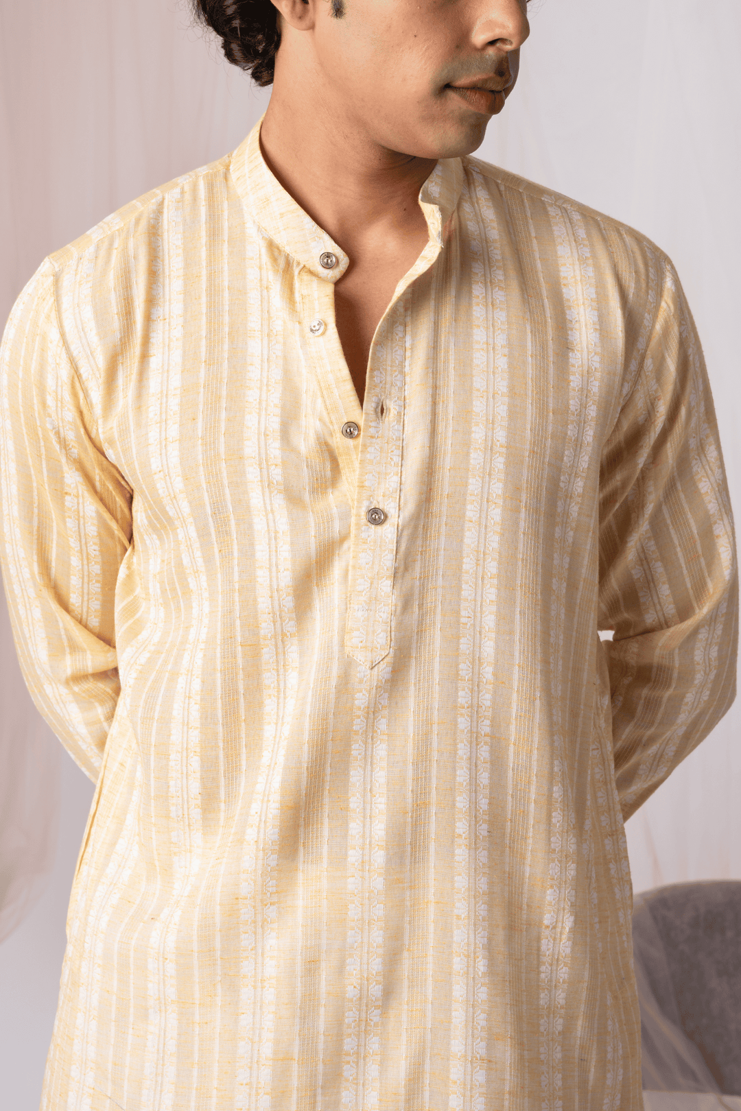 Radiant Yellow Charm Kurta crafted for modern celebrations—stylish, comfortable, and perfect for weddings or festive nights. This lightweight Men's Kurta in Cotton is an ideal choice for Diwali or wedding festival.
