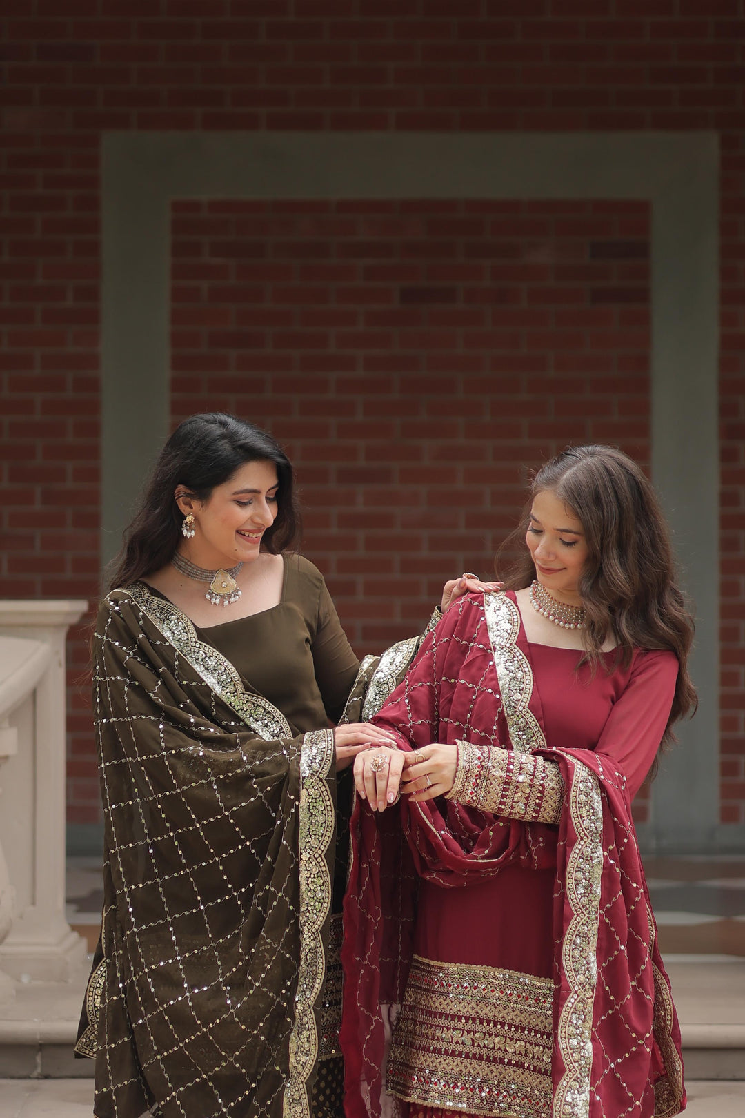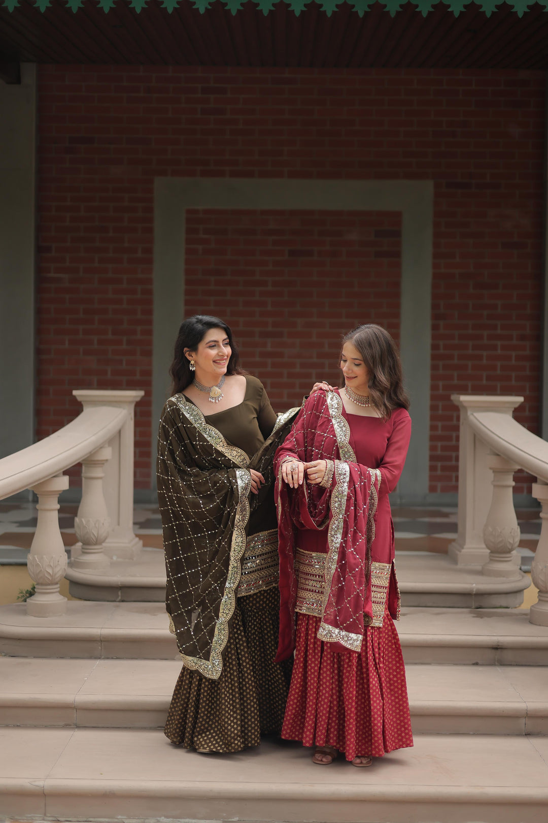 Indulge in opulence with our Sharara suit ideal for Ramadan celebrations. Adorned with Jacquard Sequins and intricate zari embroidery, this ensemble radiates sophistication, making it a perfect choice for both festive occasions and special gatherings where you want to make a statement with your style.