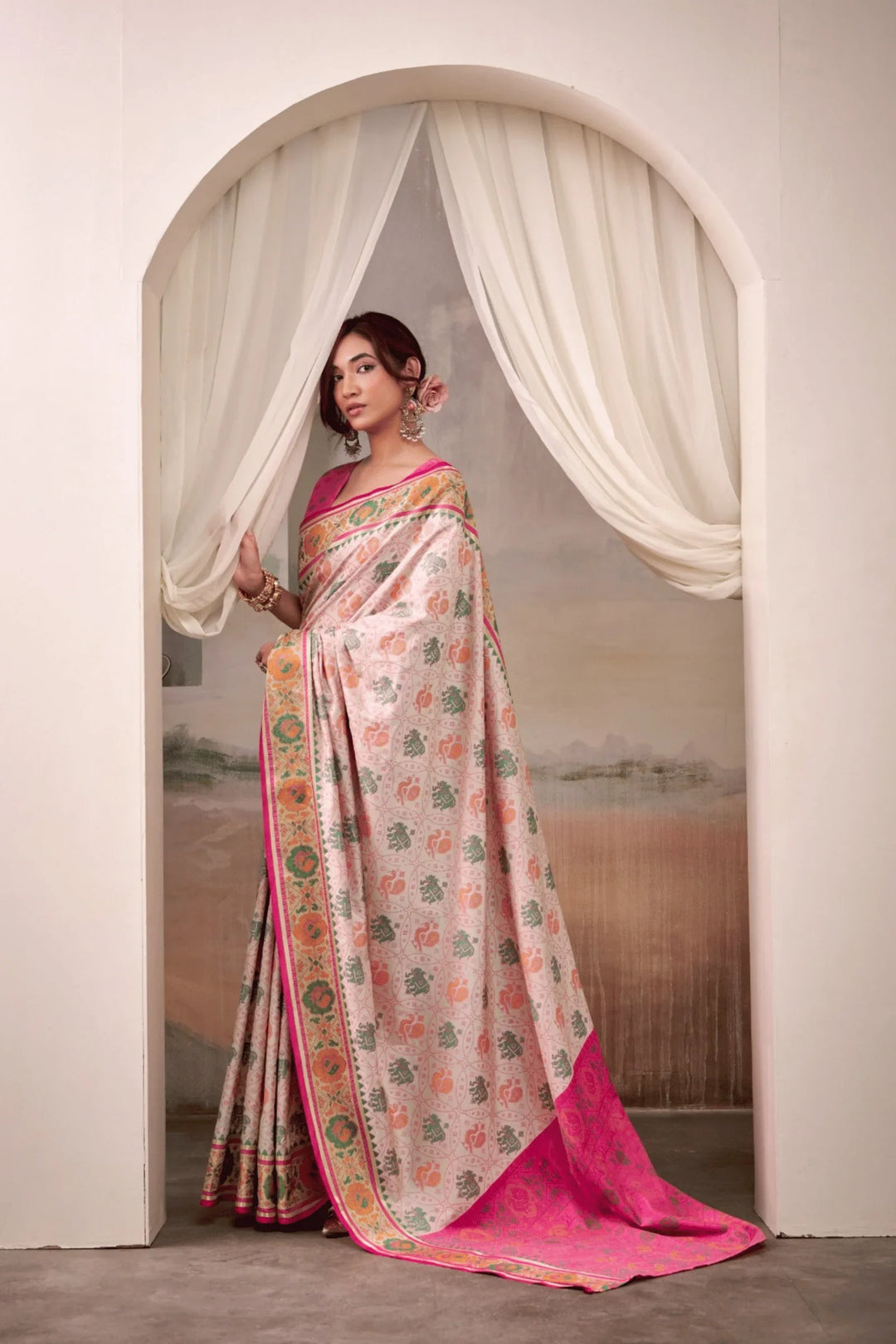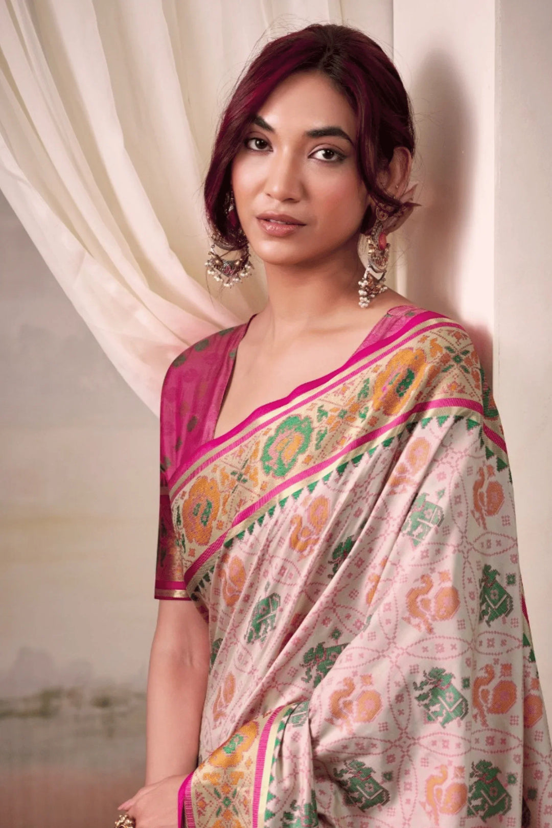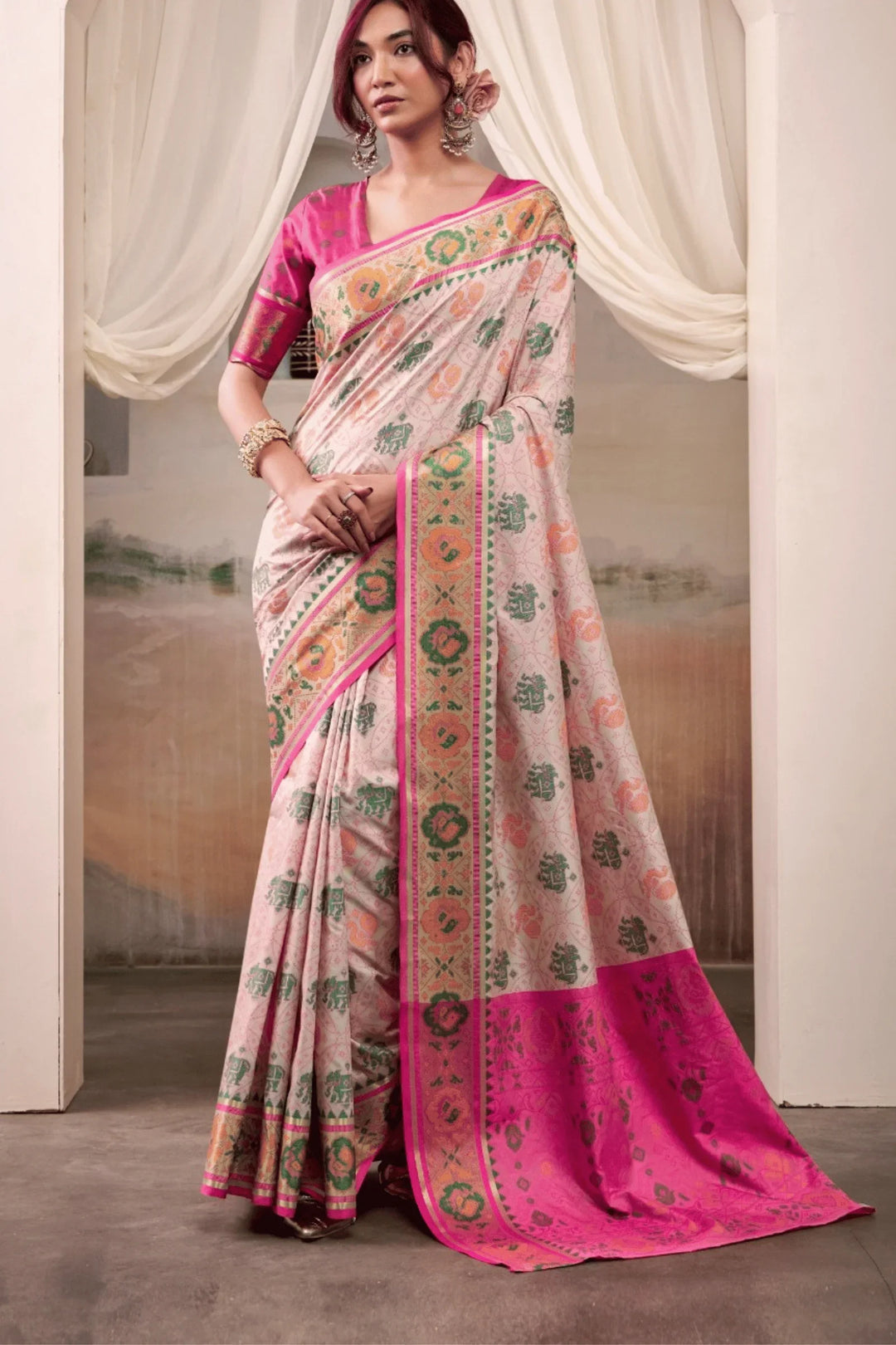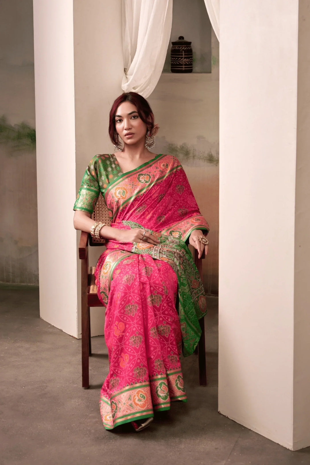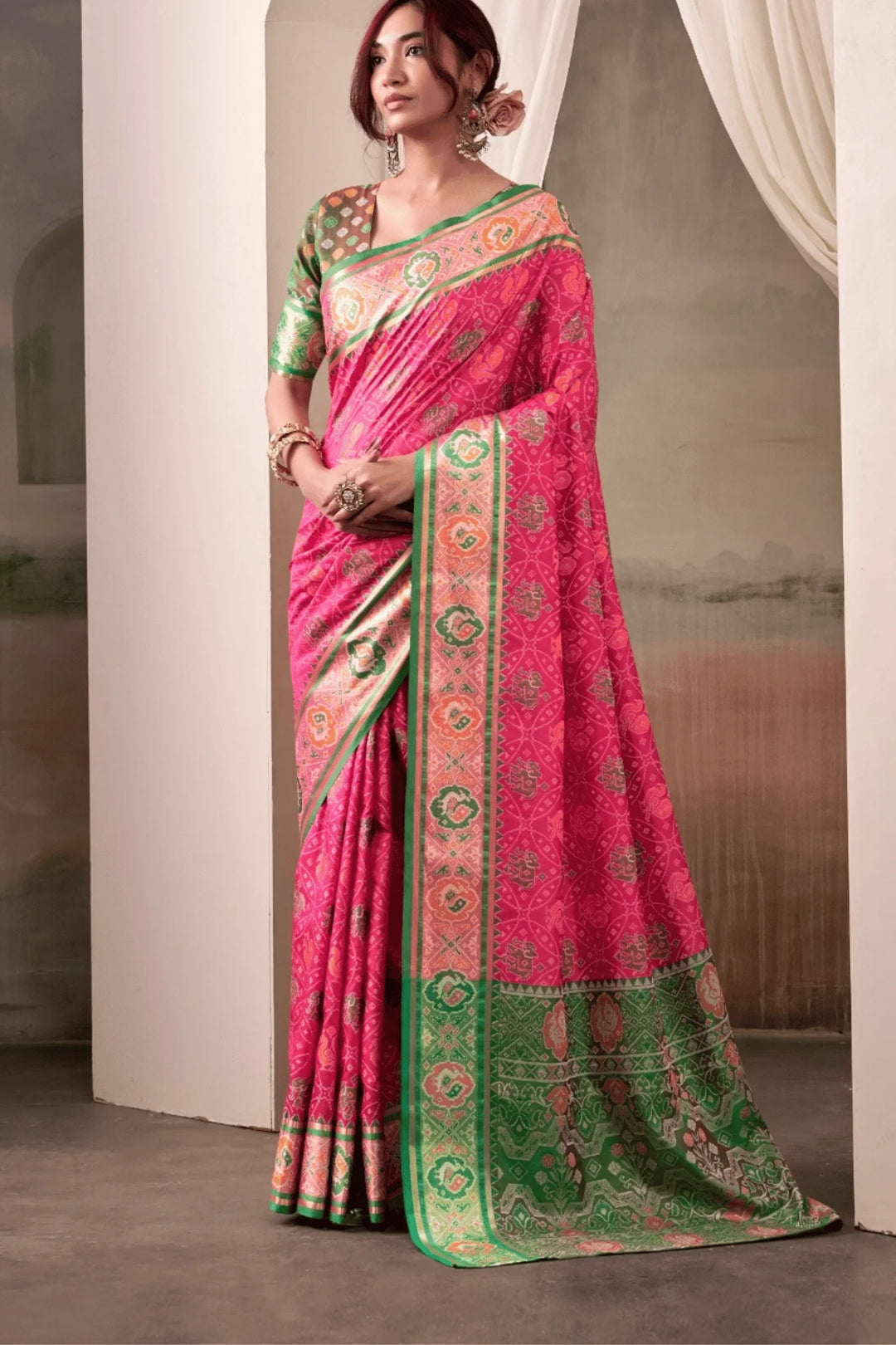 The Patola originates from Gujarat, where Patola weaving has been a symbol of royalty and heritage for centuries. Known for its intricate motifs, double ikat patterns, and vibrant hues, Patola sarees are timeless heirlooms. This pink saree carries forward the same legacy with a modern twist—delicate weaves on soft silk, enriched with a luxurious finish.