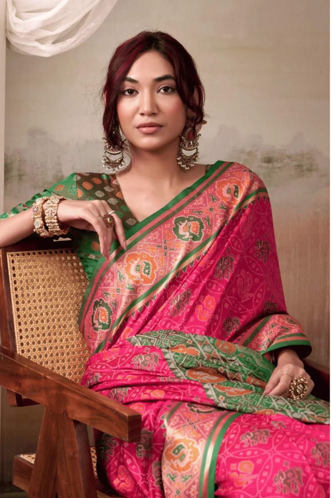 The charm of a pink saree lies in its ability to exude femininity, grace, and vibrance. Our Patola soft silk saree in a striking pink shade makes it perfect for both day and evening events. Pair it with silver jewelry for subtle sophistication, or go bold with gold and temple jewelry for weddings and traditional functions. Its universal appeal makes it a must-have in every wardrobe.