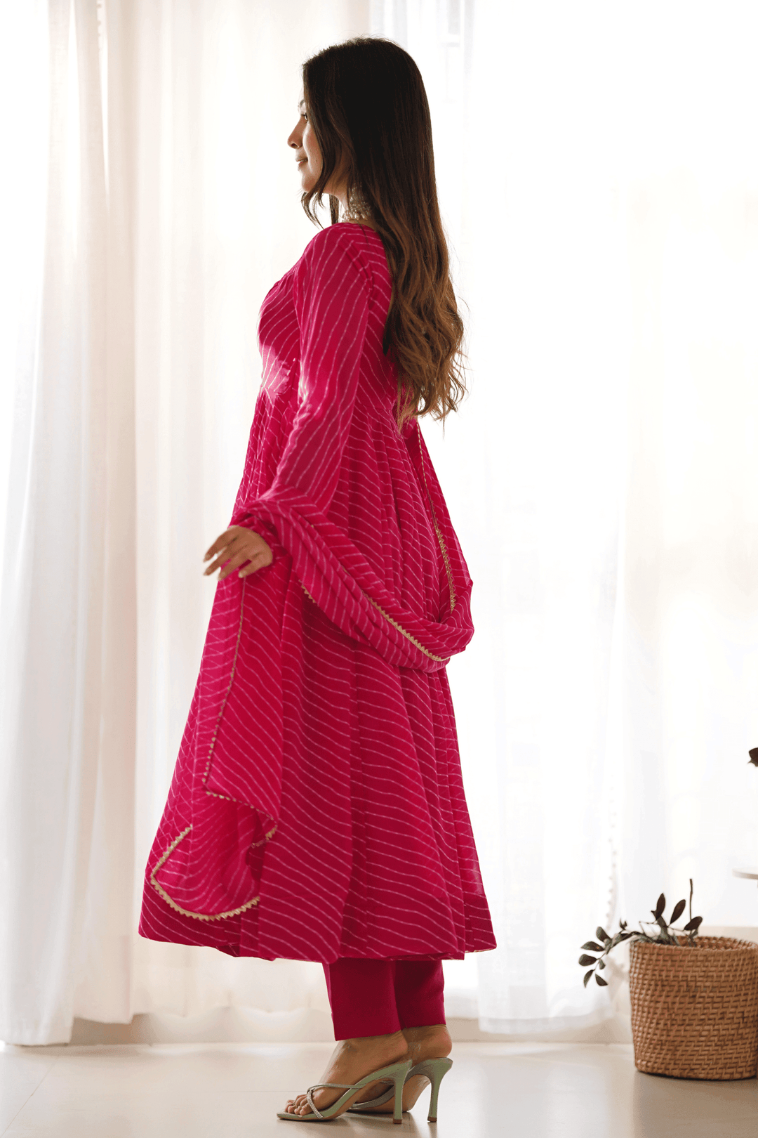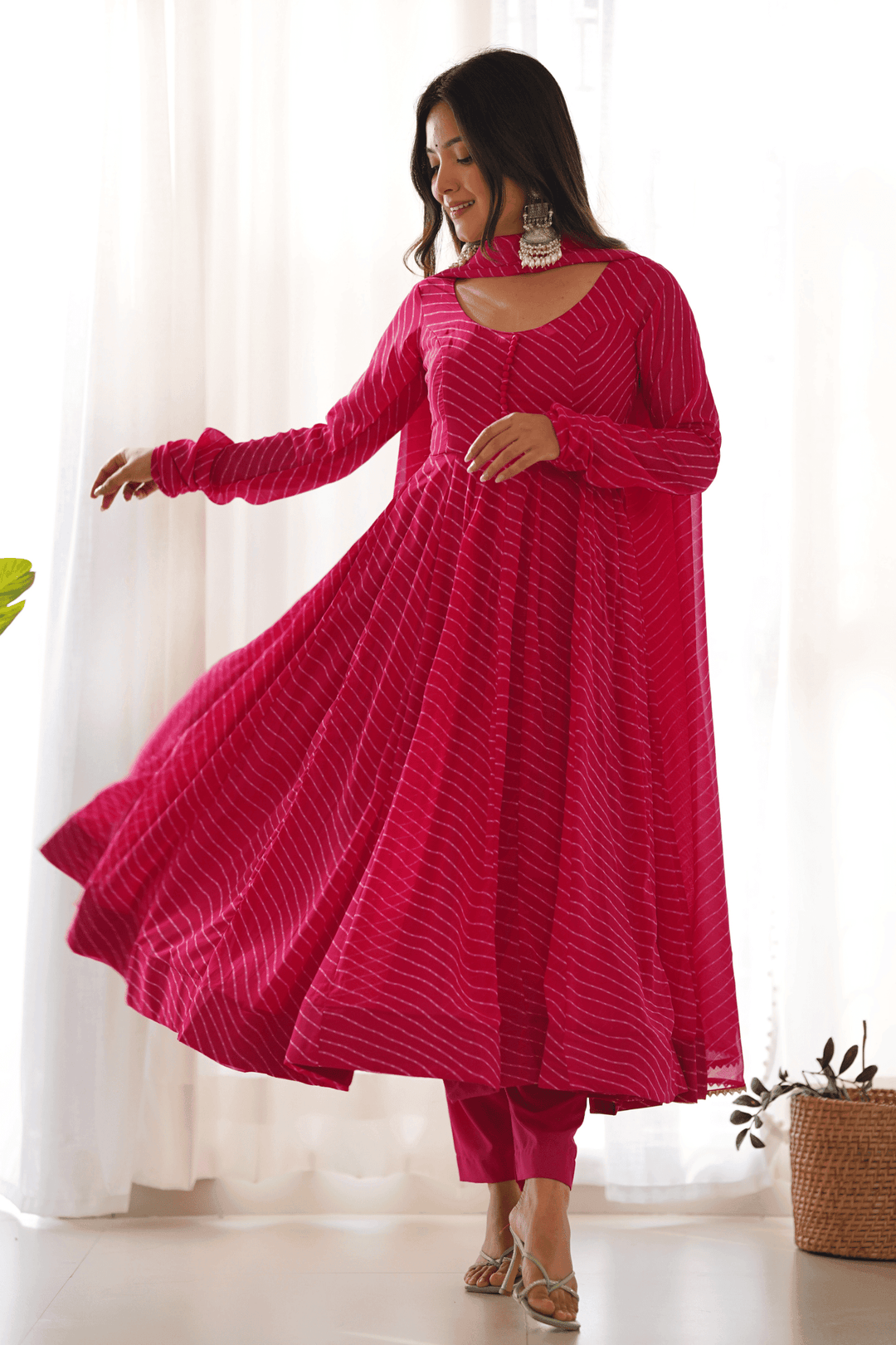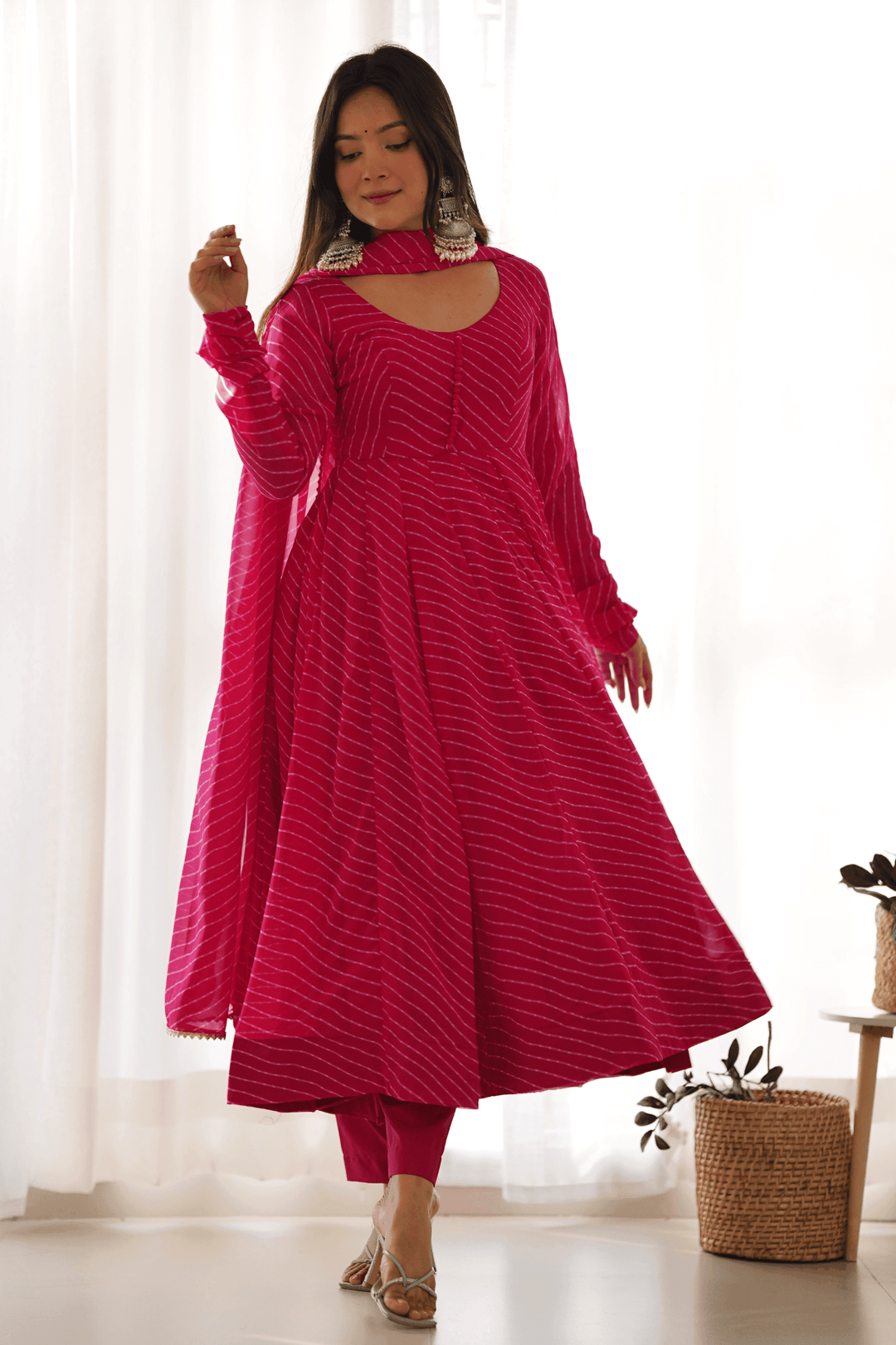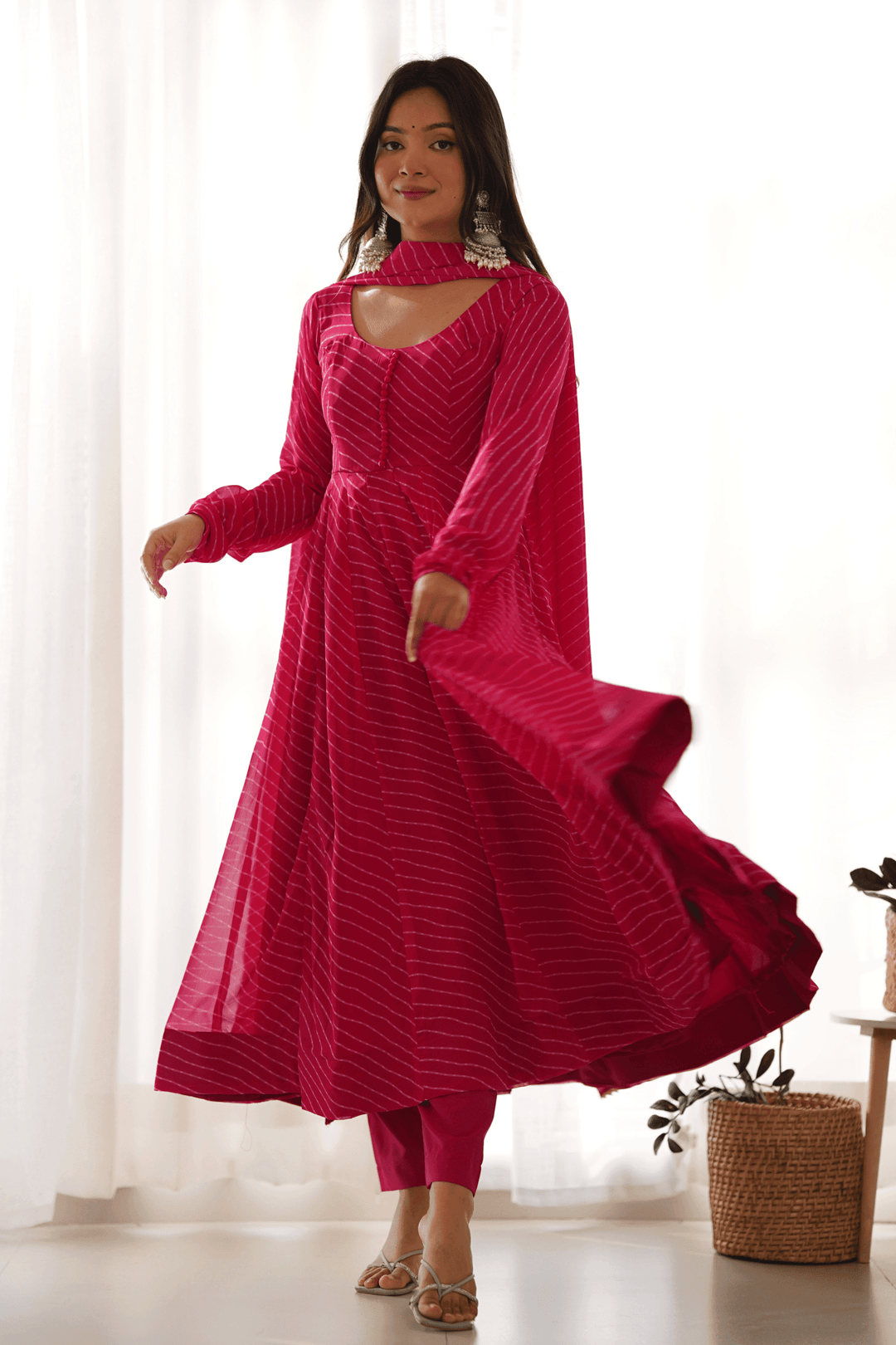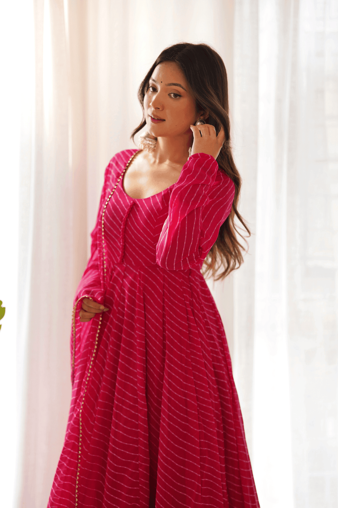 Introducing Glamwiz Pink Leheriya Print Anarkali Suit, a blend of sophistication and allure. The deep, rich tones blend seamlessly, creating a stunning and sophisticated look.