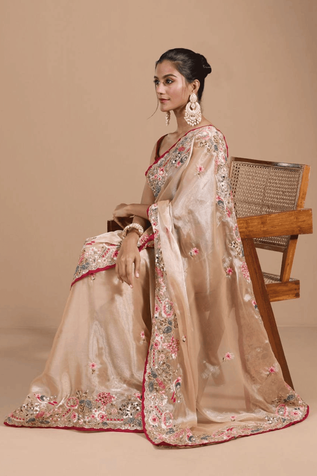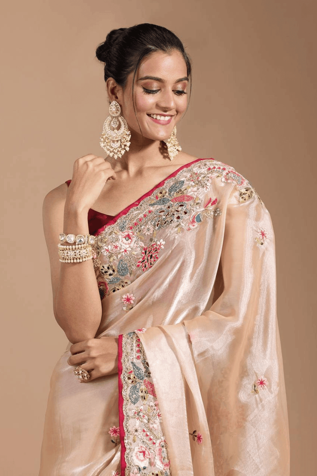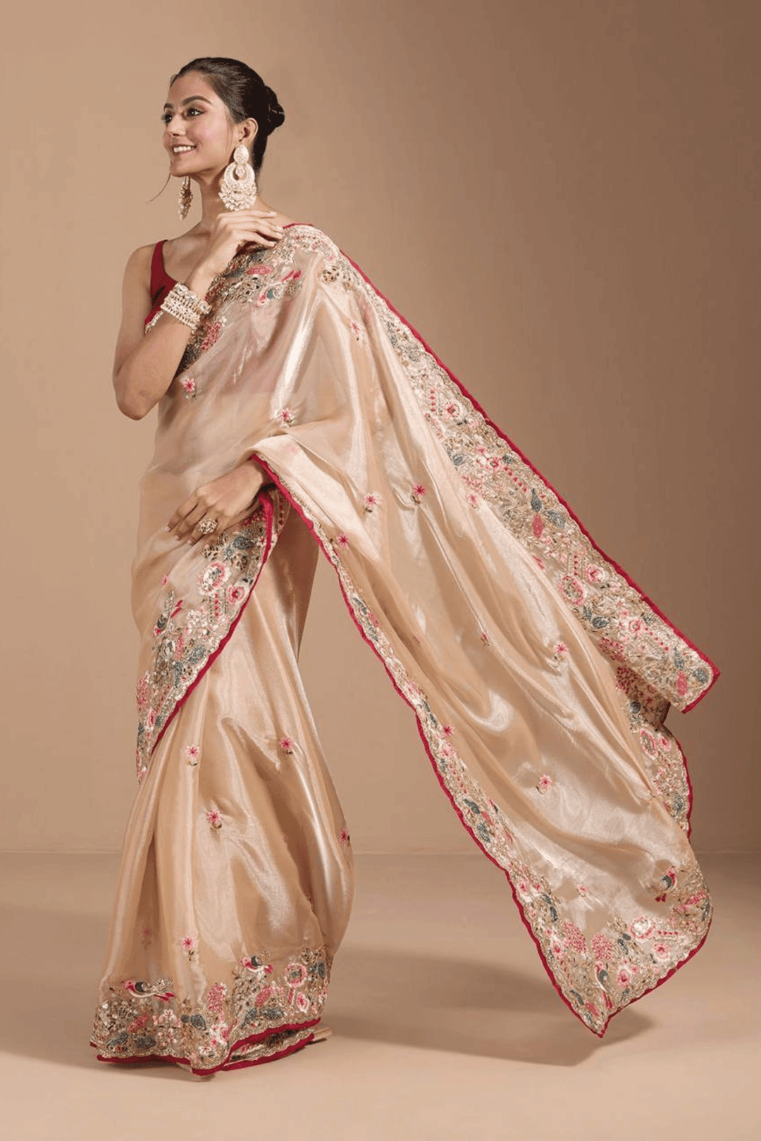 Indulge in the ethereal beauty of the Ready to Wear Almond White Jimmy Choo Saree, a perfect saree for Diwali or wedding season. The saree's rich beige hue evokes a sense of mystery and romance, making it perfect for evening wear.