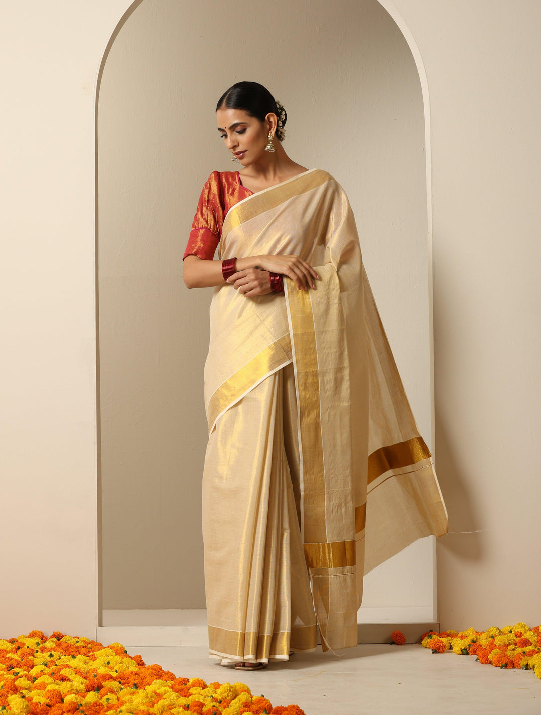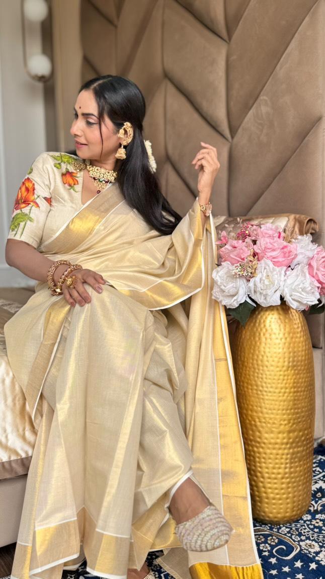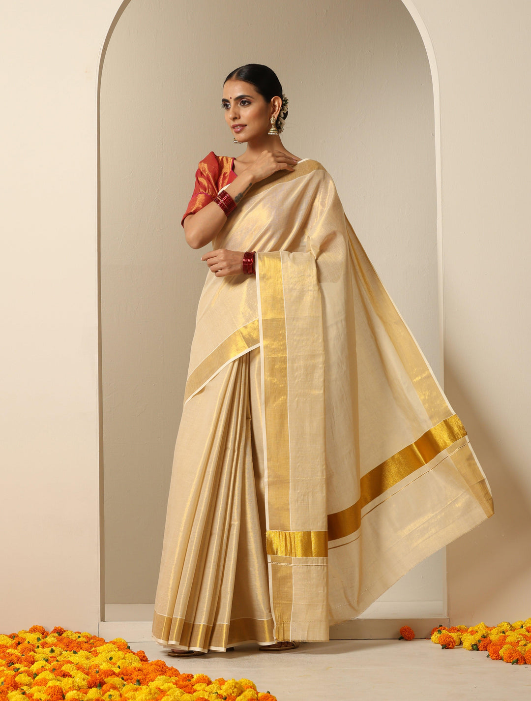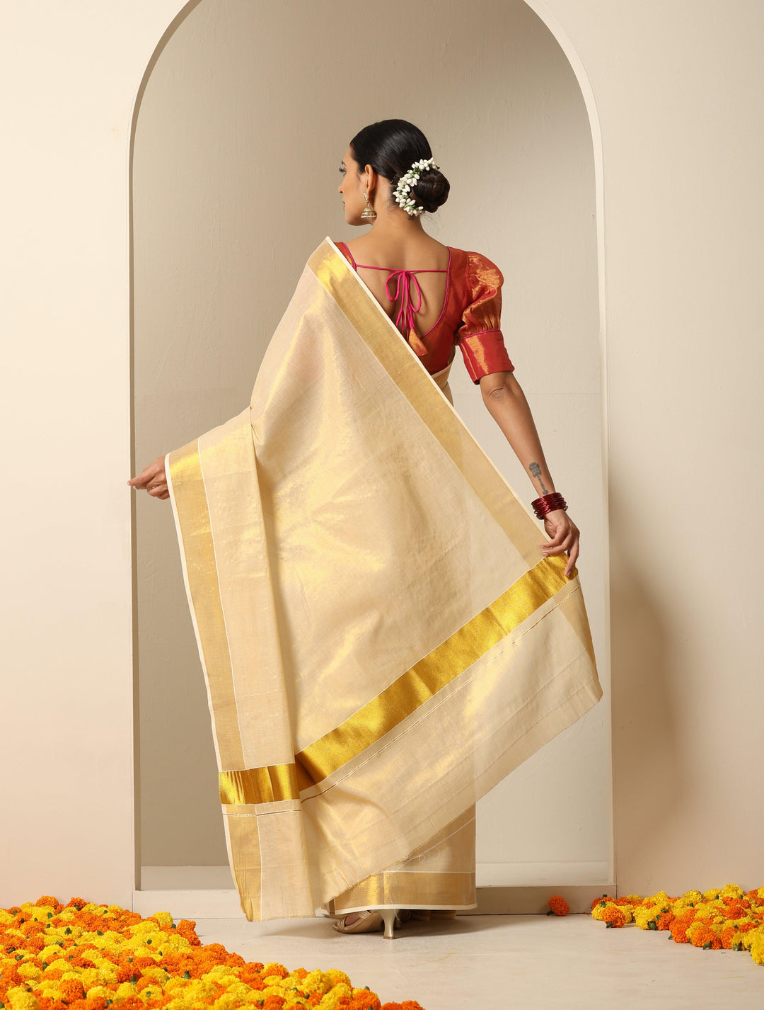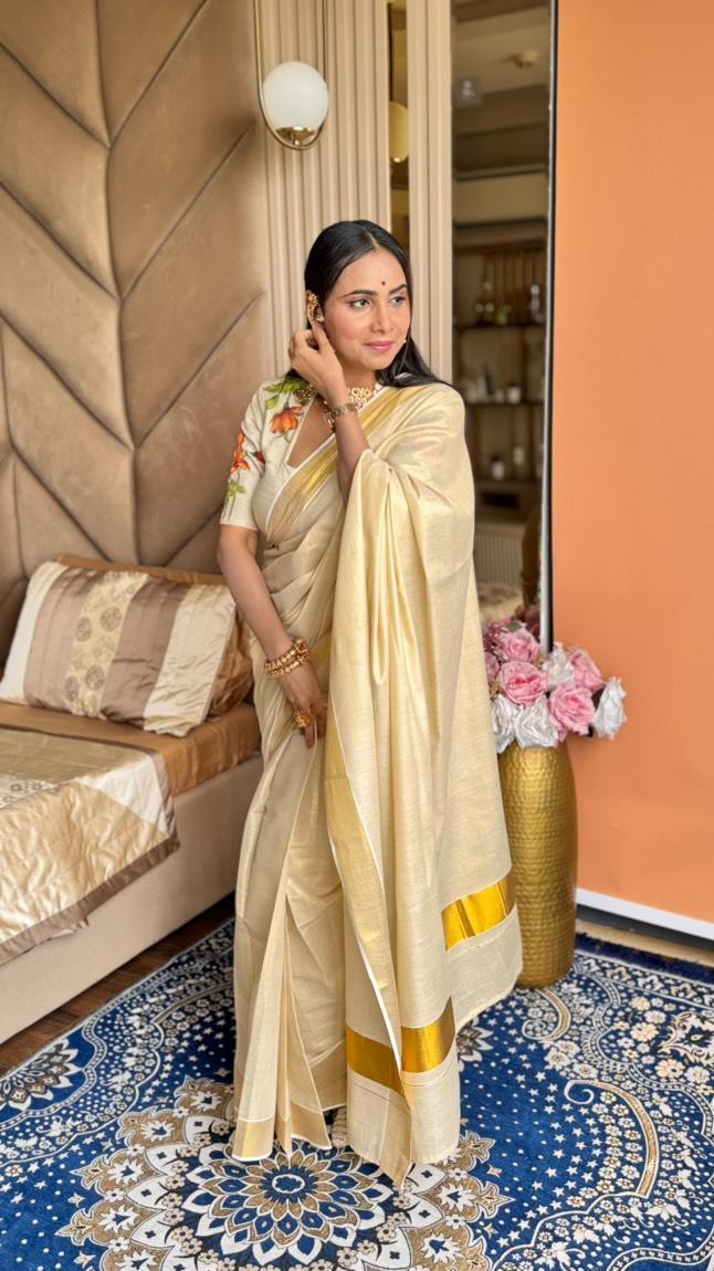 Indulge in the charm of tradition with our Ready-to-Wear Kasavu Kerala Saree, where every thread narrates a story of timeless beauty and grace. Perfect for any occasion, whether it's a traditional ceremony, or a formal gathering, this saree adds an aura of sophistication to your ensemble This Kasavu saree comes with stitched pleats, and is adjustable upto 3 XL