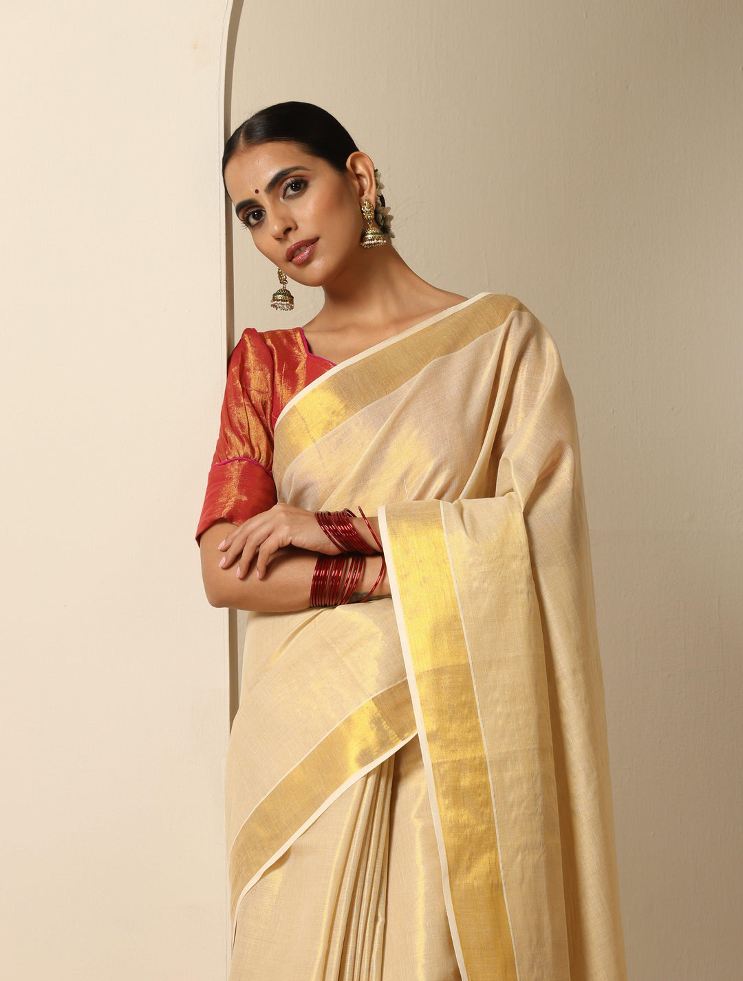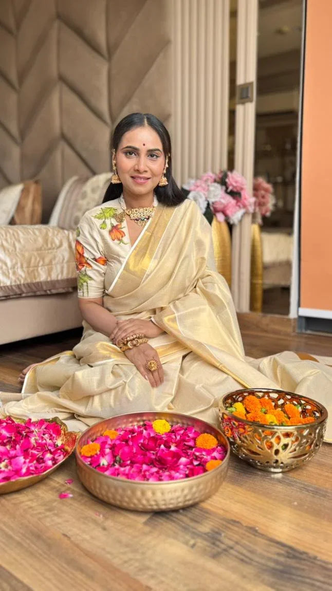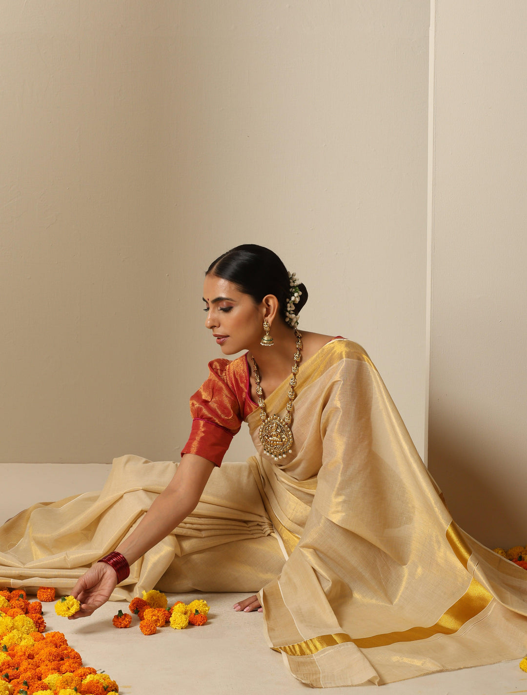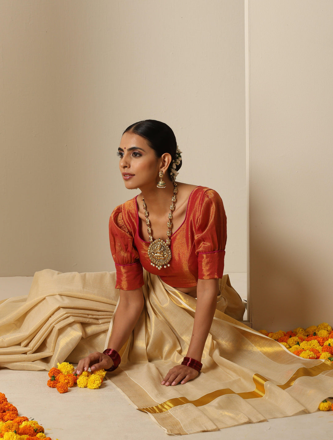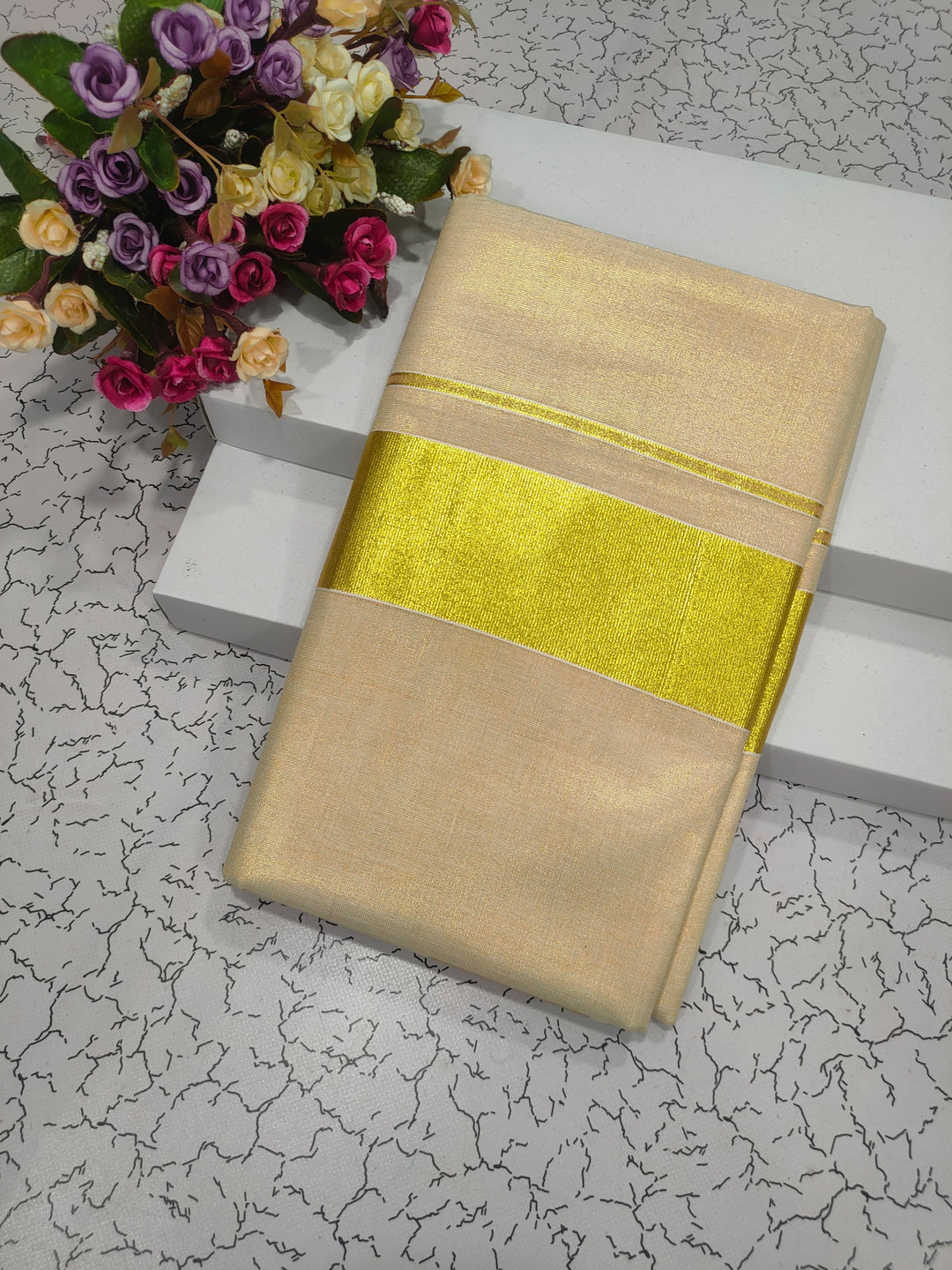 Indulge in the charm of tradition with our Ready-to-Wear Kasavu Kerala Saree, where every thread narrates a story of timeless beauty and grace. Perfect for any occasion, whether it's a traditional ceremony, or a formal gathering, this saree adds an aura of sophistication to your ensemble This Kasavu saree comes with stitched pleats, and is adjustable upto 3 XL