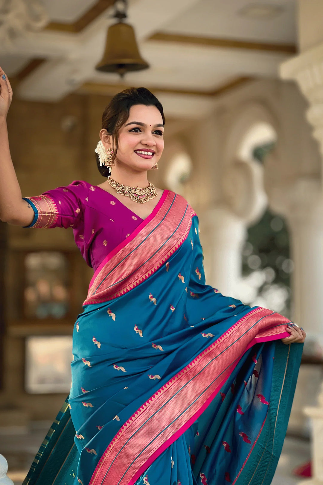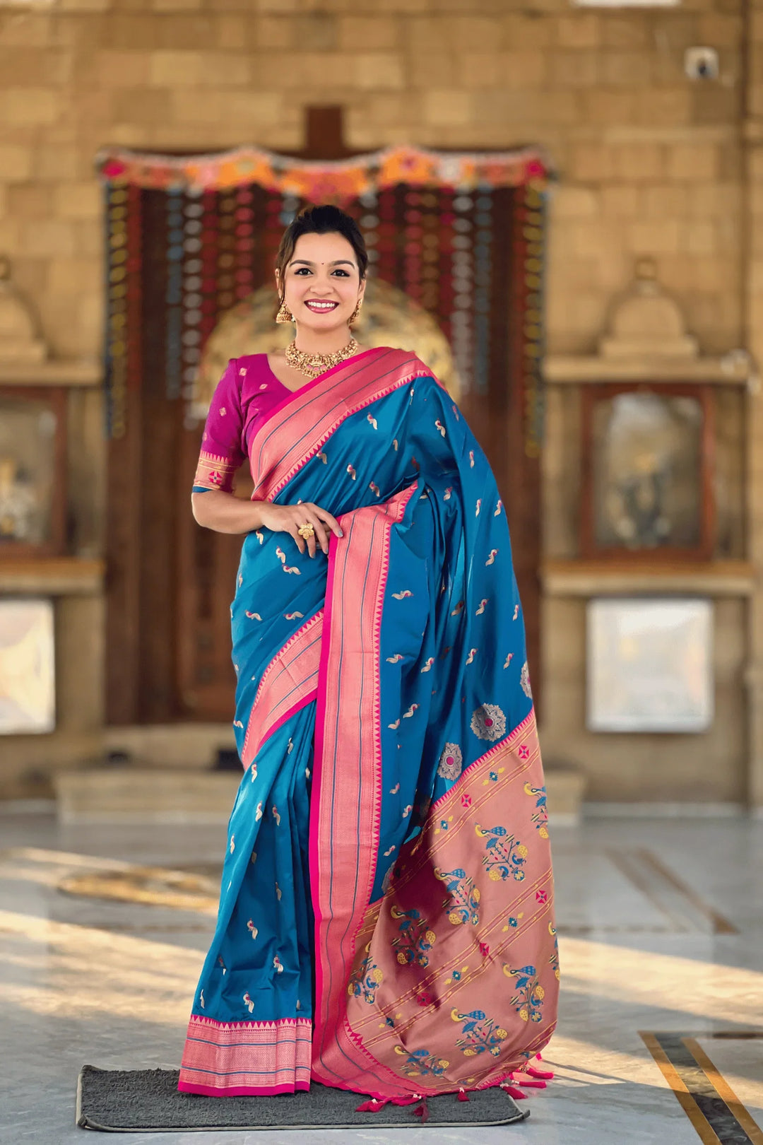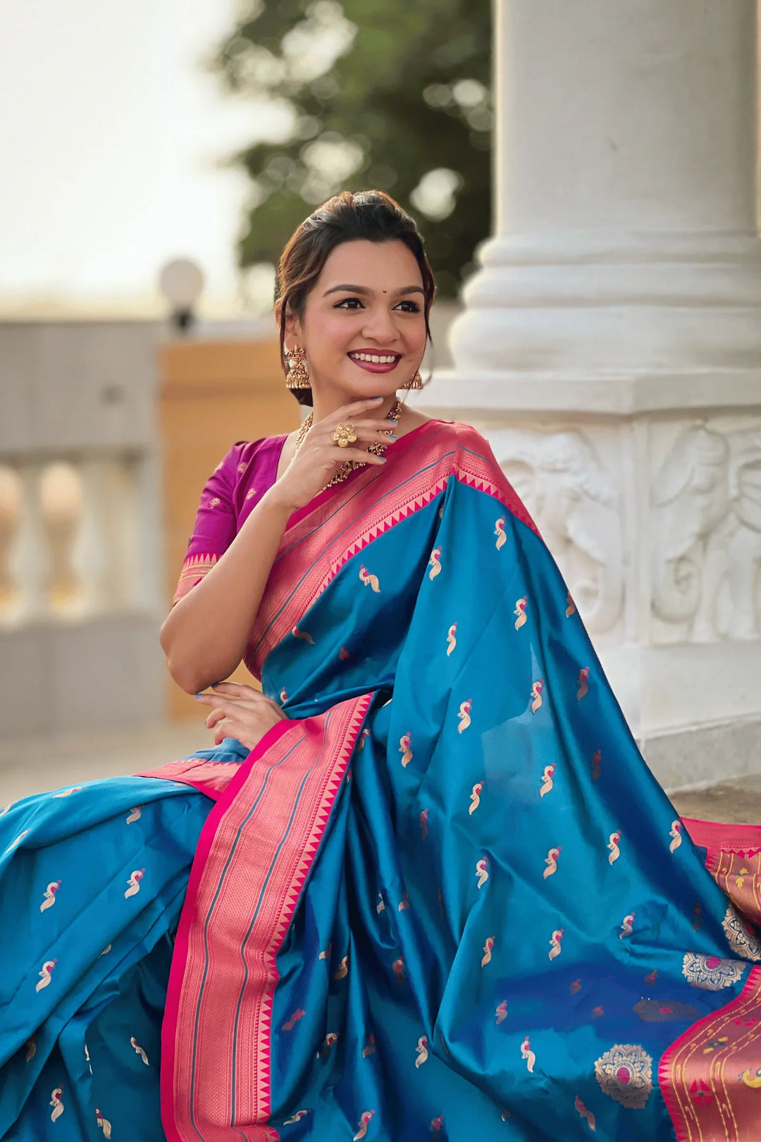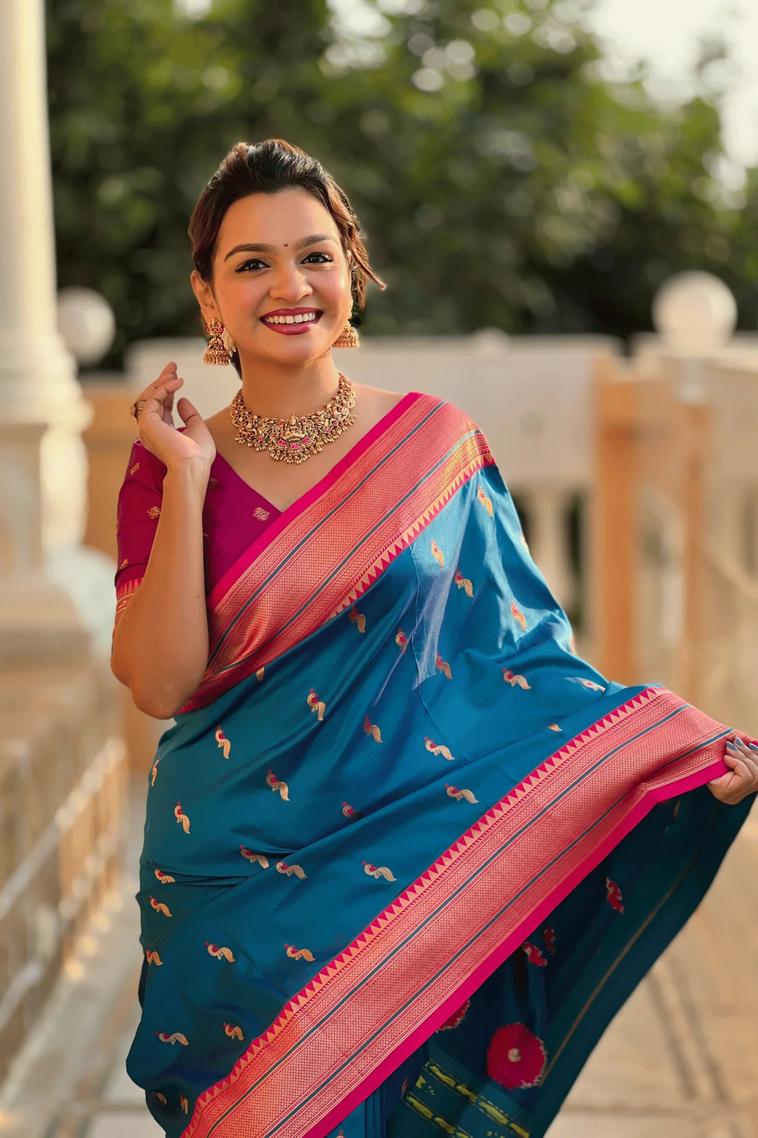 Introducing the Glamwiz Sky Blue Peacock Paithani Silk Saree. The saree has vibrant geometrical border with sophisticated pattern, ideal for office wear and social gatherings.