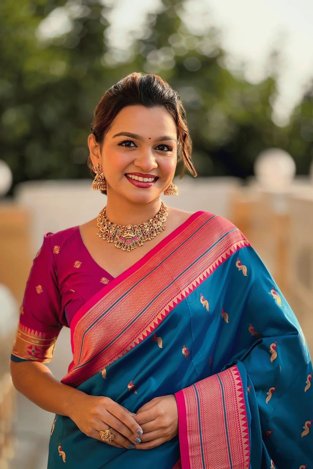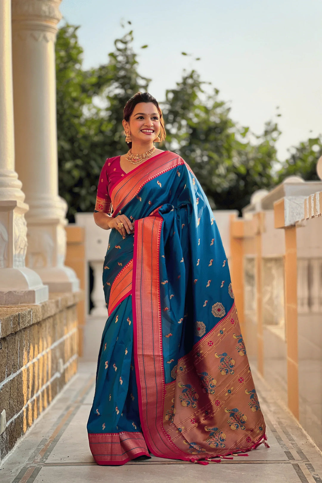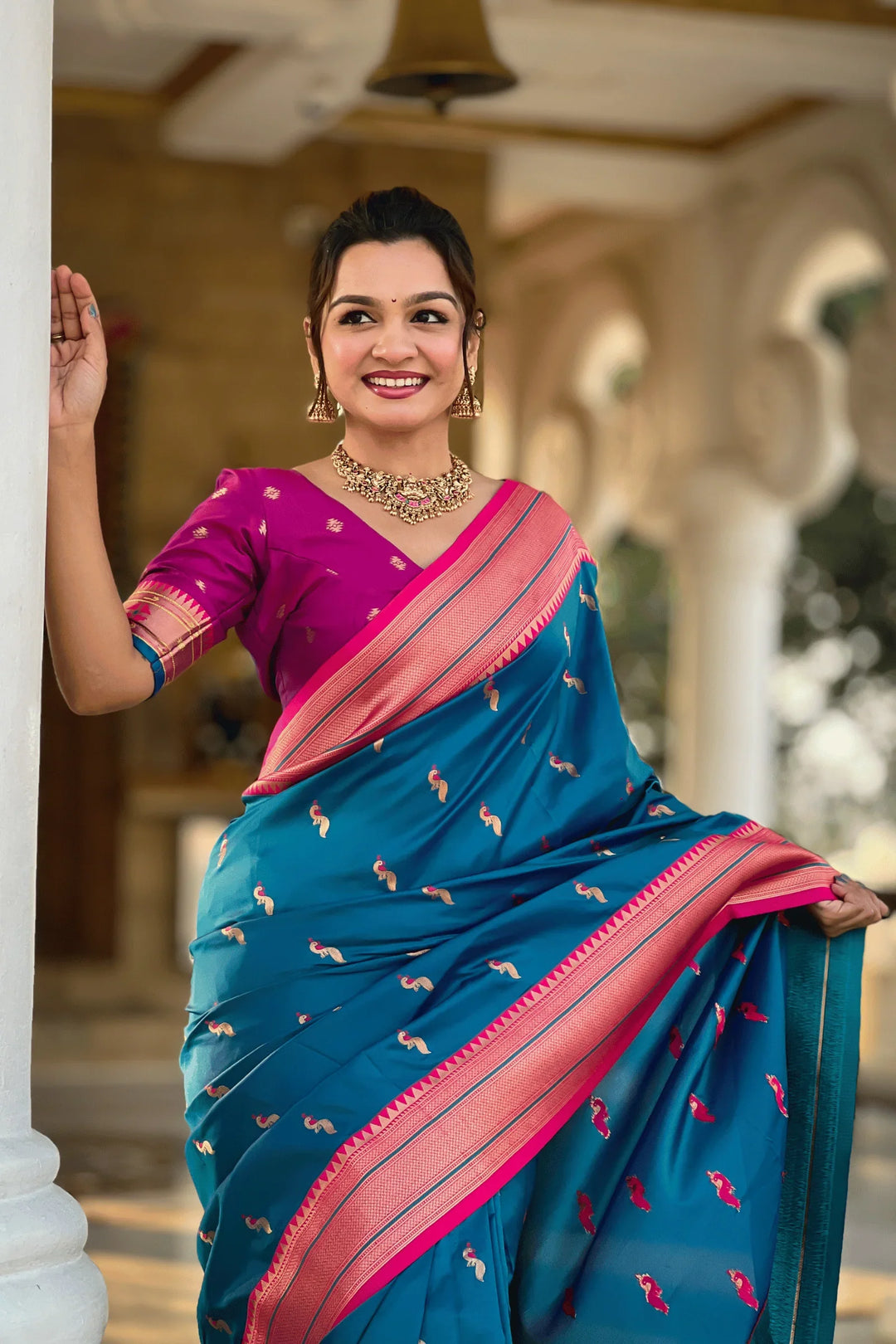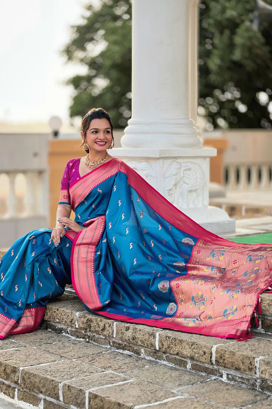 Introducing the Glamwiz Sky Blue Peacock Paithani Silk Saree. The saree has vibrant geometrical border with sophisticated pattern, ideal for office wear and social gatherings.