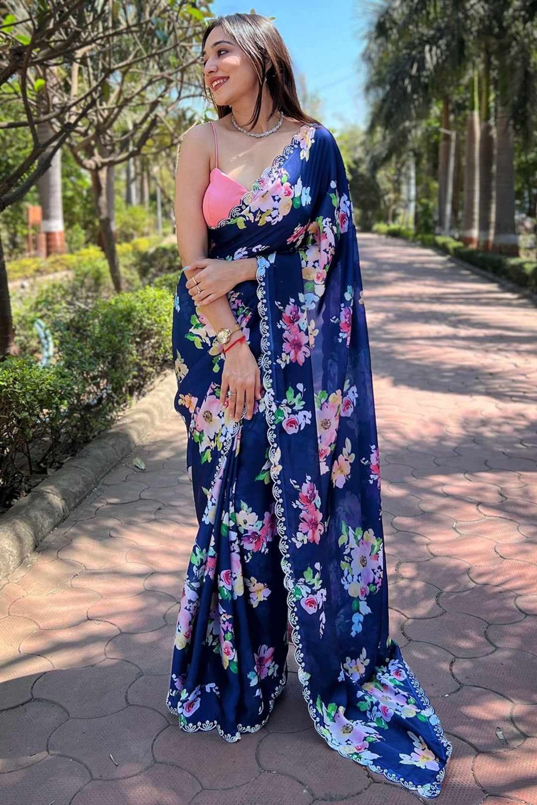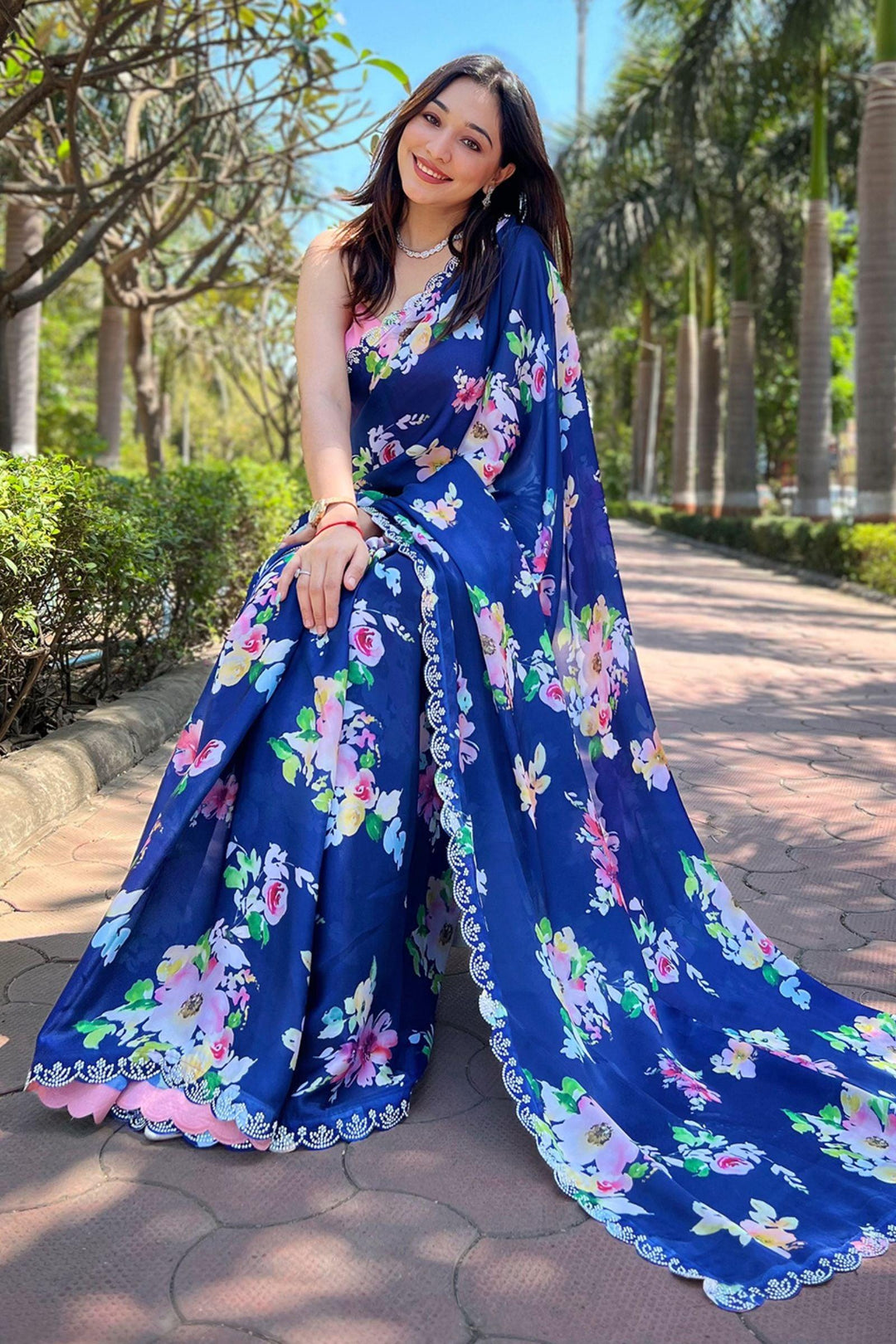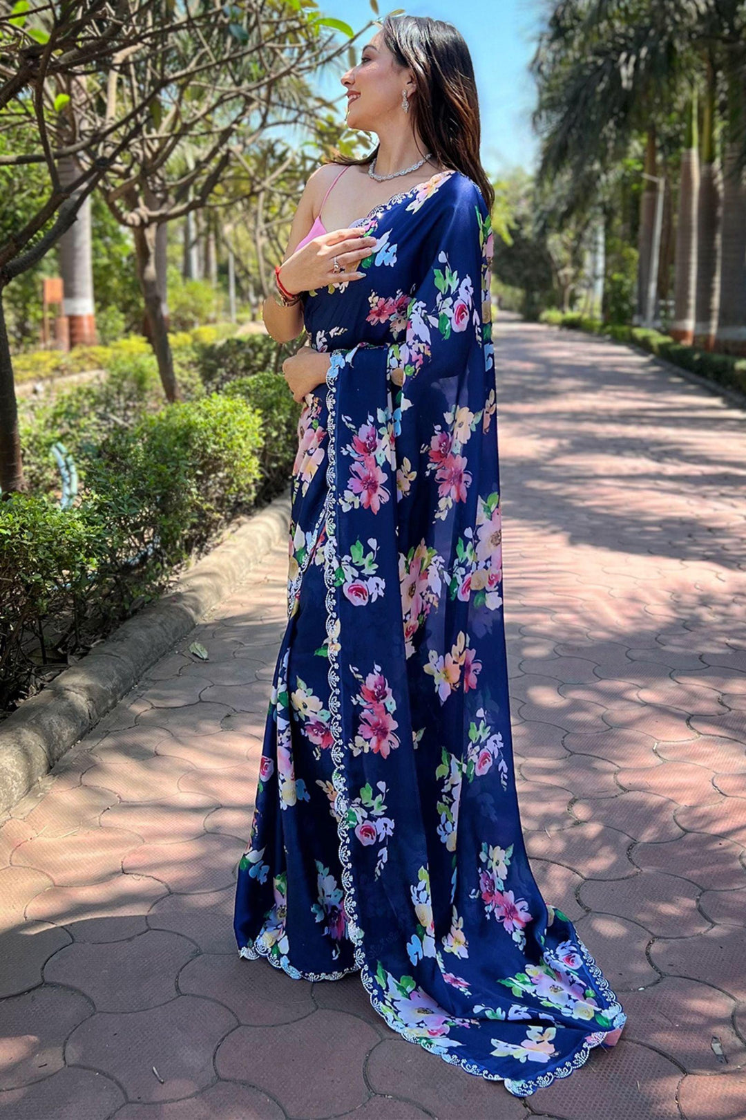 Dive into elegance with our Ready To Wear Blue Floral Georgette Saree, featuring a luxurious pure satin georgette adorned with captivating floral prints. Embellished with a lavish zircon Swarovski border, this Glamwiz masterpiece seamlessly blends tradition and convenience, ensuring you shine with timeless grace at any affair.
