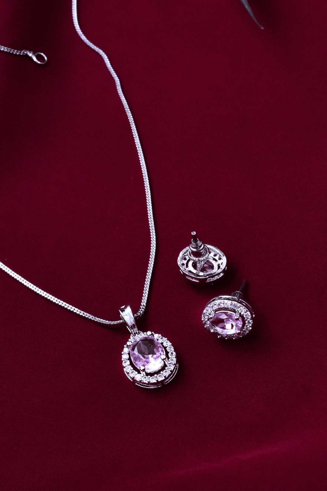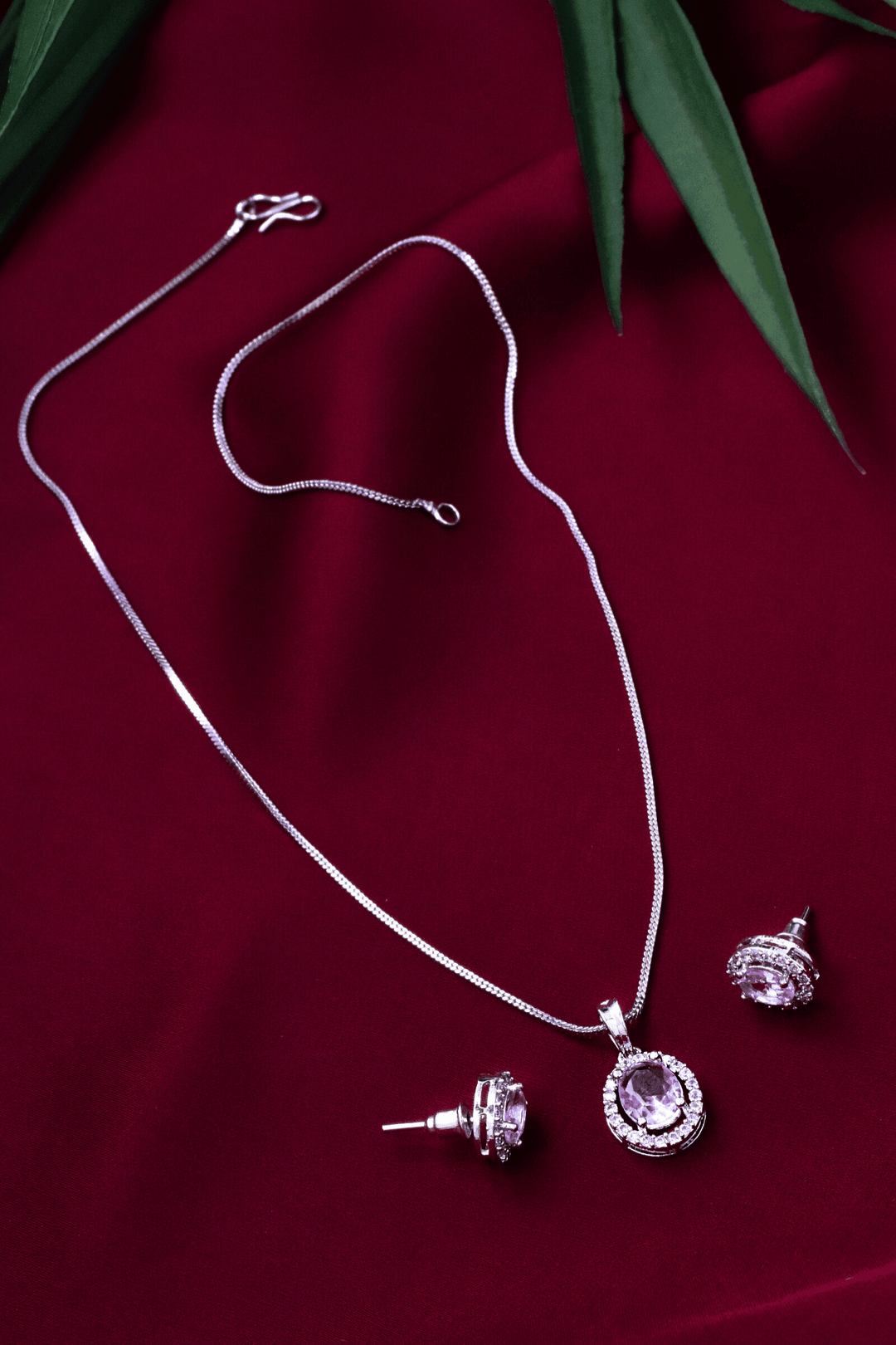 Elevate your style with our exquisite Timeless Pink Pendant Set. This stunning set features a delicate, intricately designed pendant and matching earrings, adorned with captivating pink stones.
