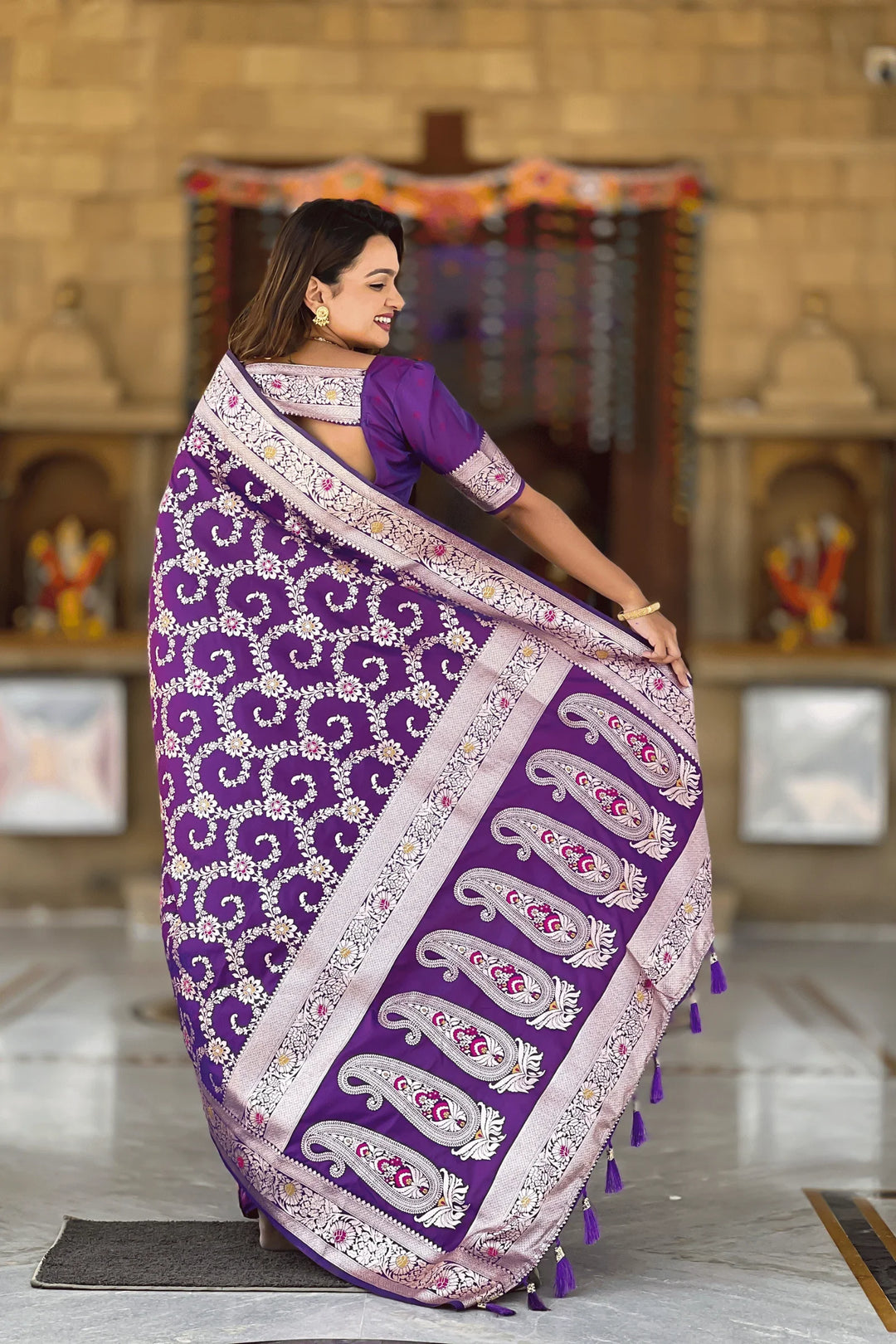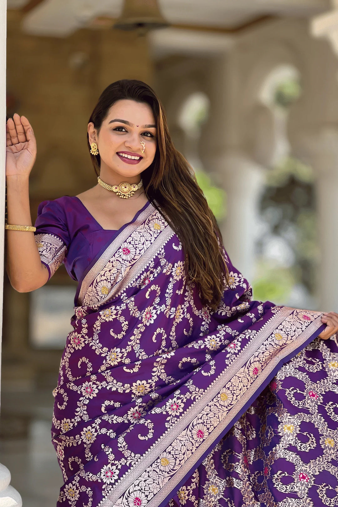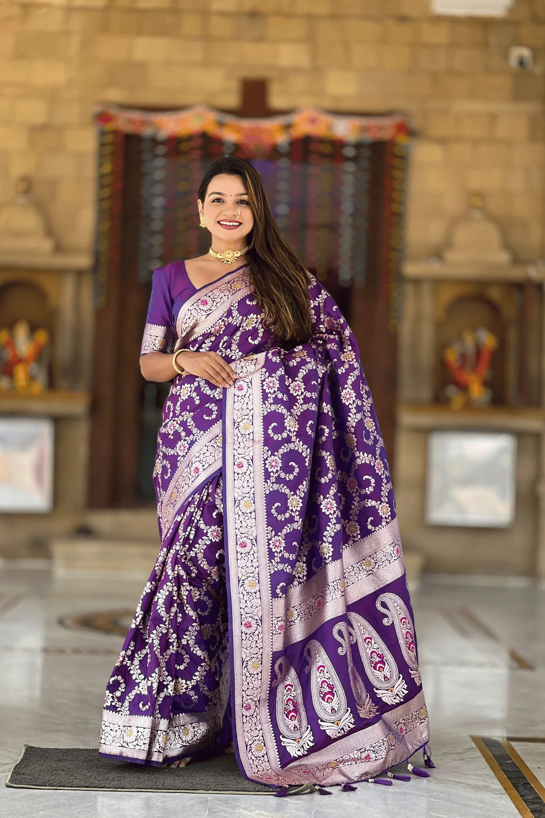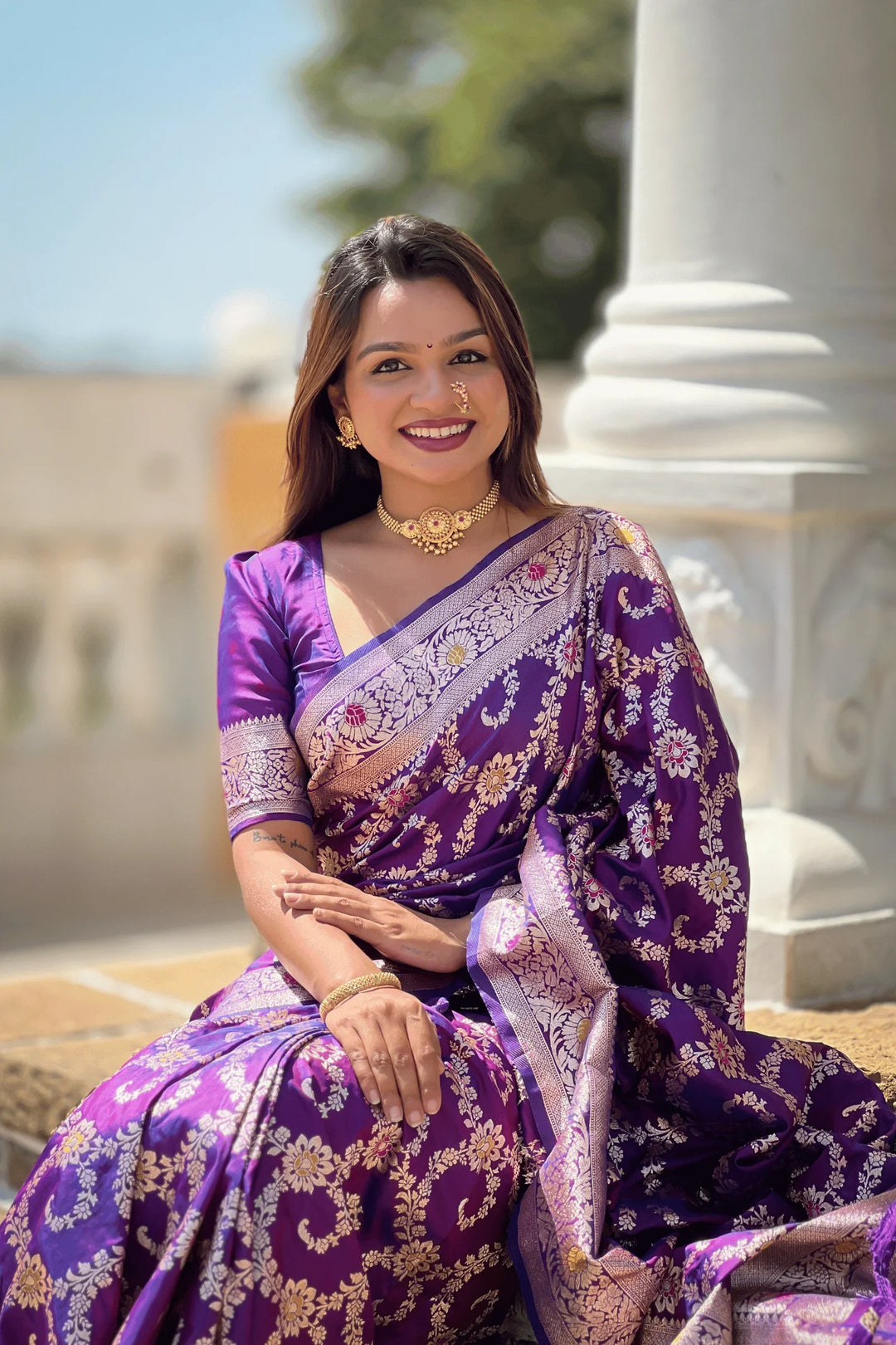 Introducing the Glamwiz Purple Banarasi Silk Saree. This royal banarasi silk saree has stitched pleats and is ideal for wedding or festive occasions.