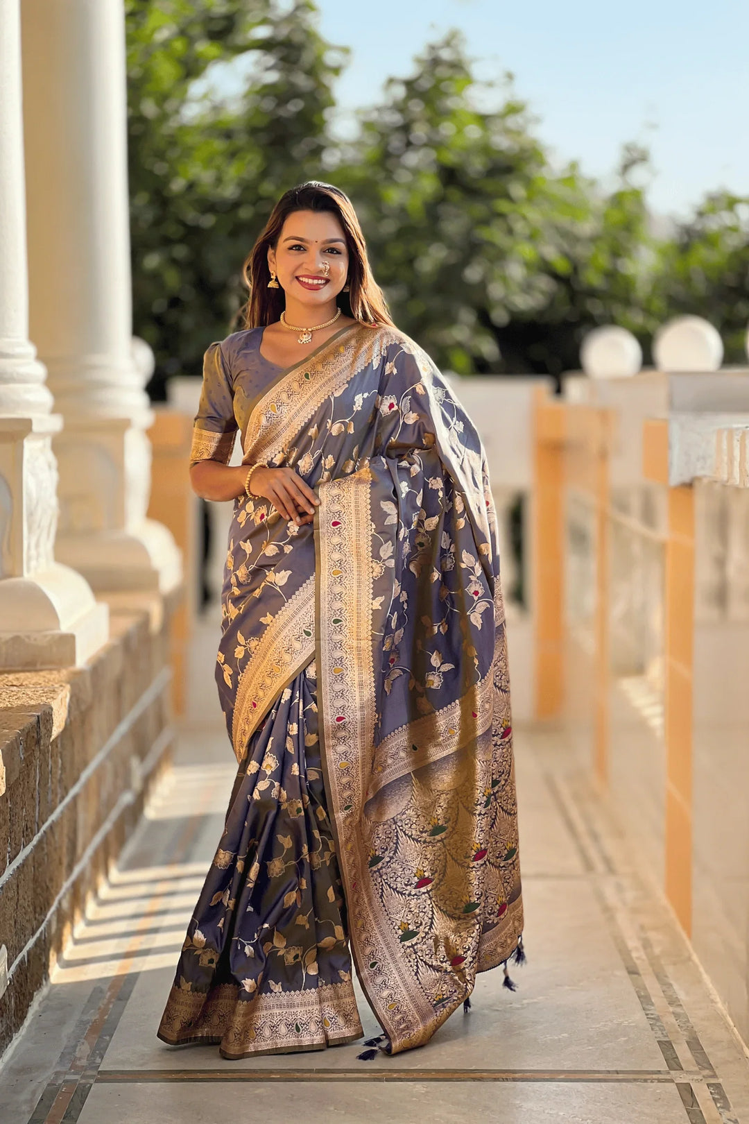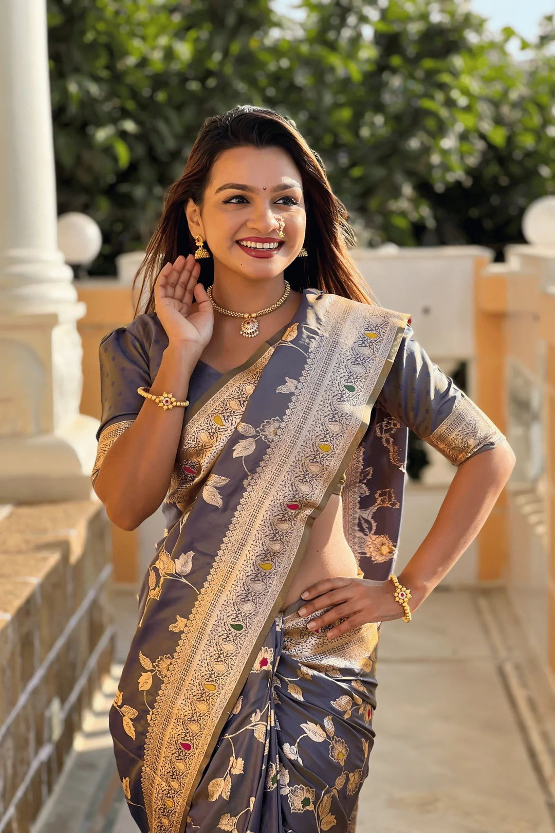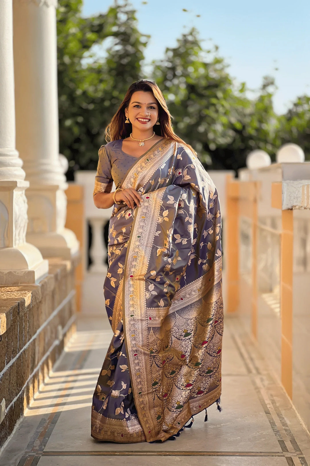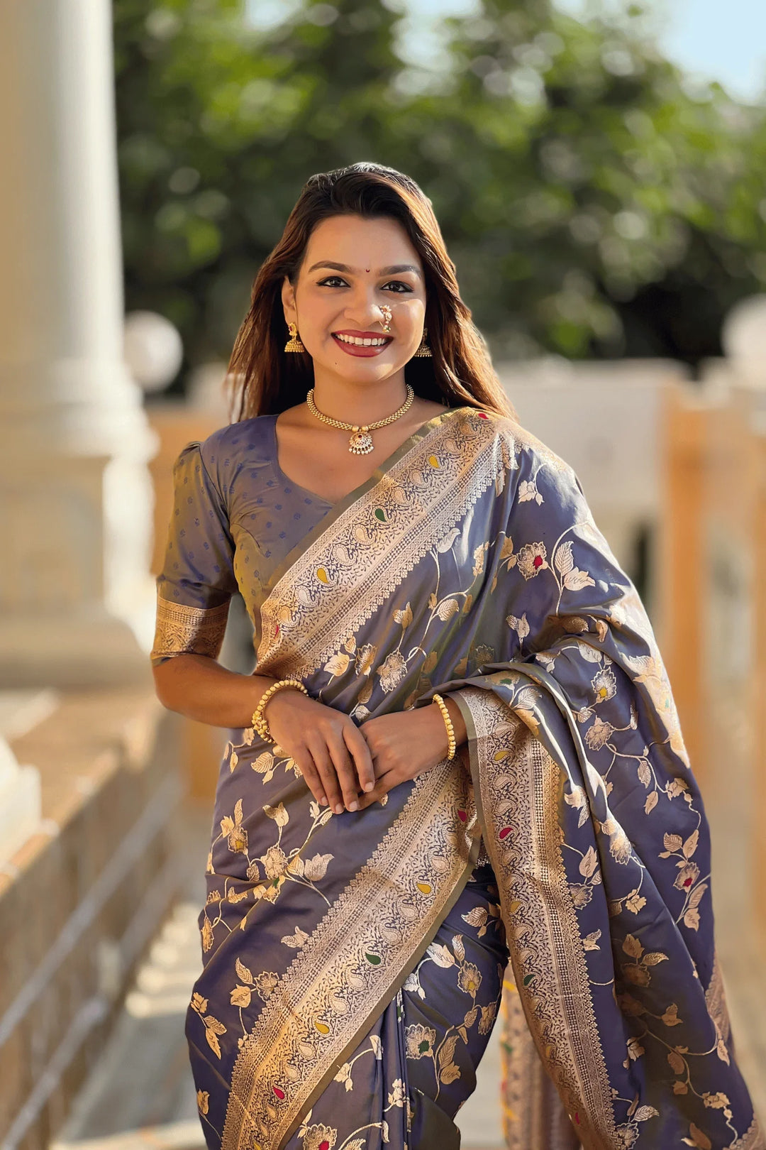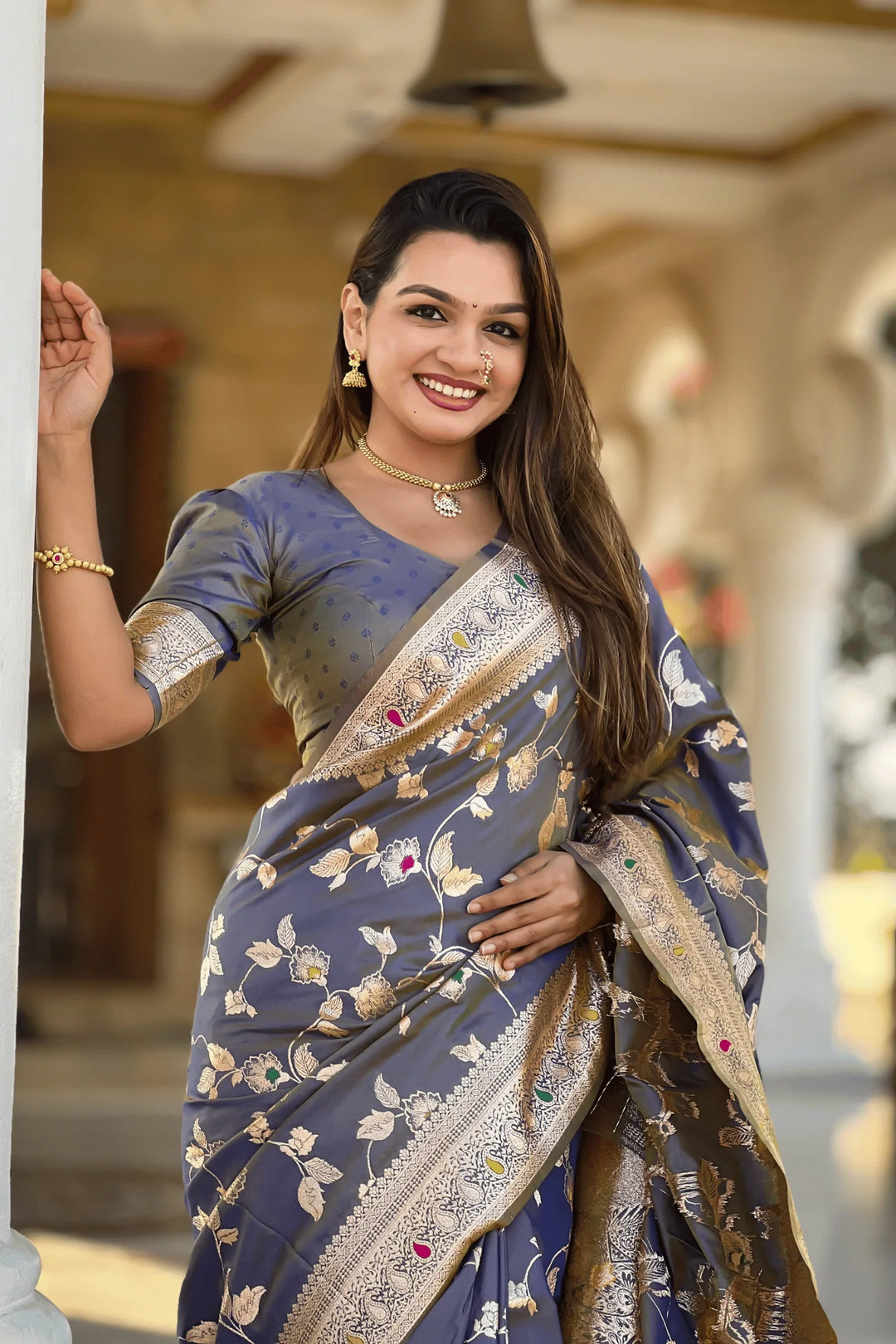 Introducing the Glamwiz Grey Banarasi Silk Saree. The saree has vibrant geometrical border with sophisticated pattern, ideal for office wear and social gatherings.