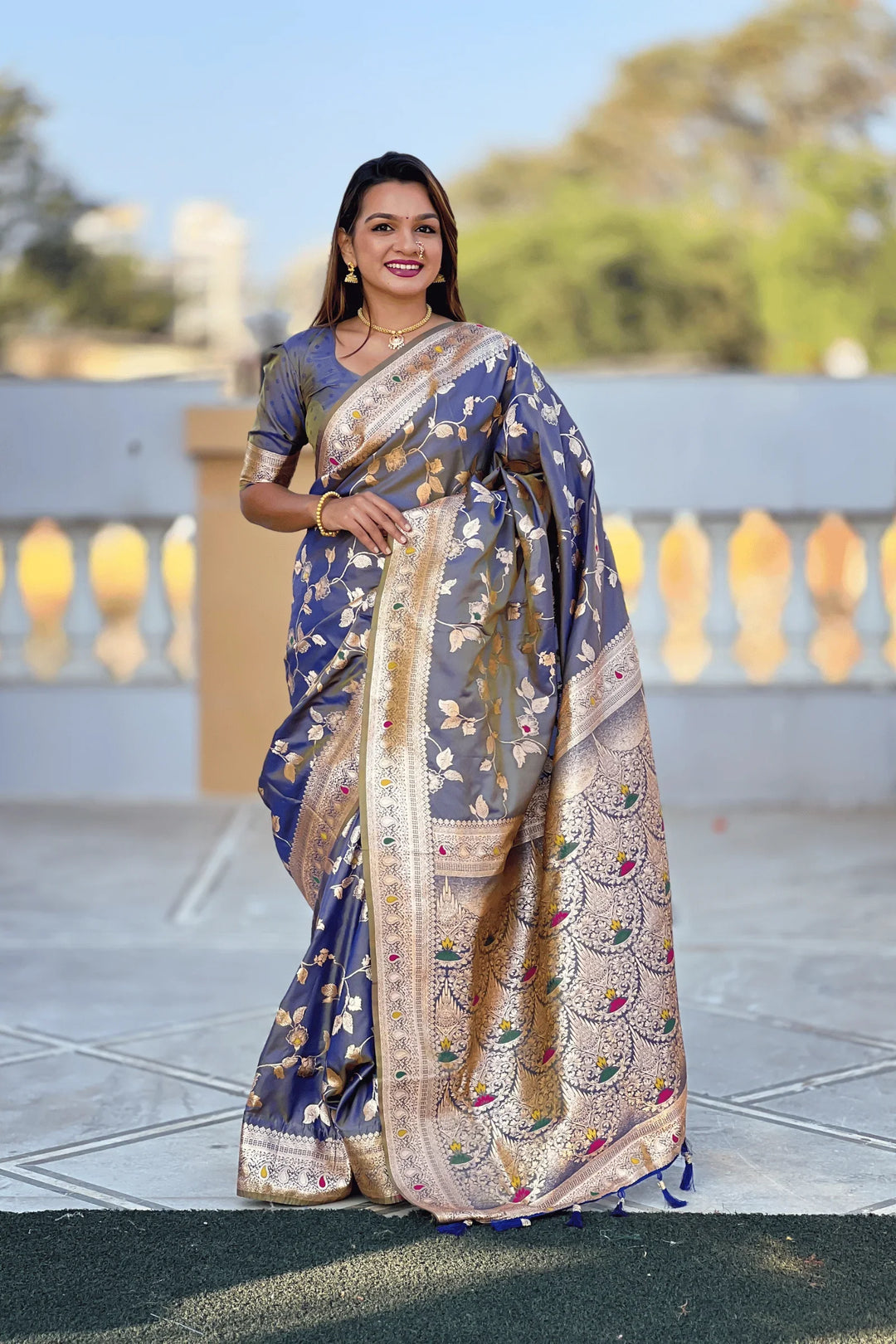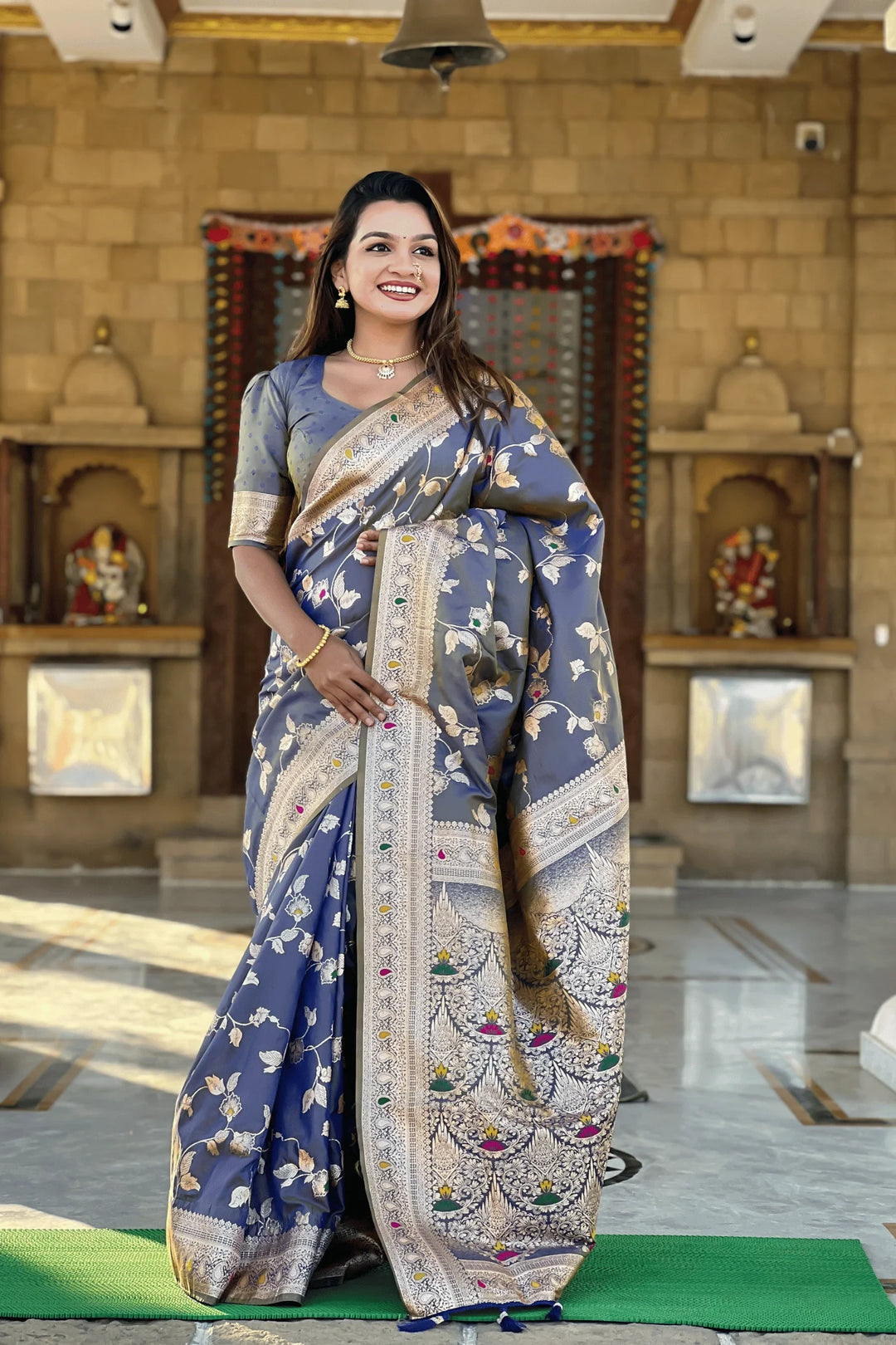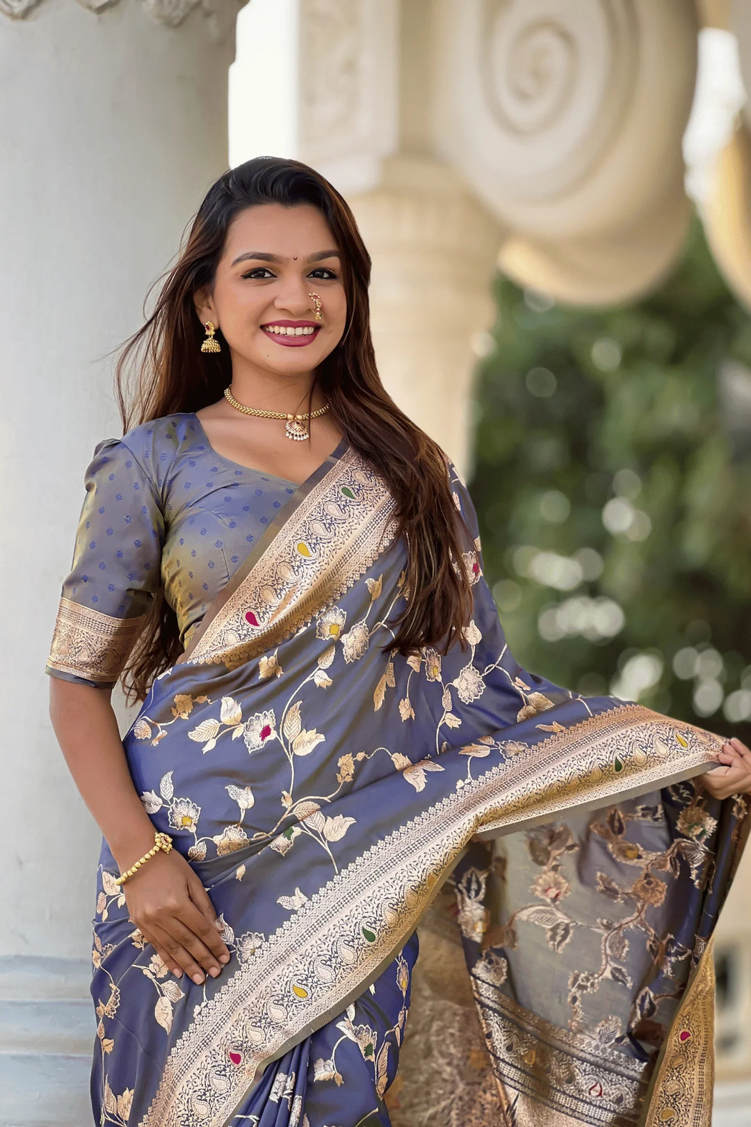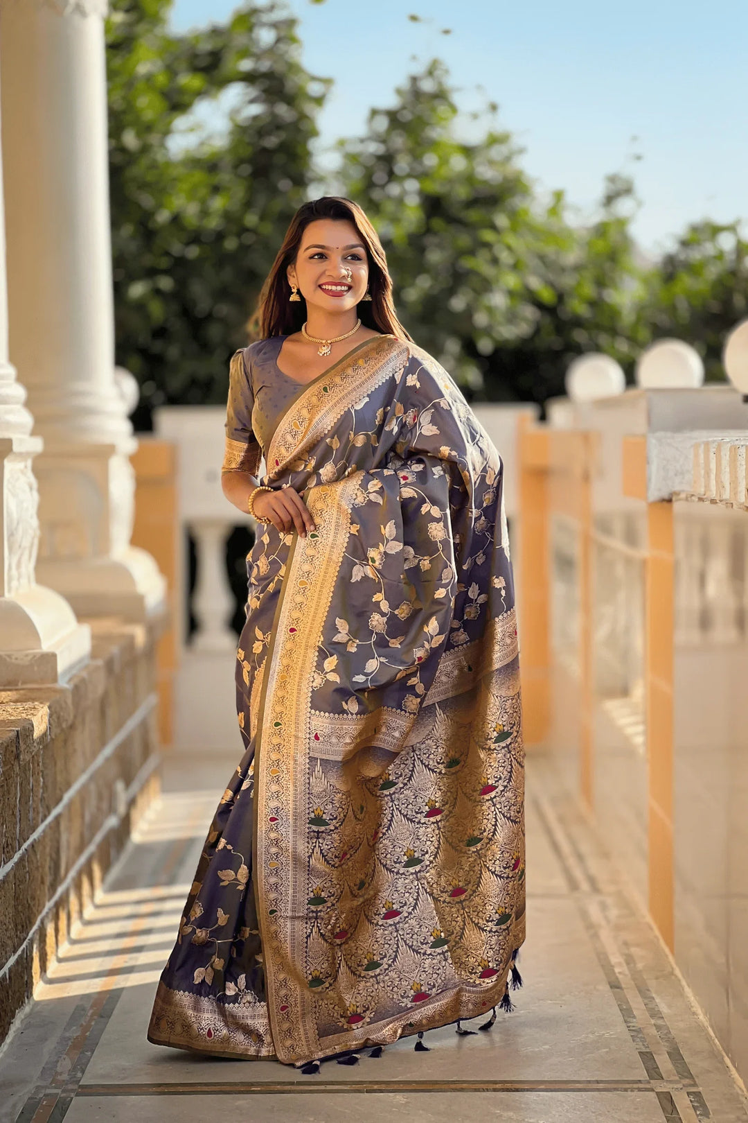 Introducing the Glamwiz Grey Banarasi Silk Saree. The saree has vibrant geometrical border with sophisticated pattern, ideal for office wear and social gatherings.