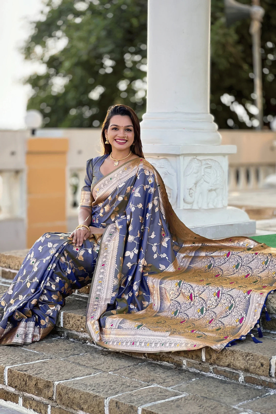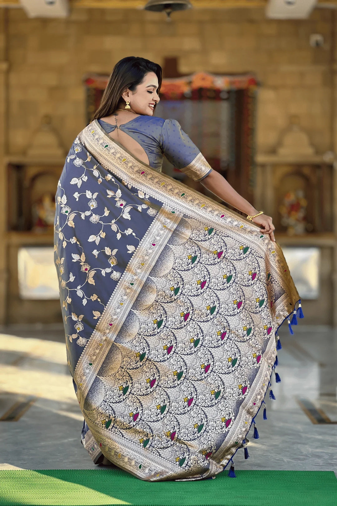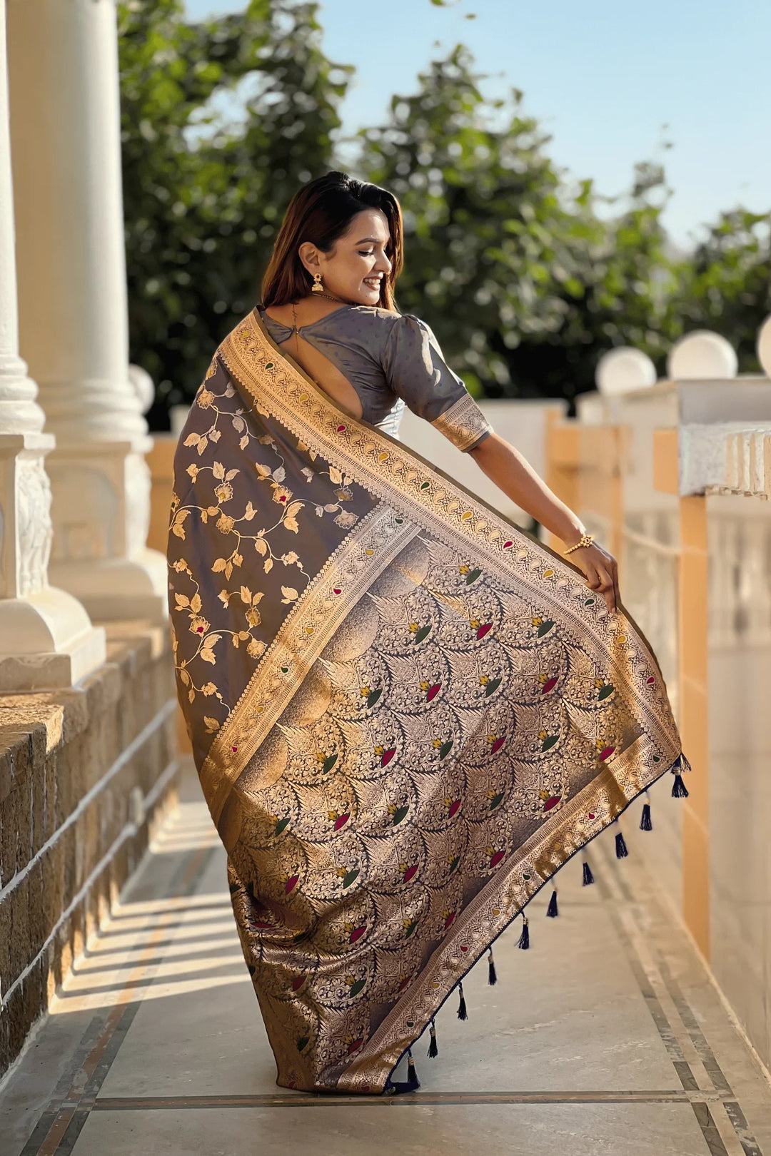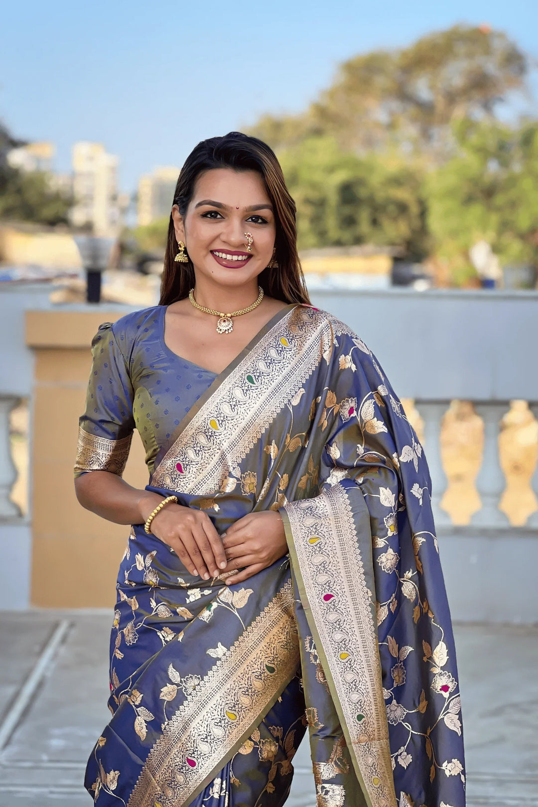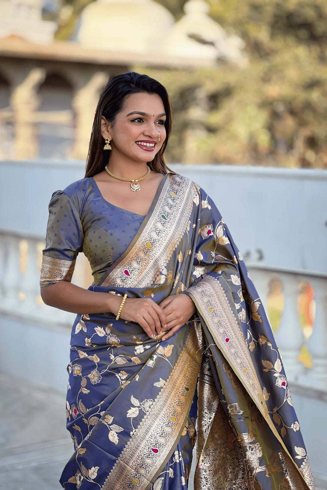 Introducing the Glamwiz Grey Banarasi Silk Saree. The saree has vibrant geometrical border with sophisticated pattern, ideal for office wear and social gatherings.