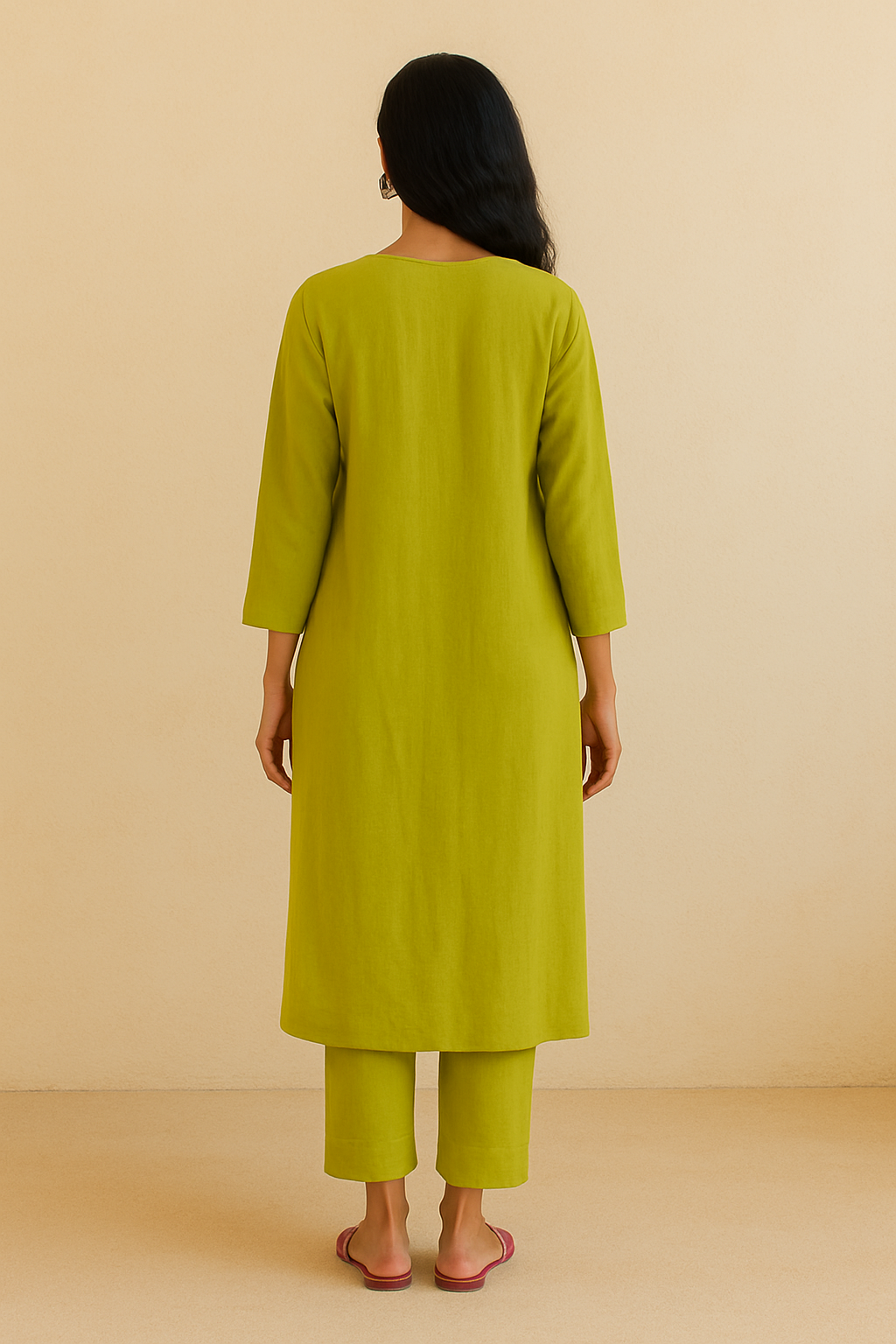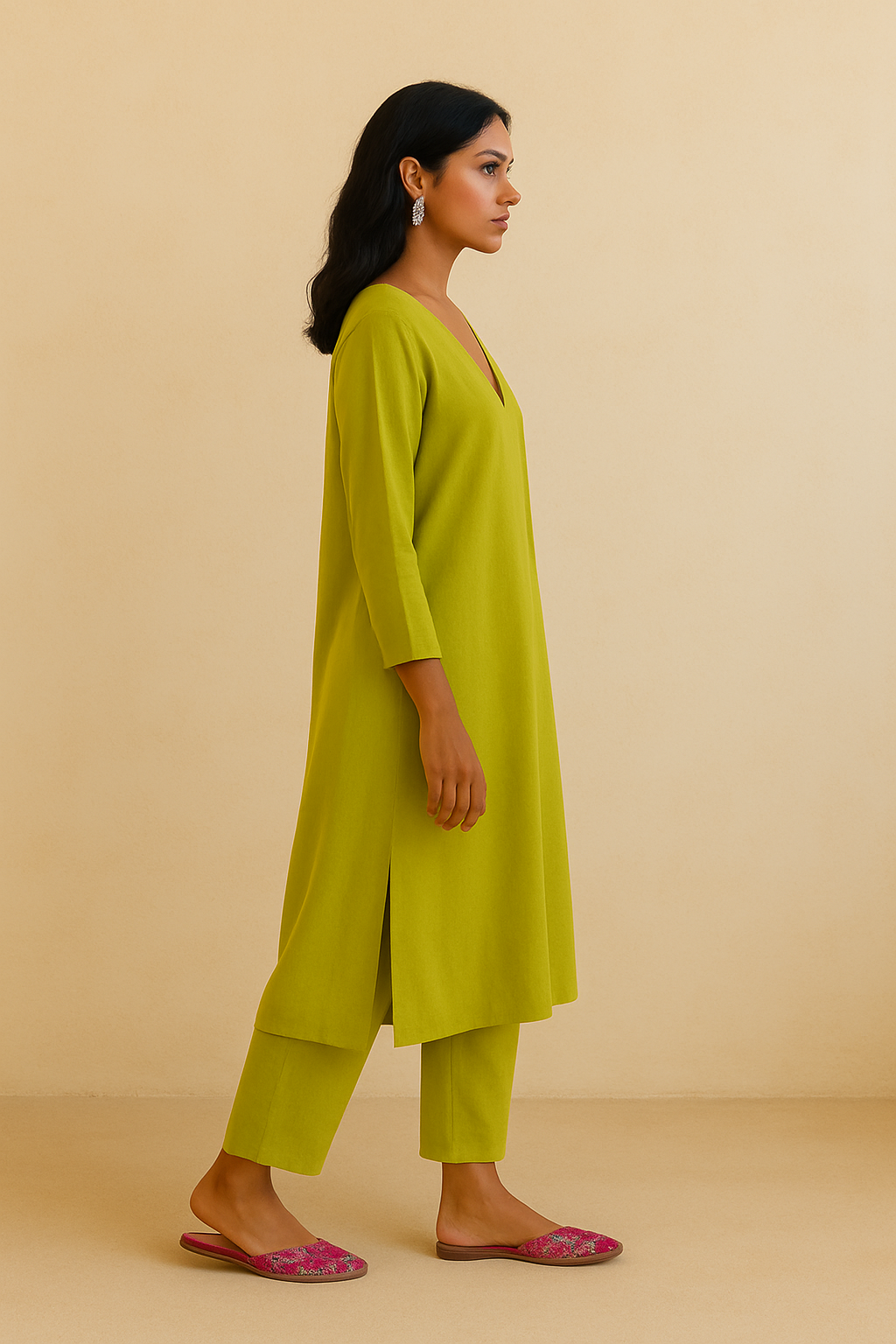Breathe easy in effortless style with our Green Meadow Coord Set. Crafted from soft, breathable cotton, this refreshing green ensemble features a relaxed V-neck kurta with straight-cut pants, offering a clean and comfortable silhouette.