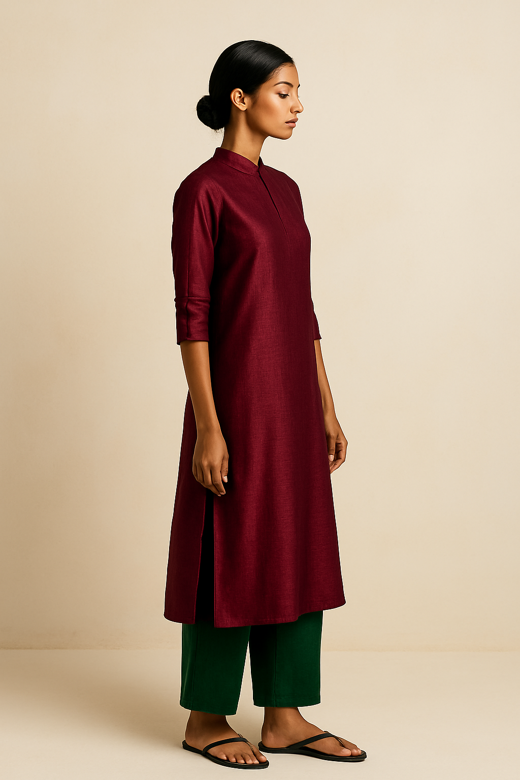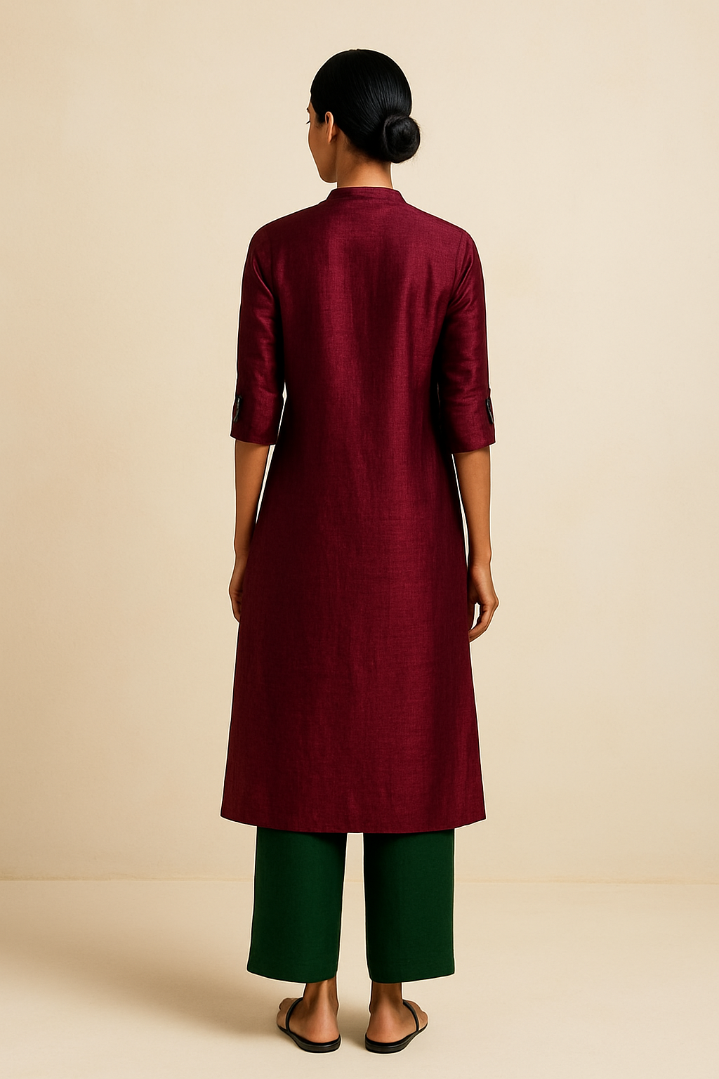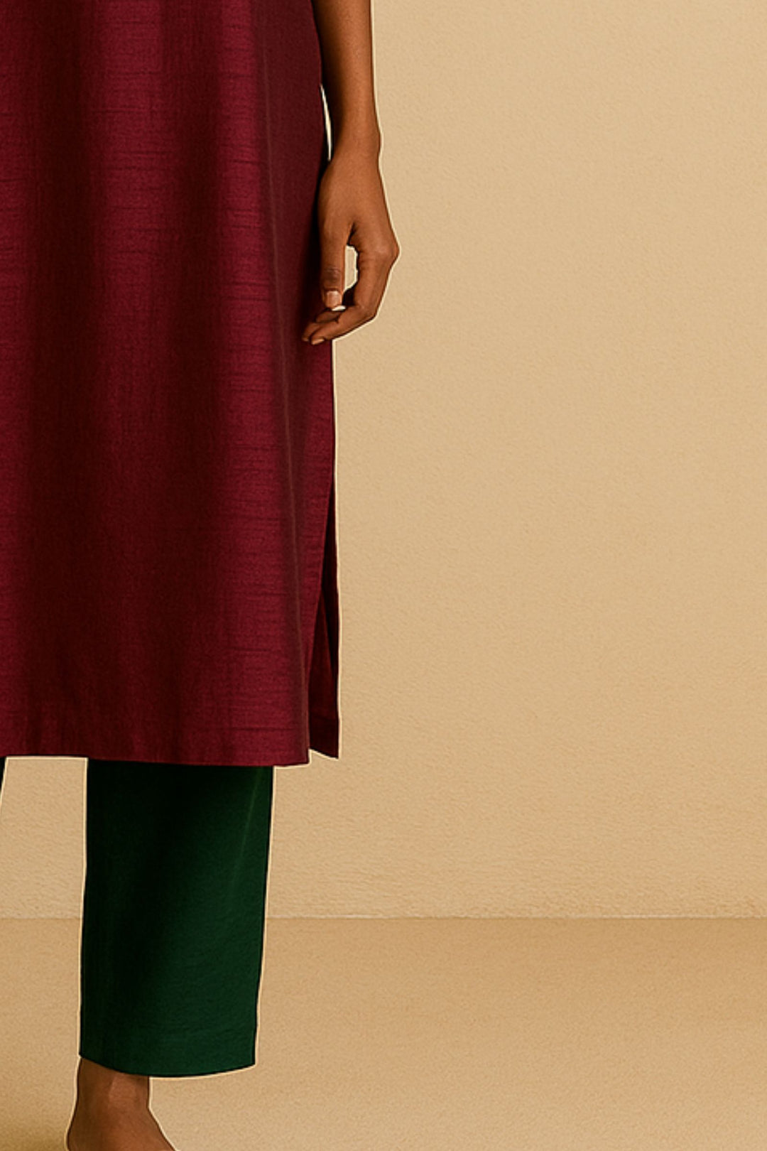 Bold yet rooted, our Sangria Sprout Coord Set blends traditional charm with a contemporary edge. Featuring a rich sangria-toned kurta with a smart mandarin collar and deep green straight pants, this set offers a striking contrast that's perfect for everyday elegance or casual festive gatherings.