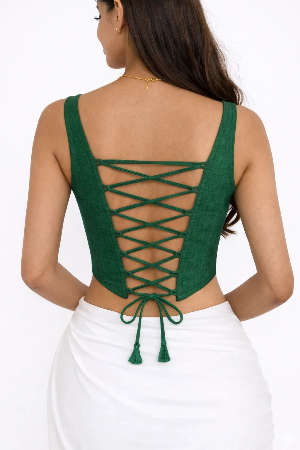 Deep, lush and powerfully elegant — the Bottle Green Sculpt corset top adds drama to any ethnic ensemble. The structured boning sculpts your silhouette while the rich green hue pairs effortlessly with gold jewellery and tissue sarees. Available XS to 5XL.