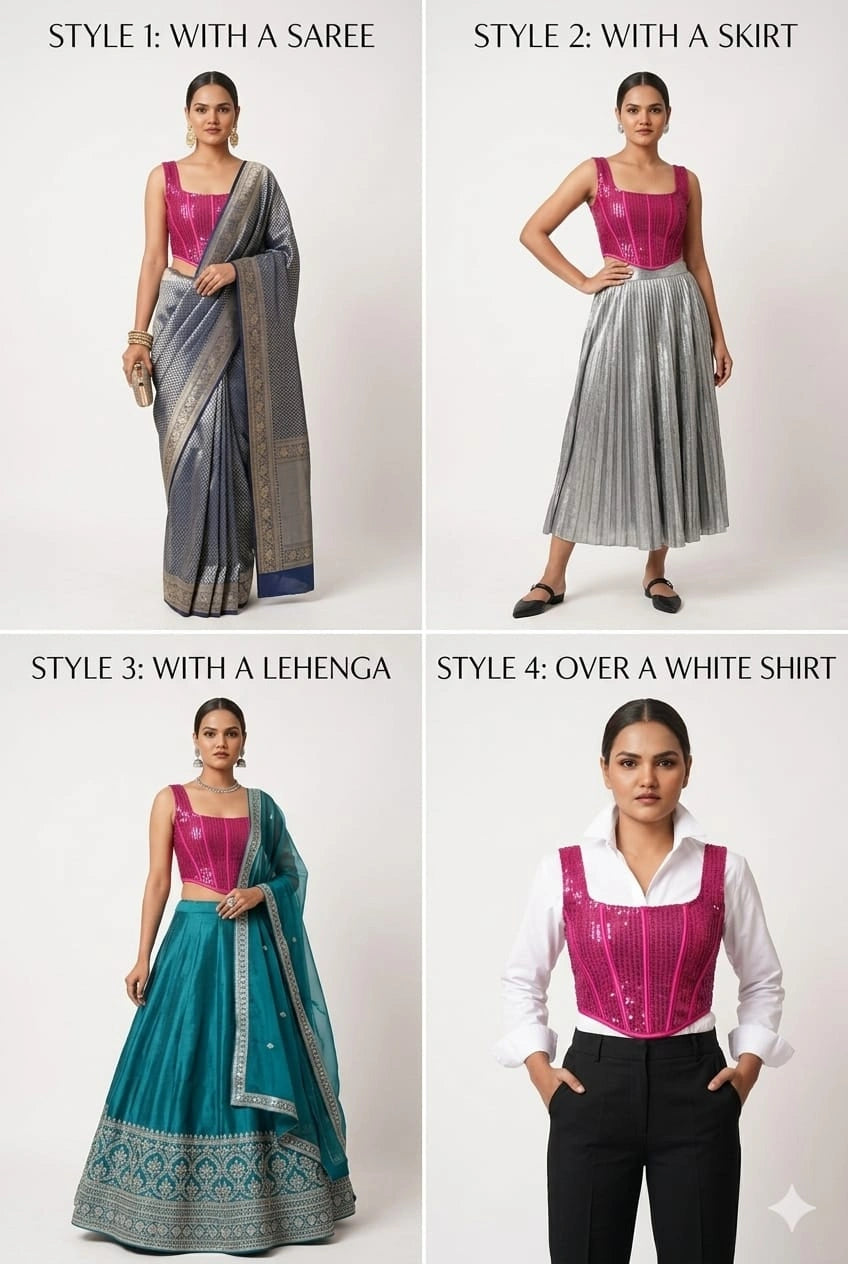 Wear it as a corset blouse with sarees or as a statement corset top with jeans, skirts, or trousers. -