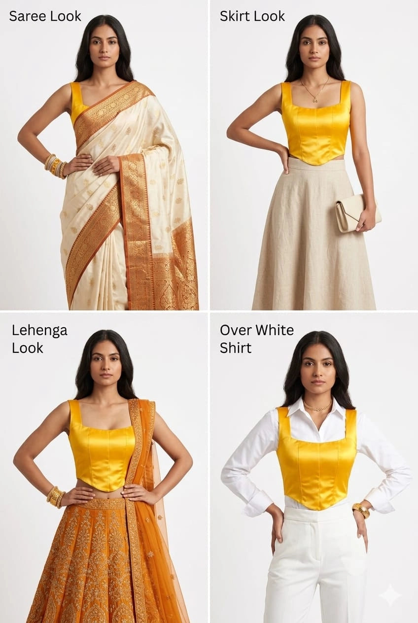 Wear it as a corset blouse with sarees or as a statement corset top with jeans, skirts, or trousers. -
