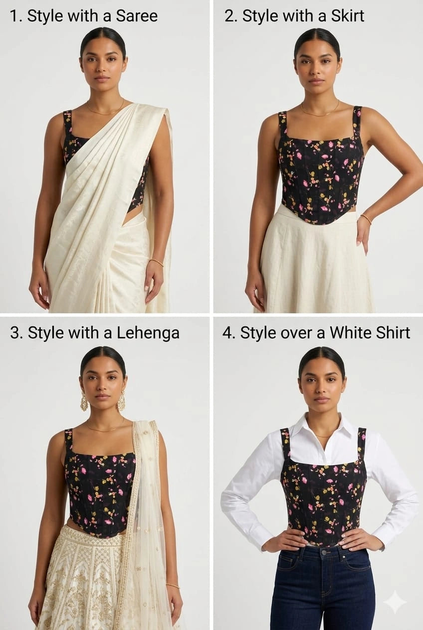 Wear it as a corset blouse with sarees or as a statement corset top with jeans, skirts, or trousers. -