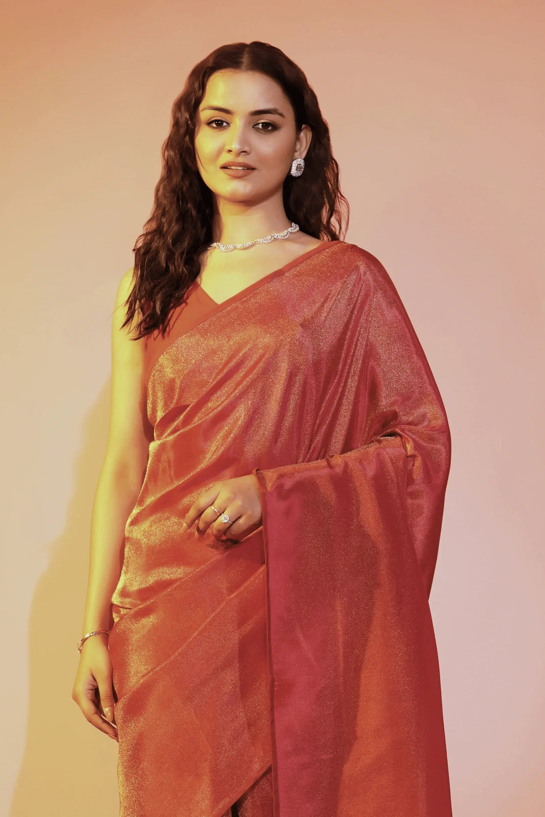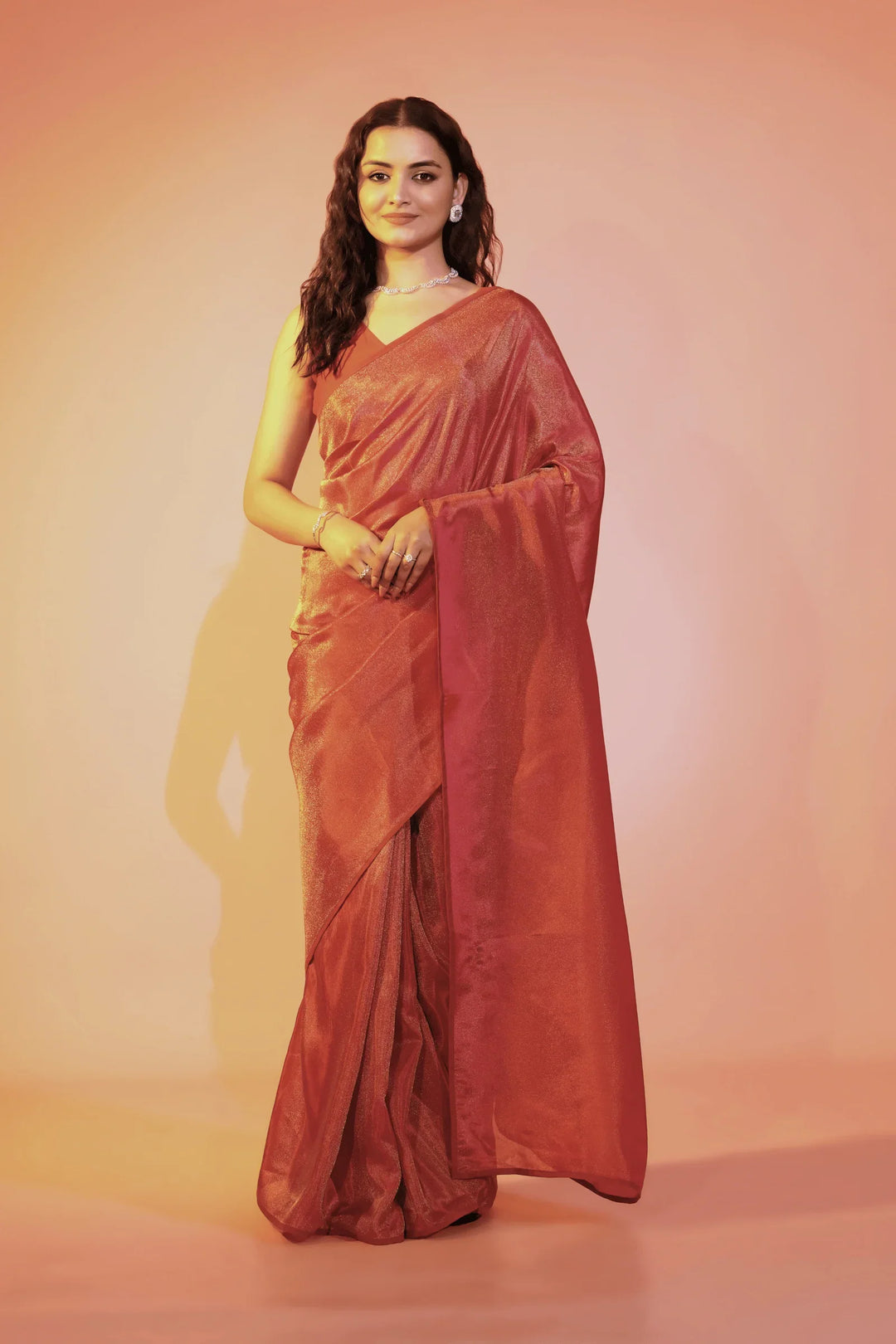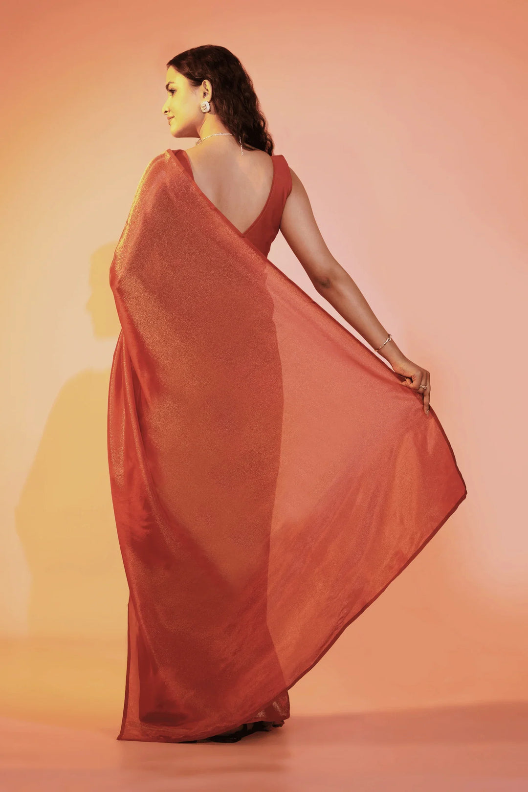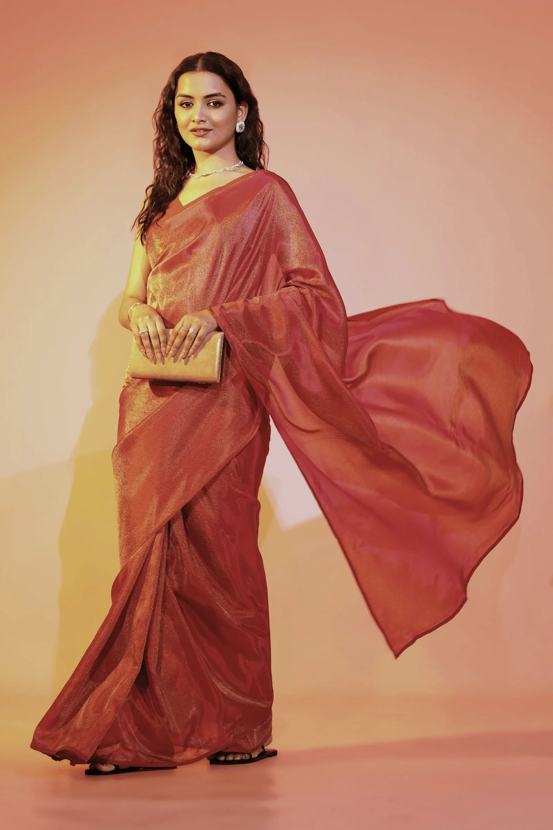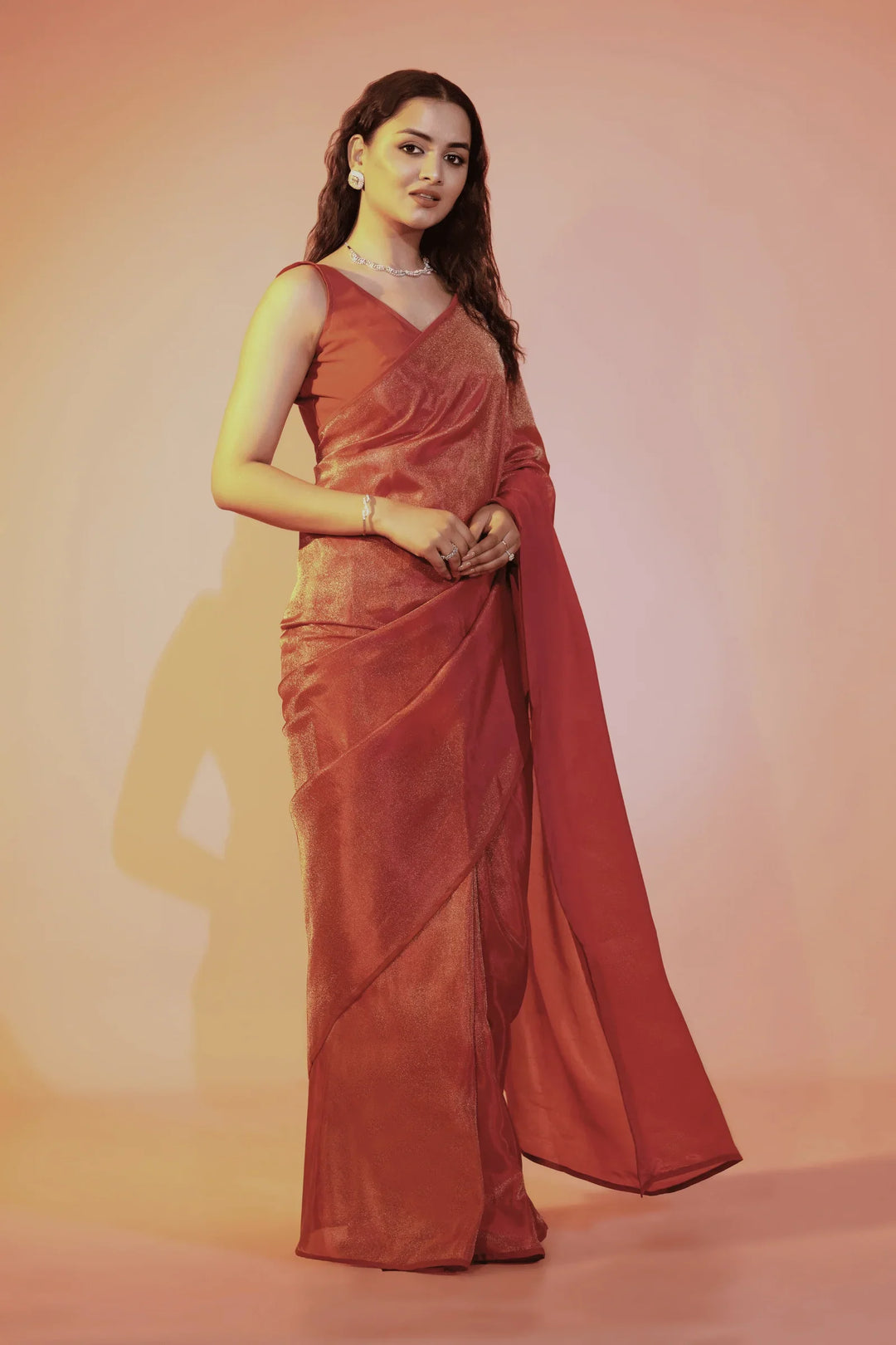 - Shaded crimson one minute saree in cosmos fabric- tint of orange and gold.