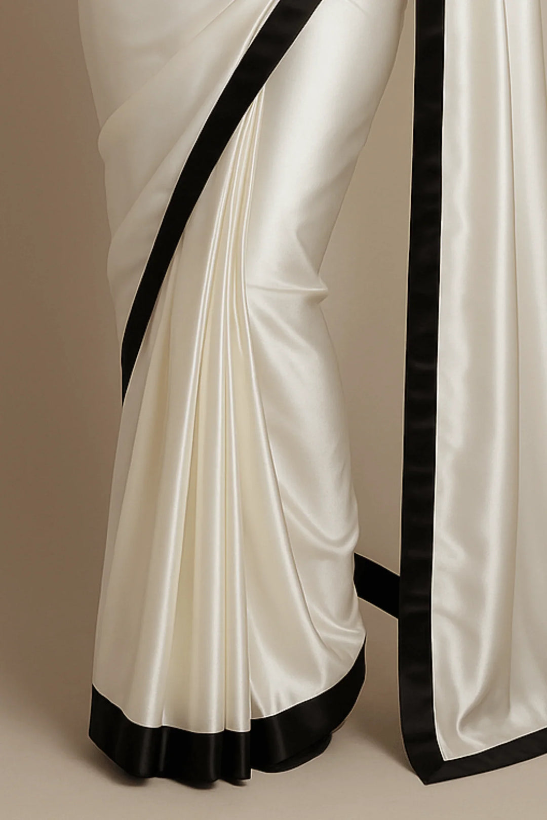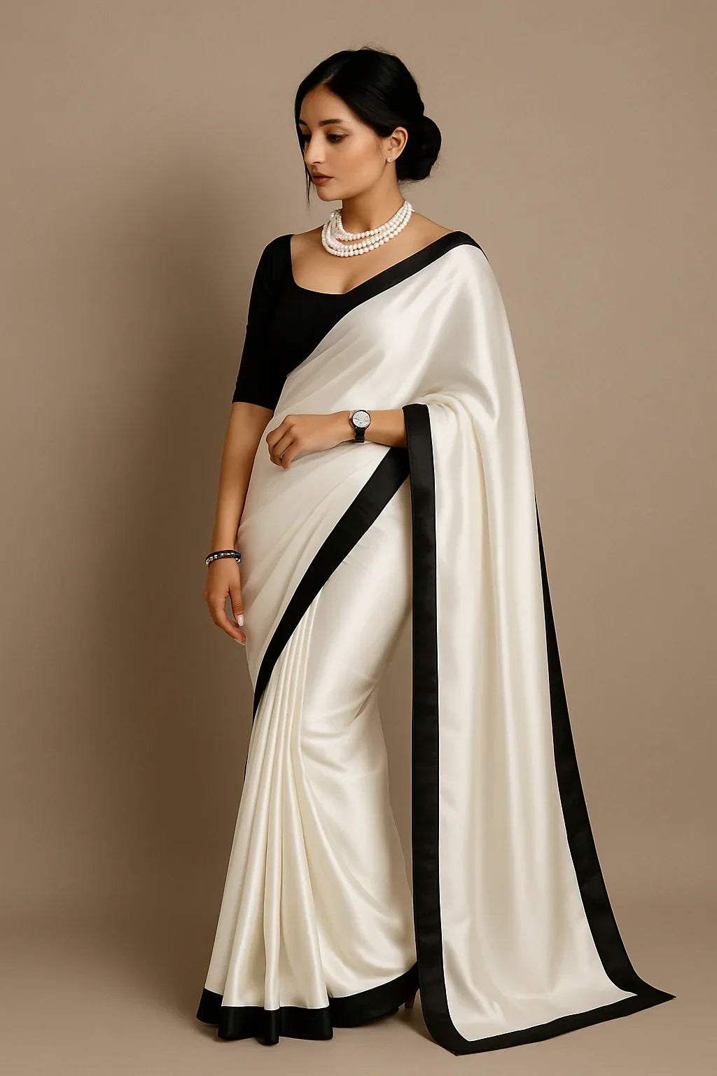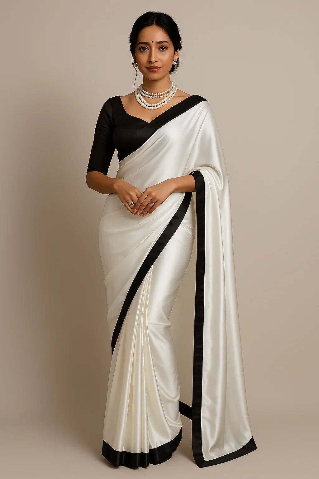 Command attention with Noir blanc, a stunning ready-to-wear saree crafted in a classic Black and white that radiates confidence and charm. Made from our luxurious premium ultra satin, this saree drapes like a dream — fluid, flattering, and effortlessly graceful. Blouse in the image is just for photoshoot. Plain satin blouse 1 mtr is included with saree.