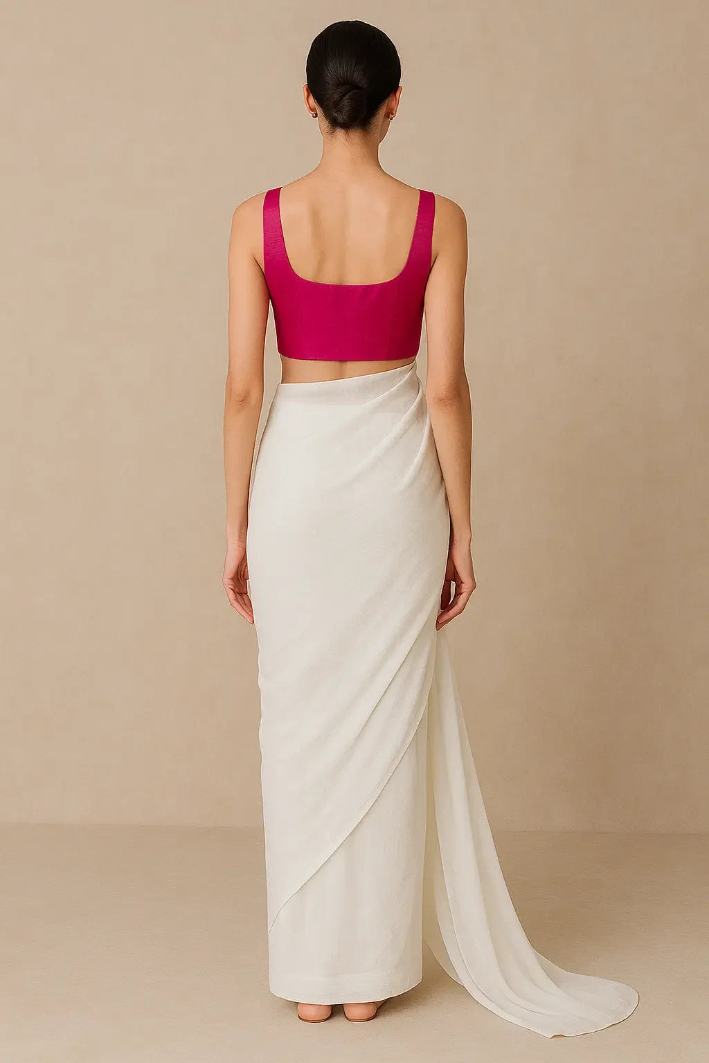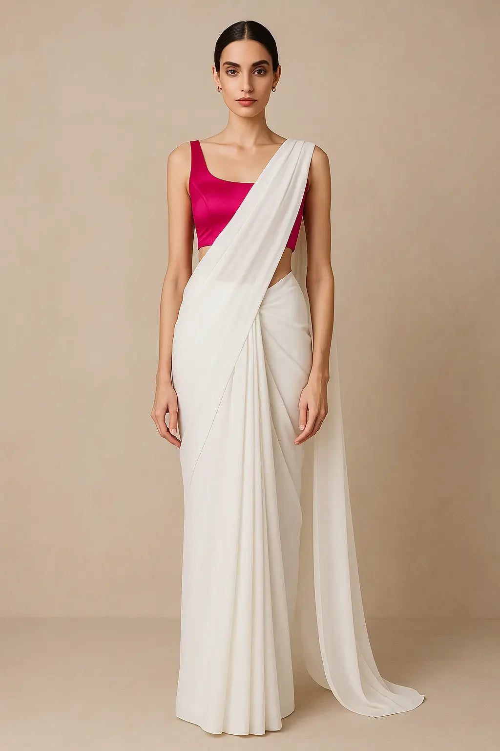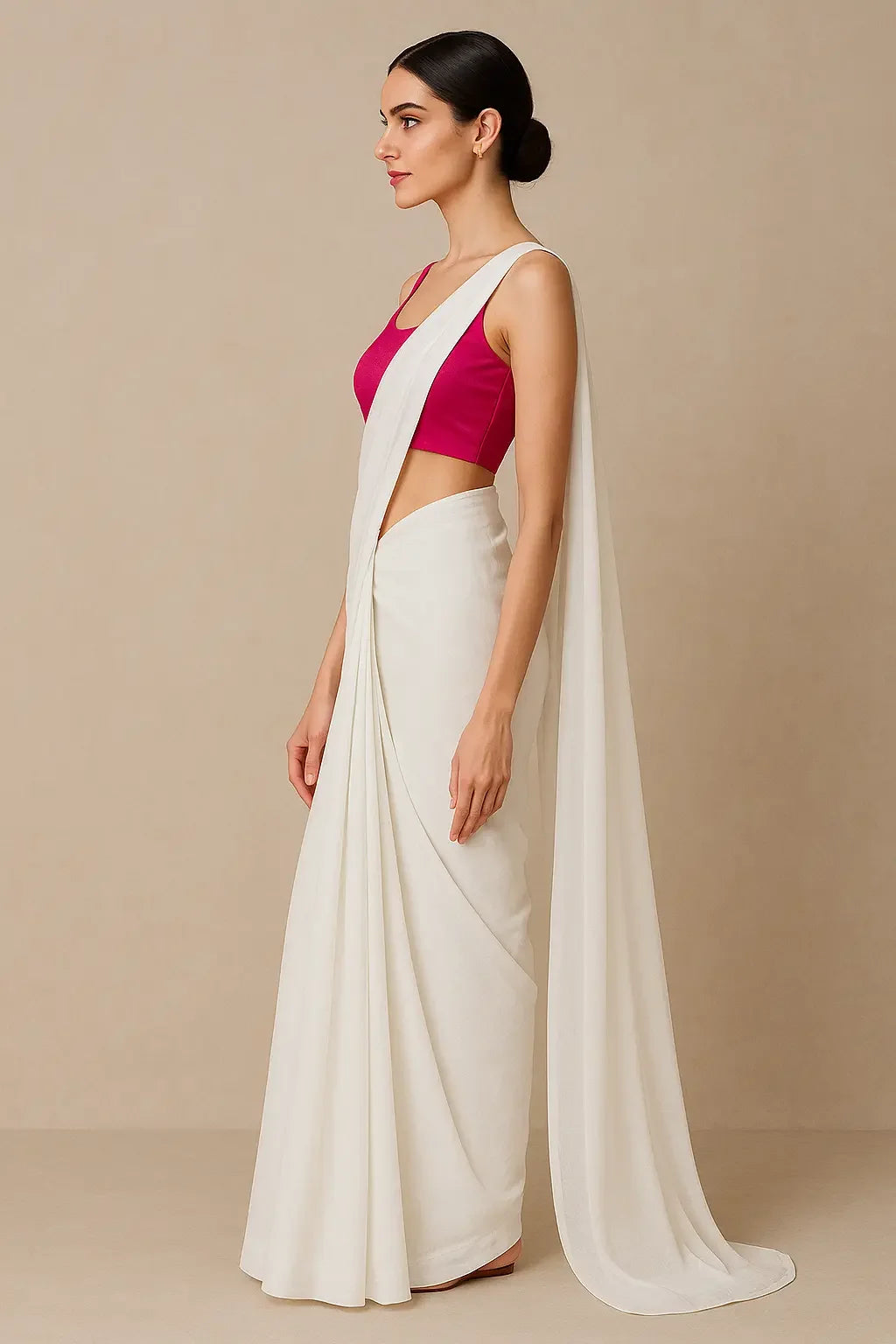 Command attention with White Orchid Bloom, a stunning ready-to-wear saree crafted in a classic White and Pink that radiates confidence and charm. Made from our luxurious premium georgette, this saree drapes like a dream — fluid, flattering, and effortlessly graceful.