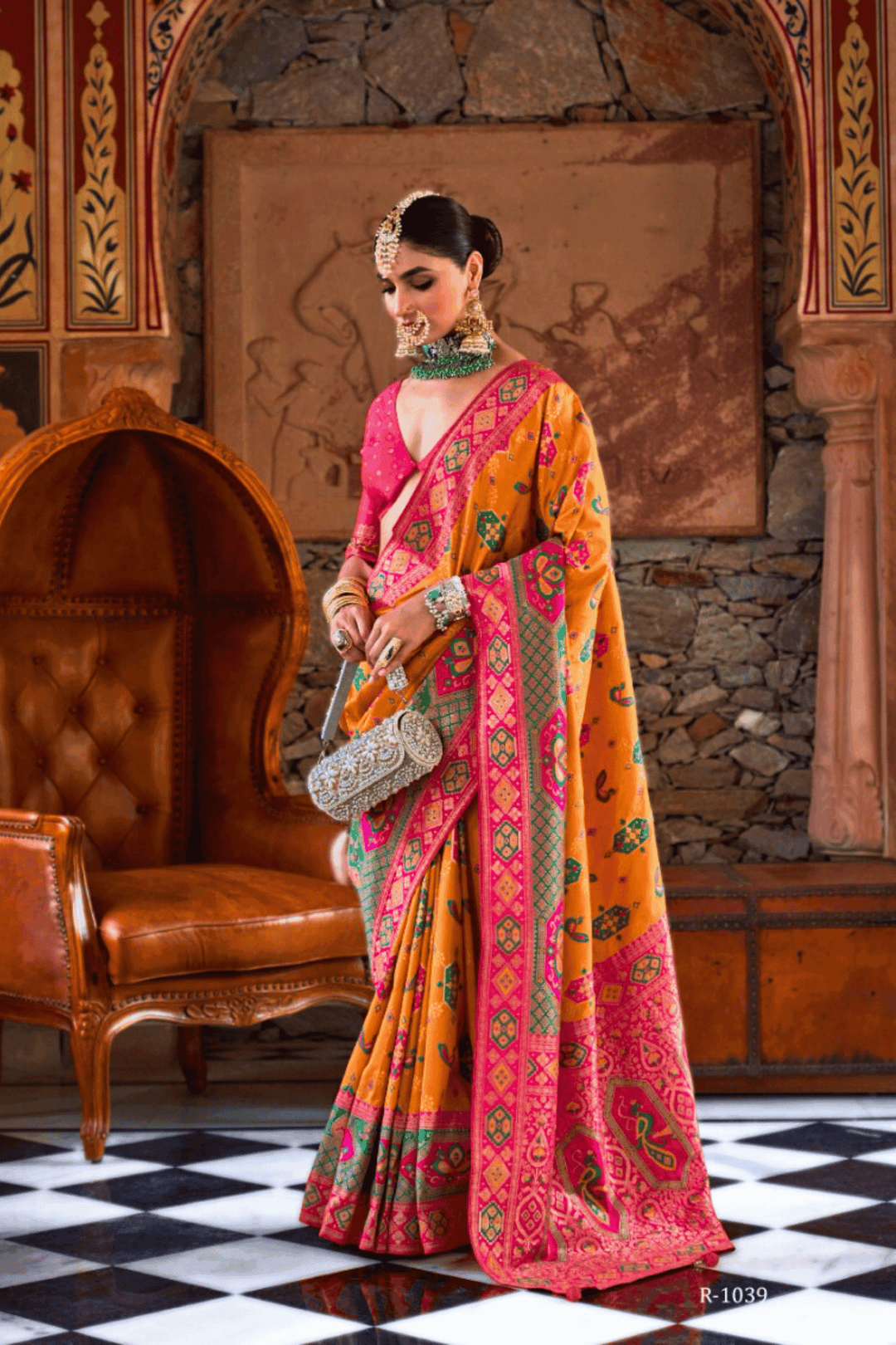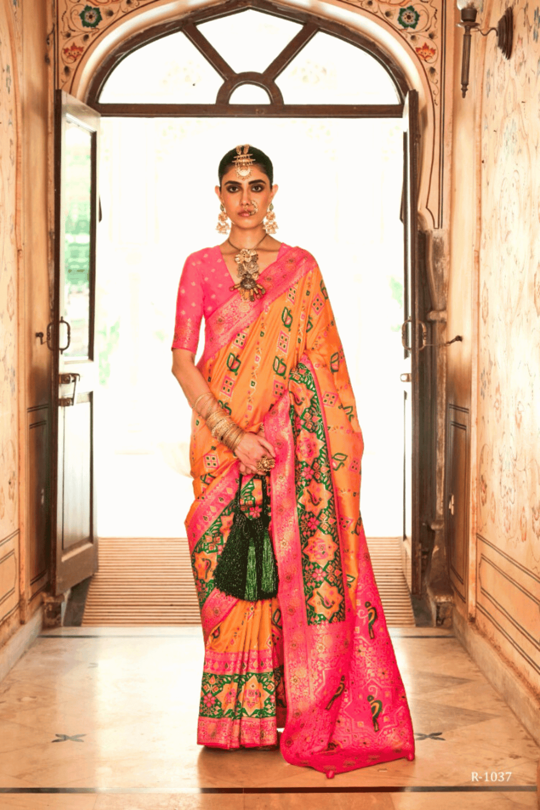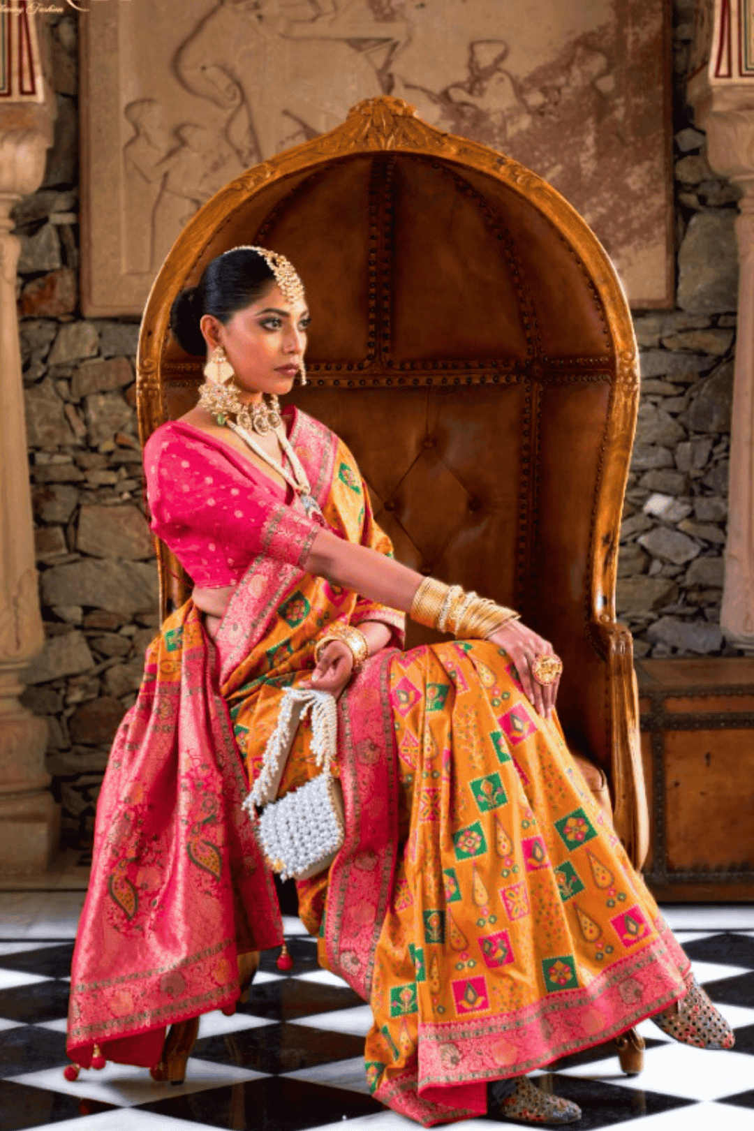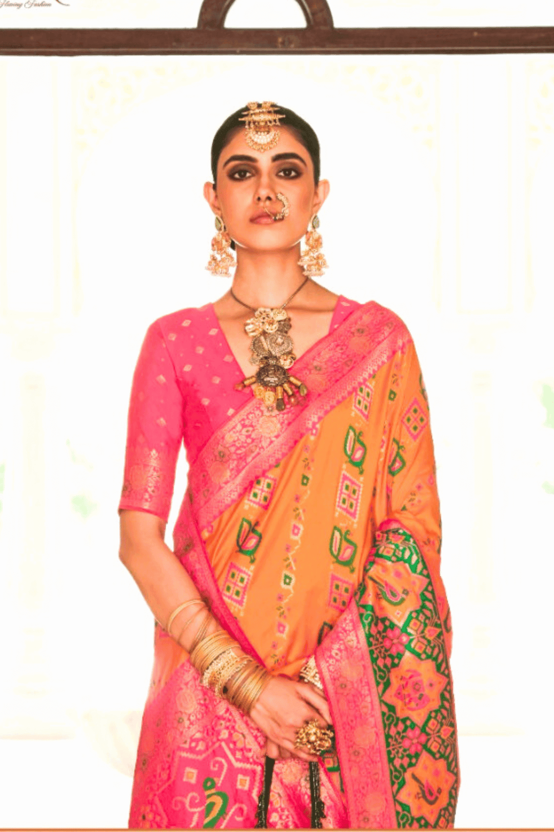 Introducing Glamwiz Ready to Wear Marigold Yellow Patola Saree, where luxury meets tradition. This exquisite saree is crafted from luxurious patola silk, known for its rich colors and intricate patterns.