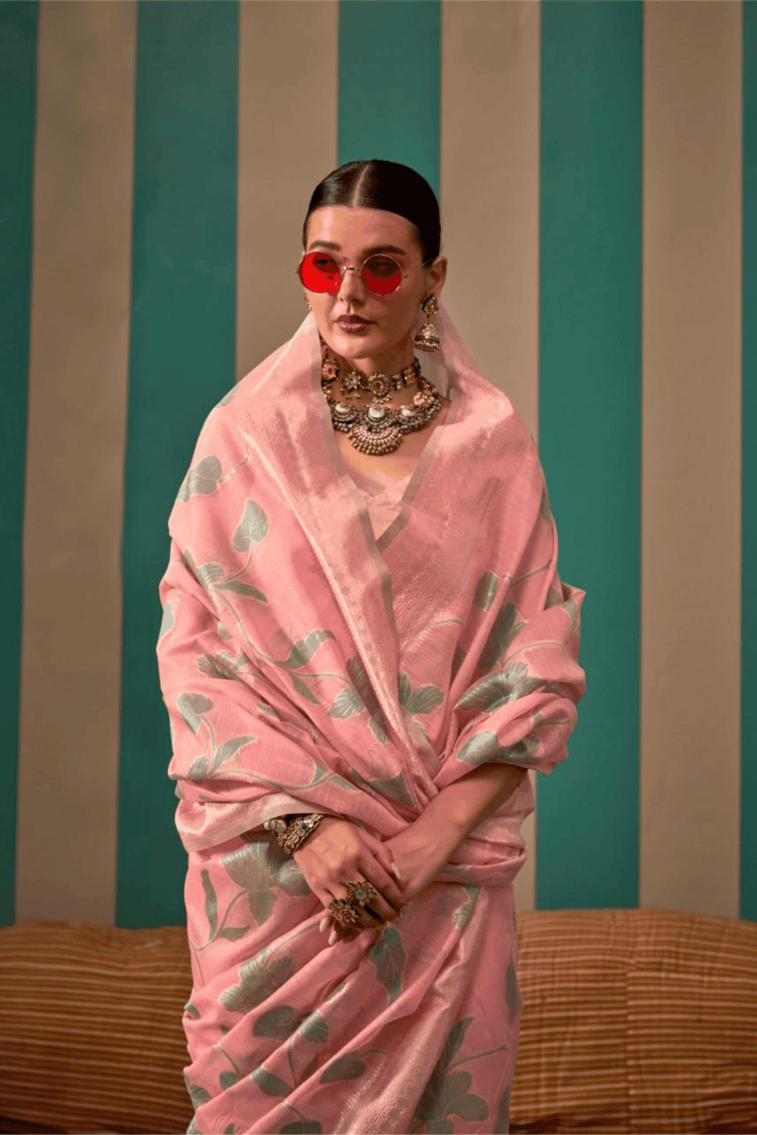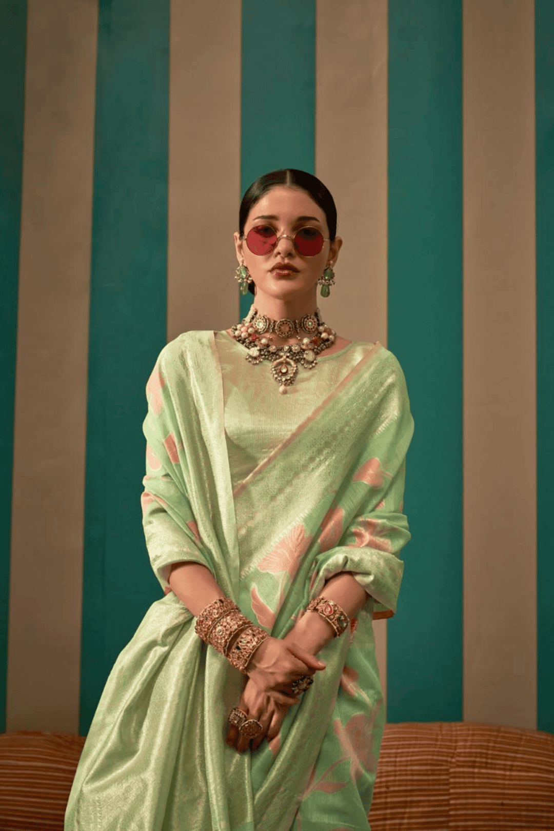 A Ready to Wear Royal Linen Silk Saree with stitched pleats woven with zari threads across the saree. The soft silk saree comes along with tone-to-tone matching blouse. A ready to wear saree with stitched waist pleats.The hooks do NOT show up as they are practically invisible. Just wear a petticoat /pant/skirt and you are ready to drape it! Fits from 28" waist upto 42" waist.