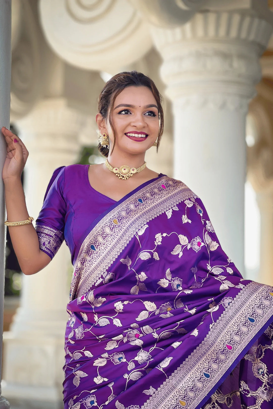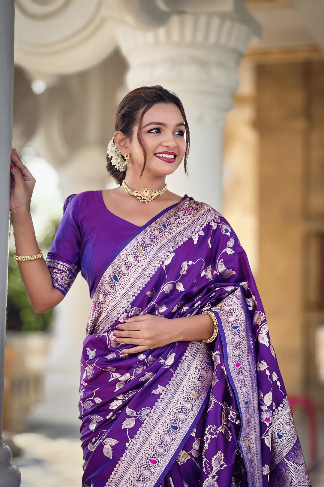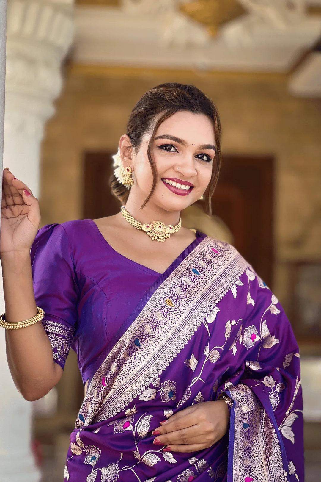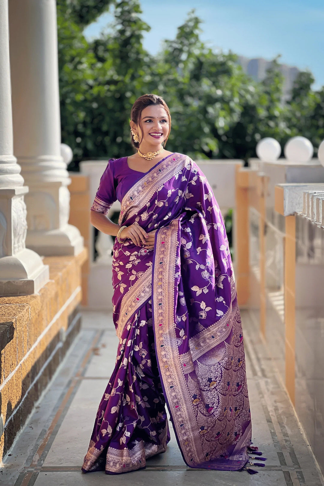 Introducing the Glamwiz Ready to Wear Purple Banarasi Silk Saree. Experience the perfect blend of tradition and convenience with the Glamwiz Ready-to-Wear Saree. The saree has vibrant geometrical border with sophisticated pattern, ideal for office wear and social gatherings.