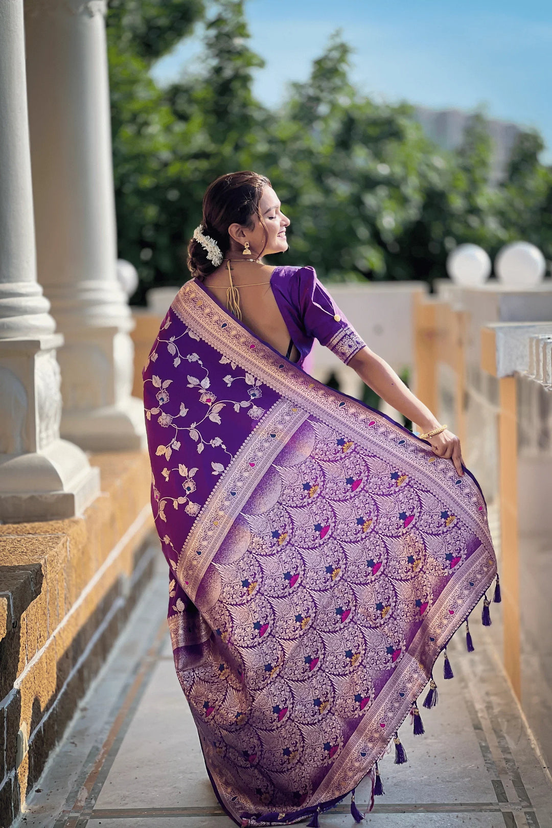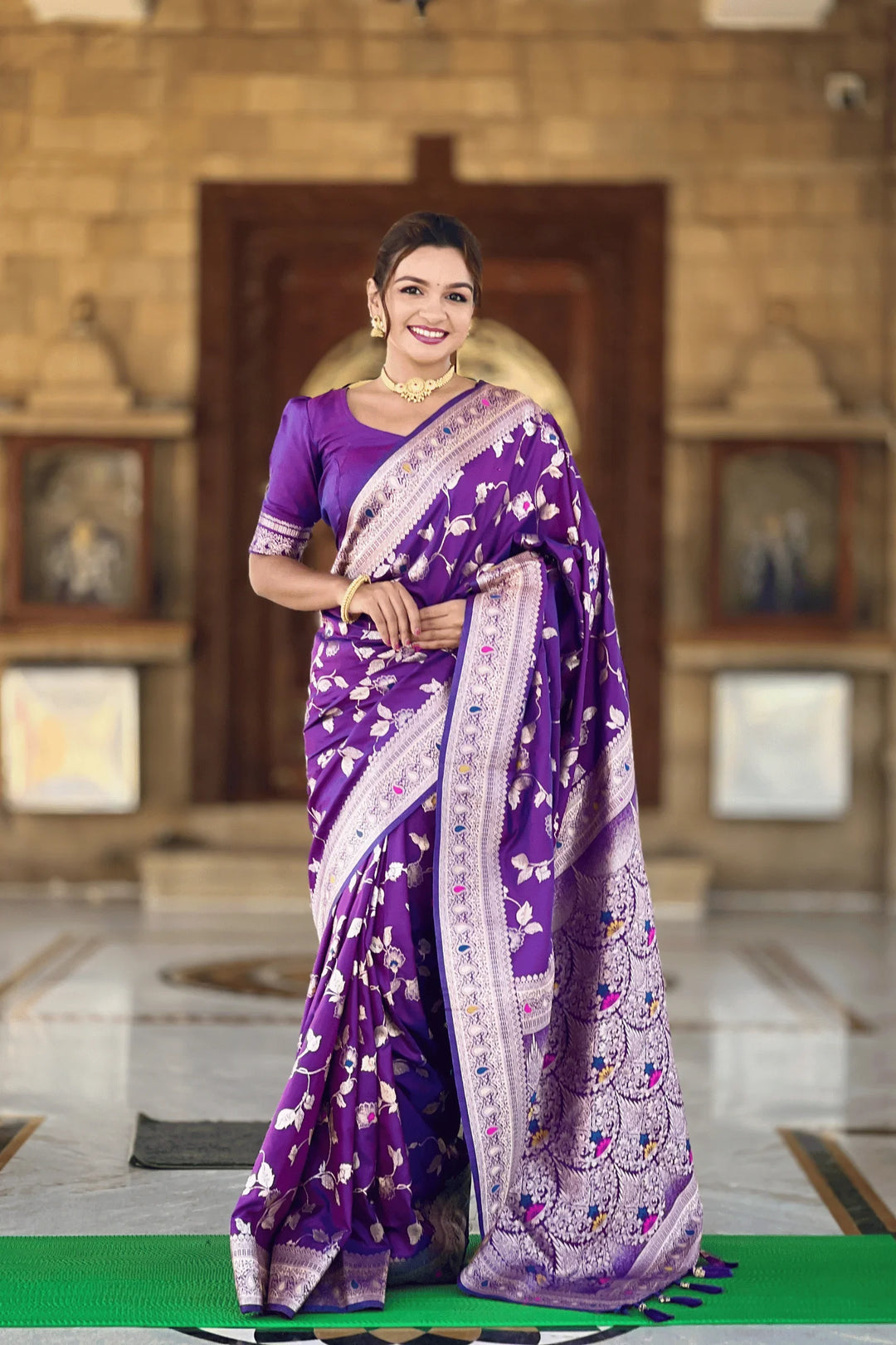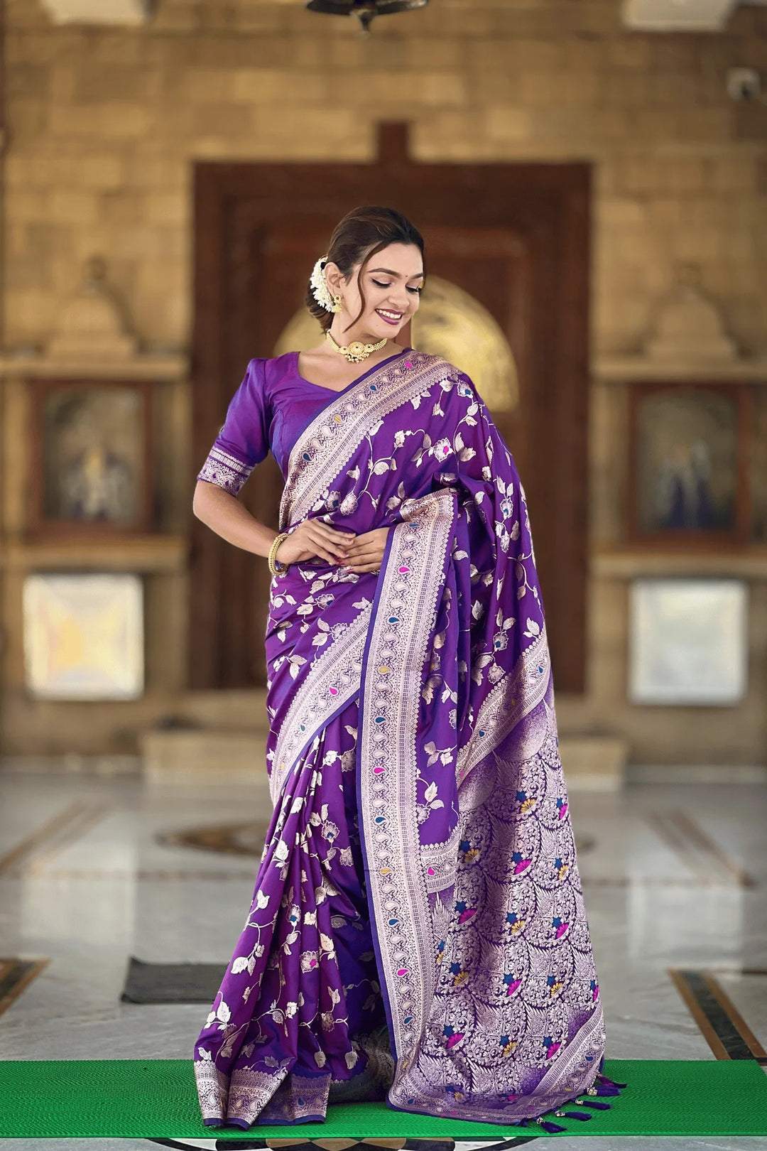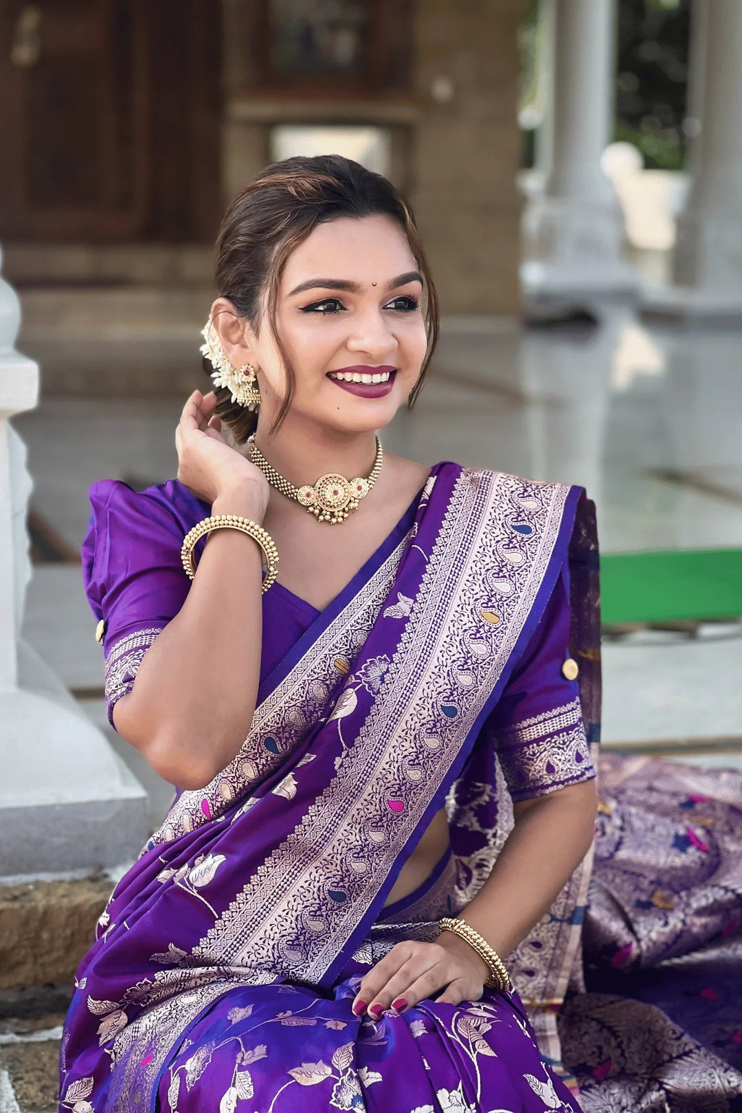 Introducing the Glamwiz Ready to Wear Purple Banarasi Silk Saree. Experience the perfect blend of tradition and convenience with the Glamwiz Ready-to-Wear Saree. The saree has vibrant geometrical border with sophisticated pattern, ideal for office wear and social gatherings.